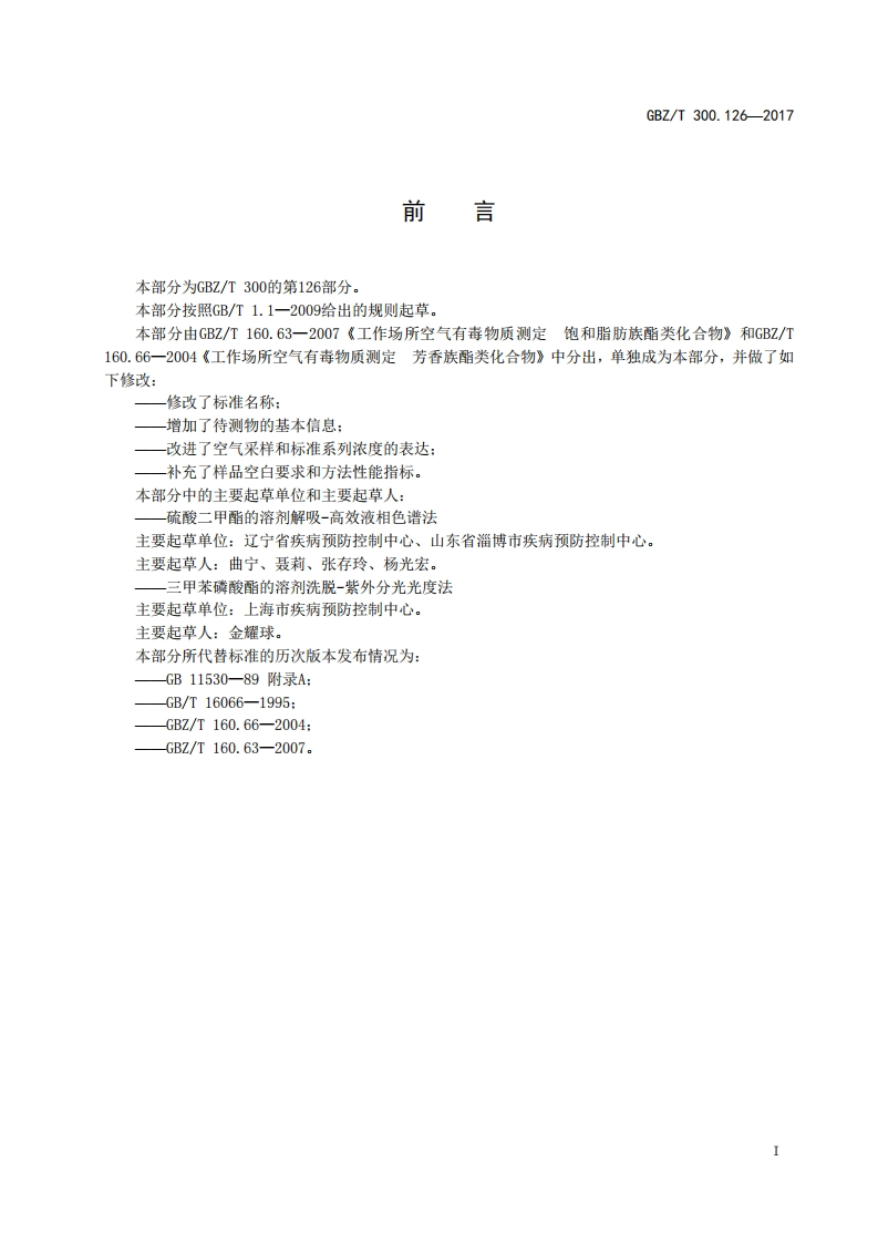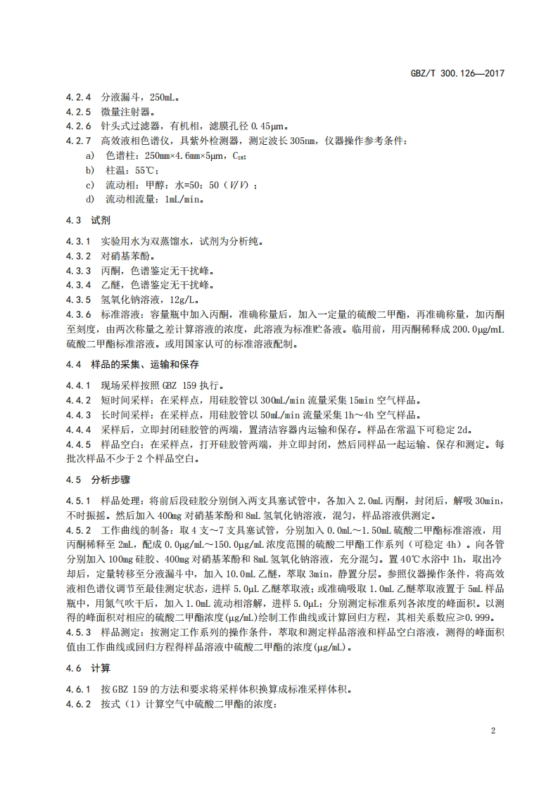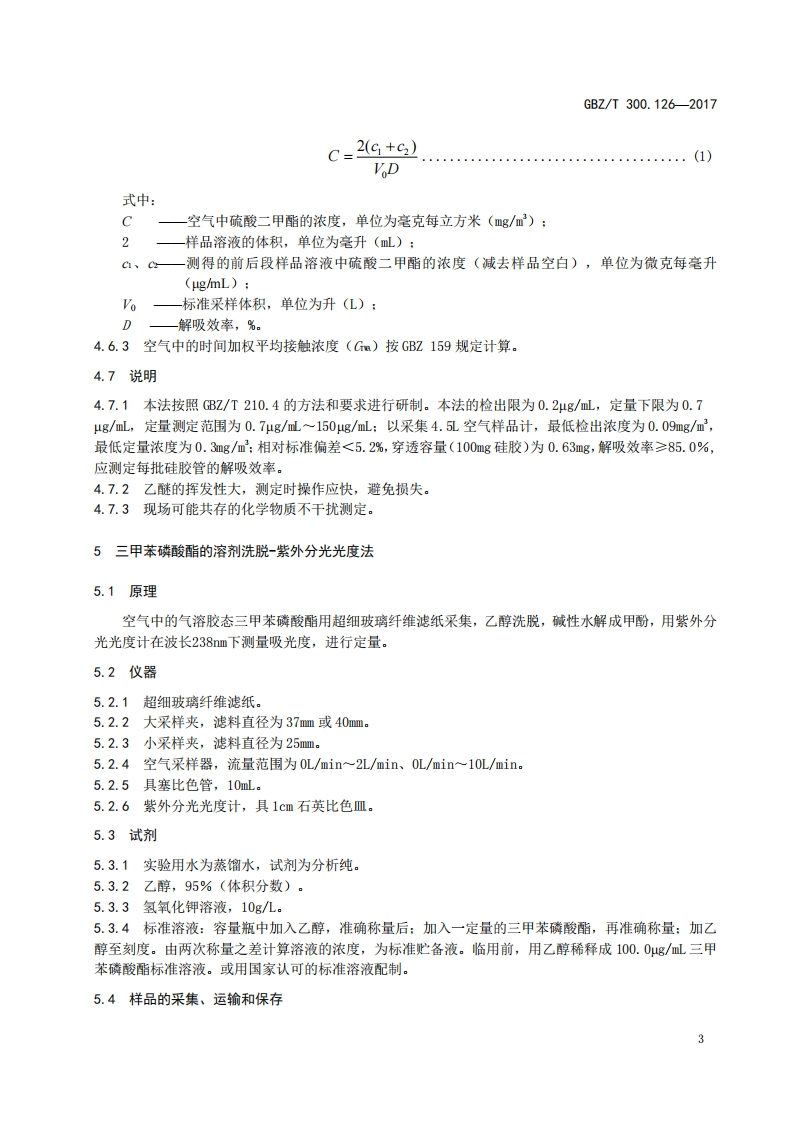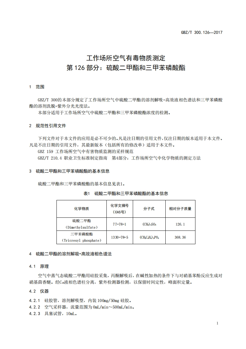 ICS13.100C52FEZ中华人民共和国国家职业卫生标准GBZ/T300.126-2017部分代替GBZ/T160.63一2007工作场所空气有毒物质测定第126部分:硫酸二甲酯和三甲苯磷酸酯Determination of toxic substances in workplace air-Part 126:Dimethyl sulfate and tricresyl phosphate2017-11-09发布2018-05-01实施中华人民共和国国家卫生和计划生育委员会发布