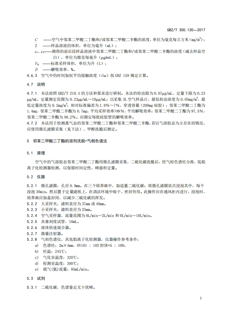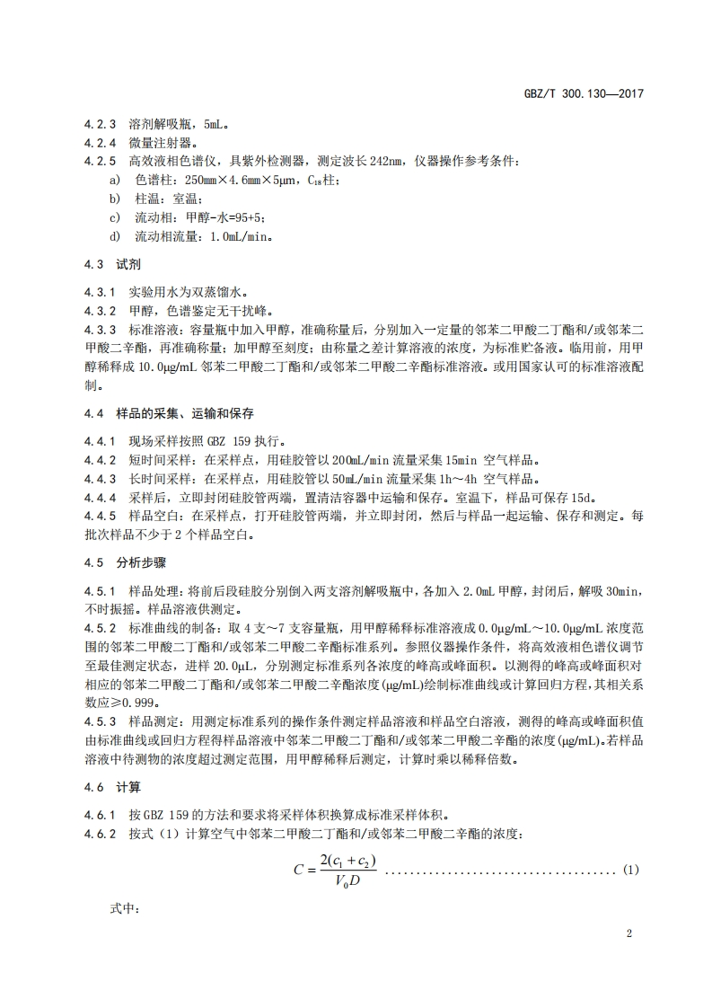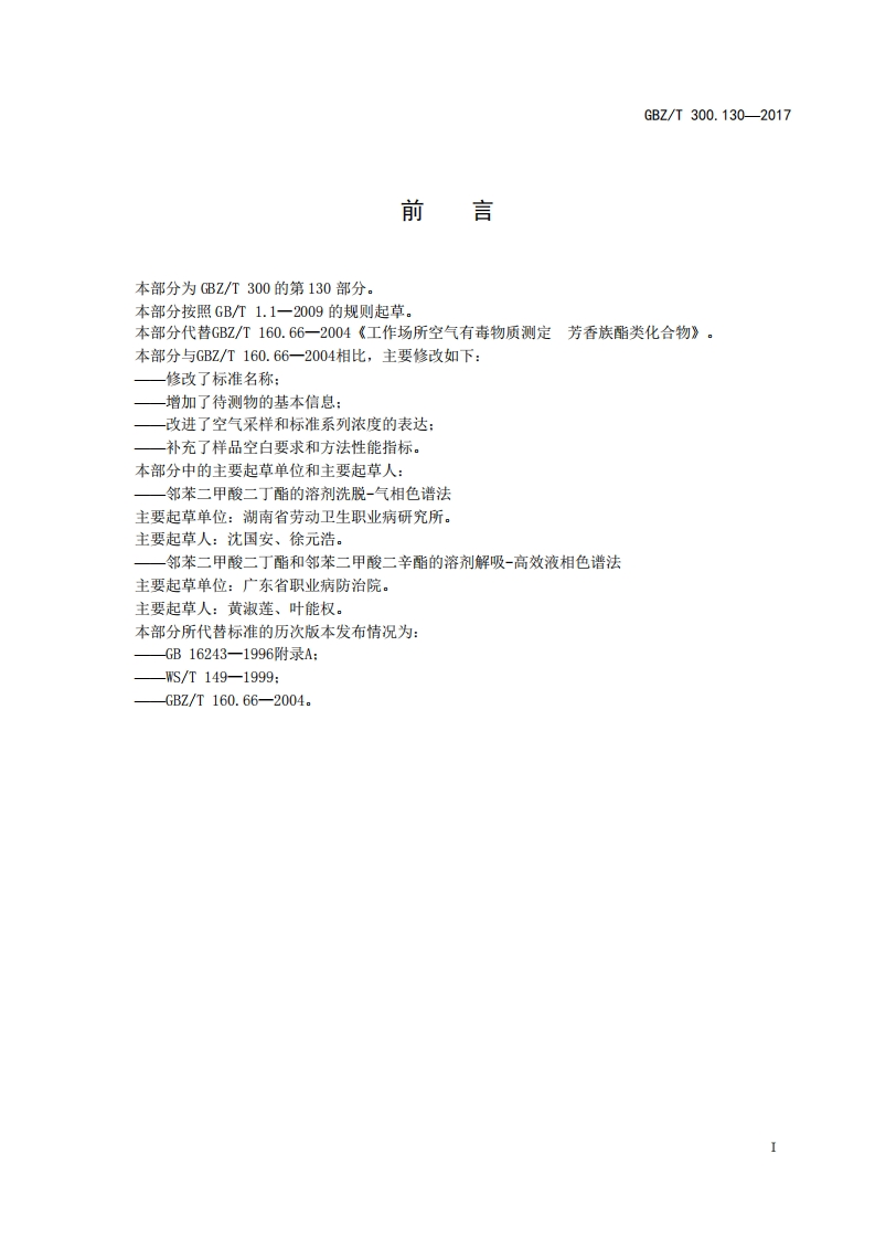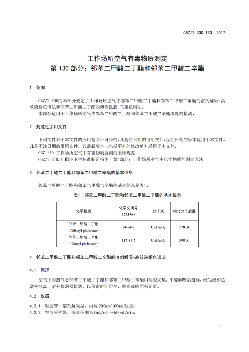 ICS13.100C52GBZ中华人民共和国国家职业卫生标准GBZ/T300.130-2017代替GBZ/T160.66一2004工作场所空气有毒物质测定第130部分:邻苯二甲酸二丁酯和邻苯二甲酸二辛酯Determination of toxic substances in workplace air-Part 130:Dibutyl phthalate and diotyl phthalate2017-11-09发布2018-05-01实施中华人民共和国国家卫生和计划生育委员会发布