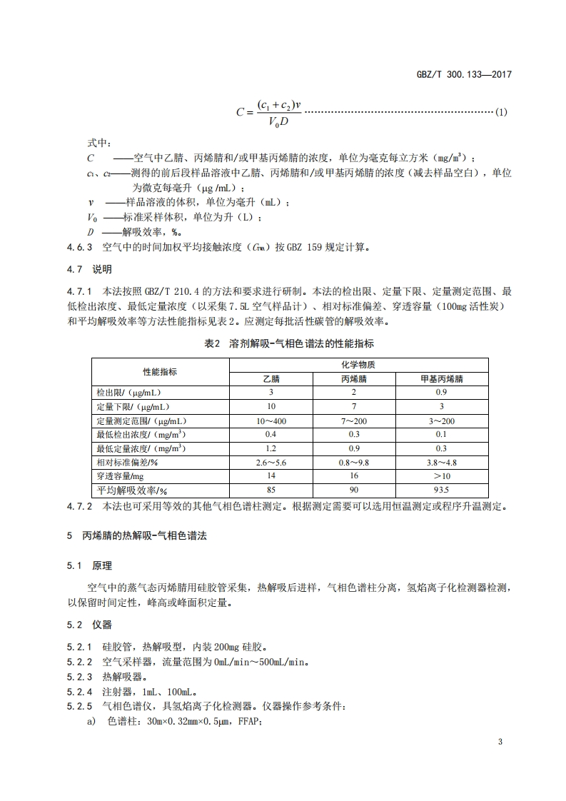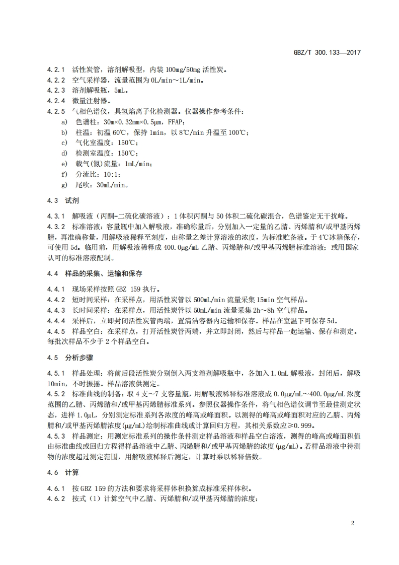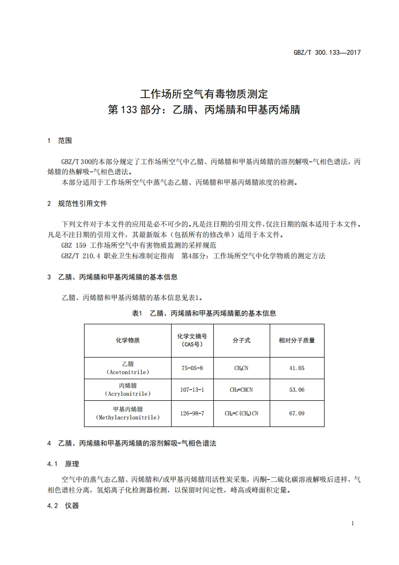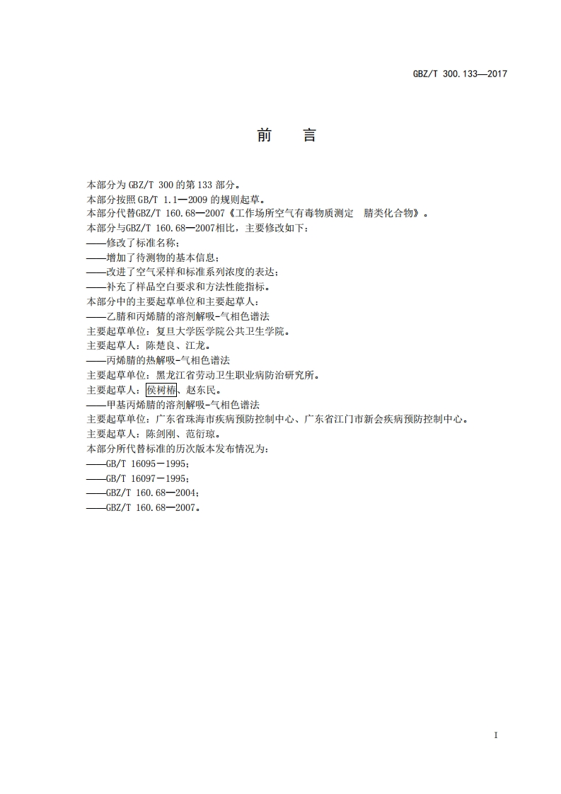ICS13.100C52GBZ中华人民共和国国家职业卫生标准GBZ/T300.133—2017部分代替GBZ/T160.68一2007工作场所空气有毒物质测定第133部分:乙腈、丙烯腈和甲基丙烯腈Determination of toxic substances in workplace air-Part 133:Acetonitrile,acrylonitrile and methylacrylonitrile2017-11-09发布2018-05-01实施中华人民共和国国家卫生和计划生育委员会发布