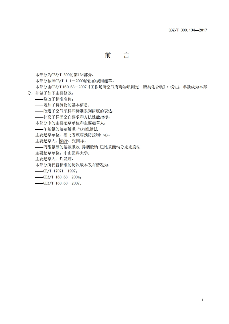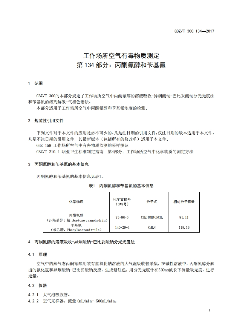 ICS13.100C52FEZ中华人民共和国国家职业卫生标准GBZ/T300.134-2017部分代替GBZ/T160.68一2007工作场所空气有毒物质测定第134部分:丙酮氰醇和苄基氰Determination of toxic substances in workplace air-Part 134:Acetone cyanohydrin and phenylacetonitri le2017-11-09发布2018-05-01实施中华人民共和国国家卫生和计划生育委员会发布