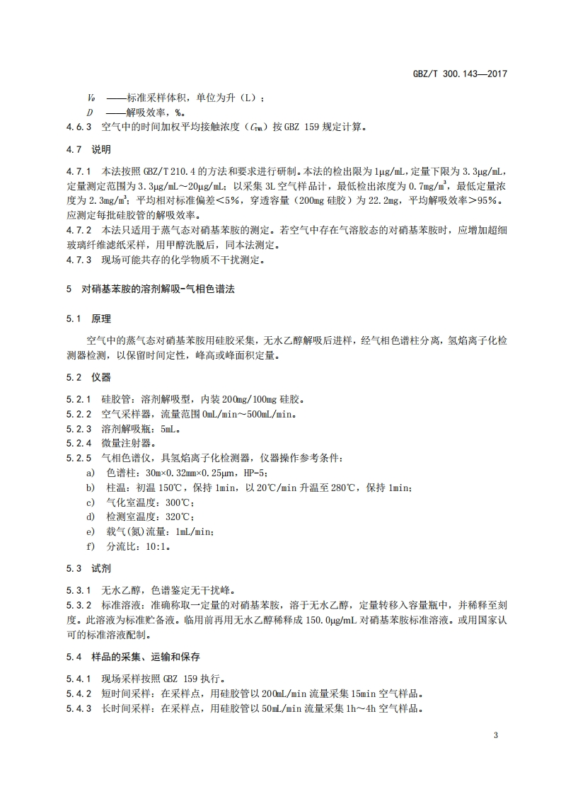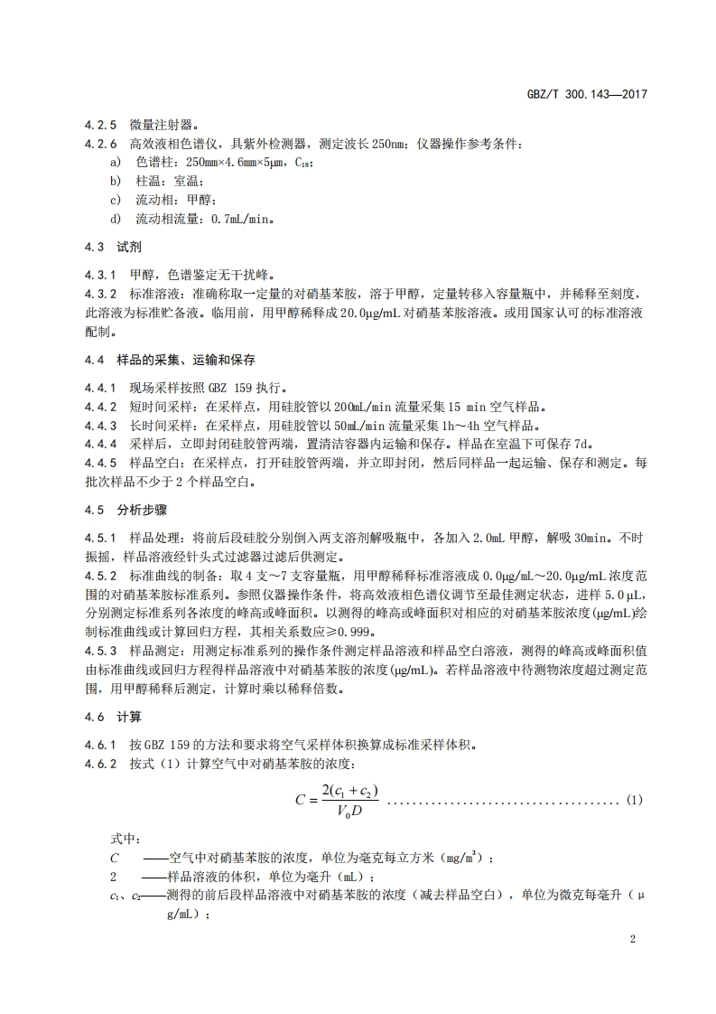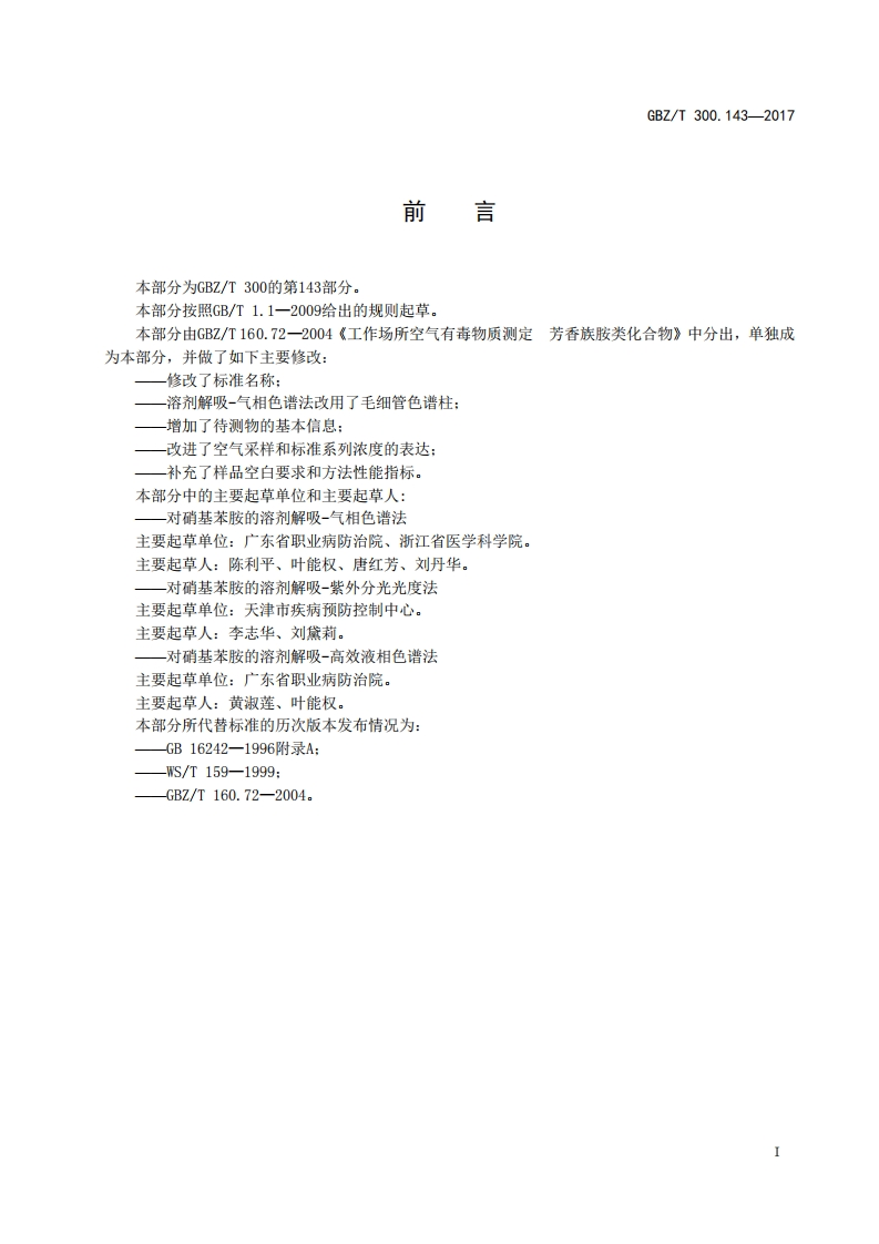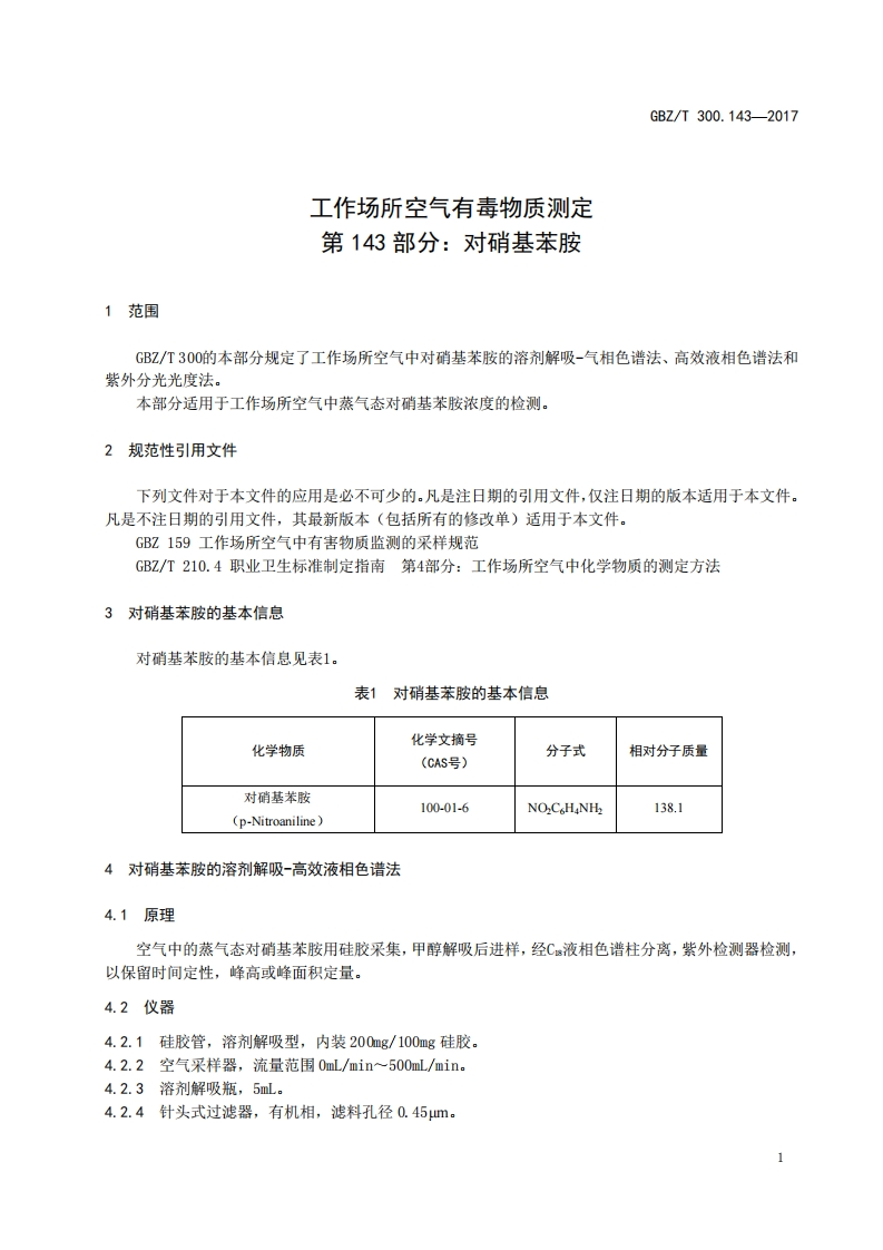 ICS13.100C52FEZ中华人民共和国国家职业卫生标准GBZ/T300.1432017部分代替GBZ/T160.72一2004工作场所空气有毒物质测定第143部分:对硝基苯胺Determination of toxic substances in workplace air-Part 143:p-Nitroani line2017-11-09发布2018-05-01实施中华人民共和国国家卫生和计划生育委员会发布