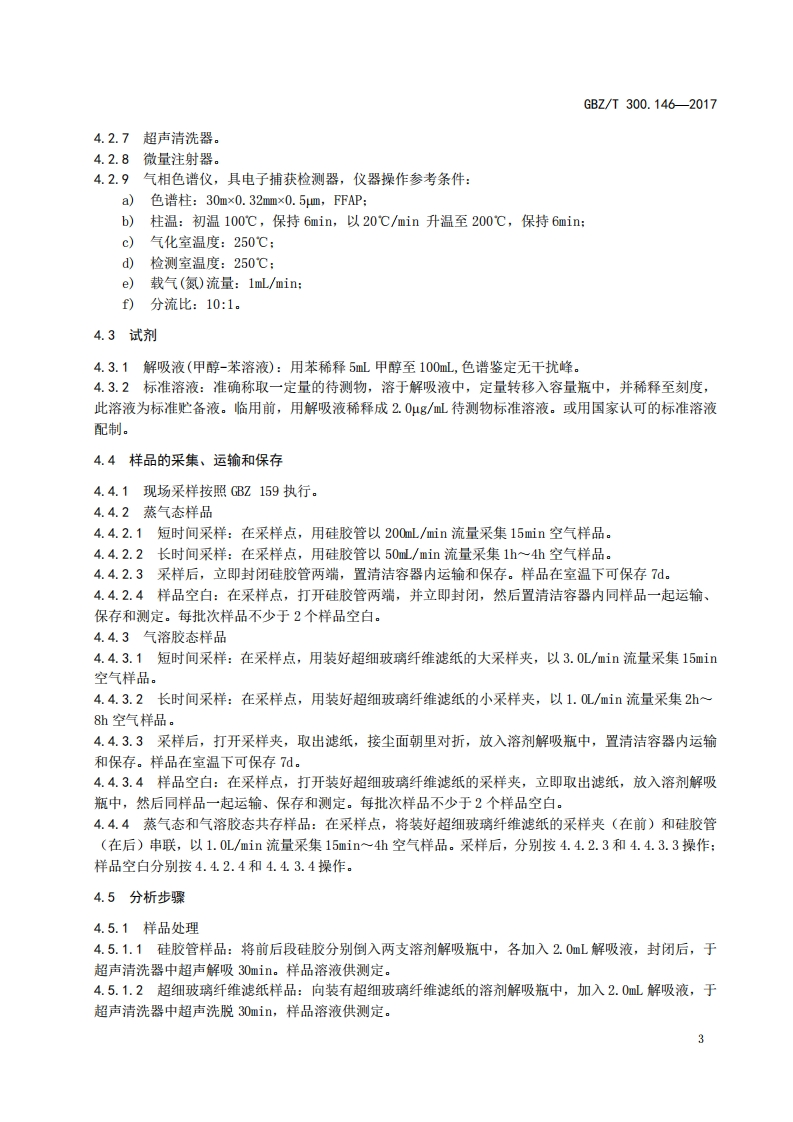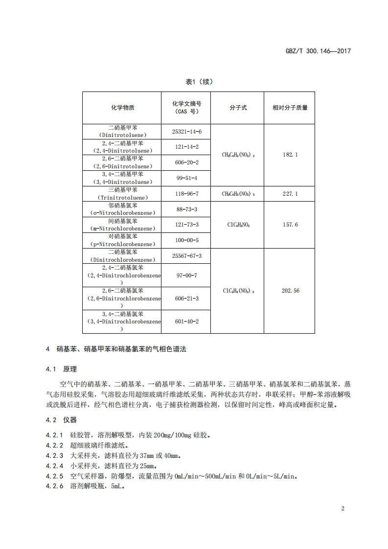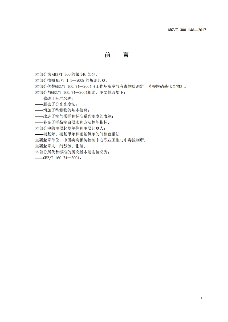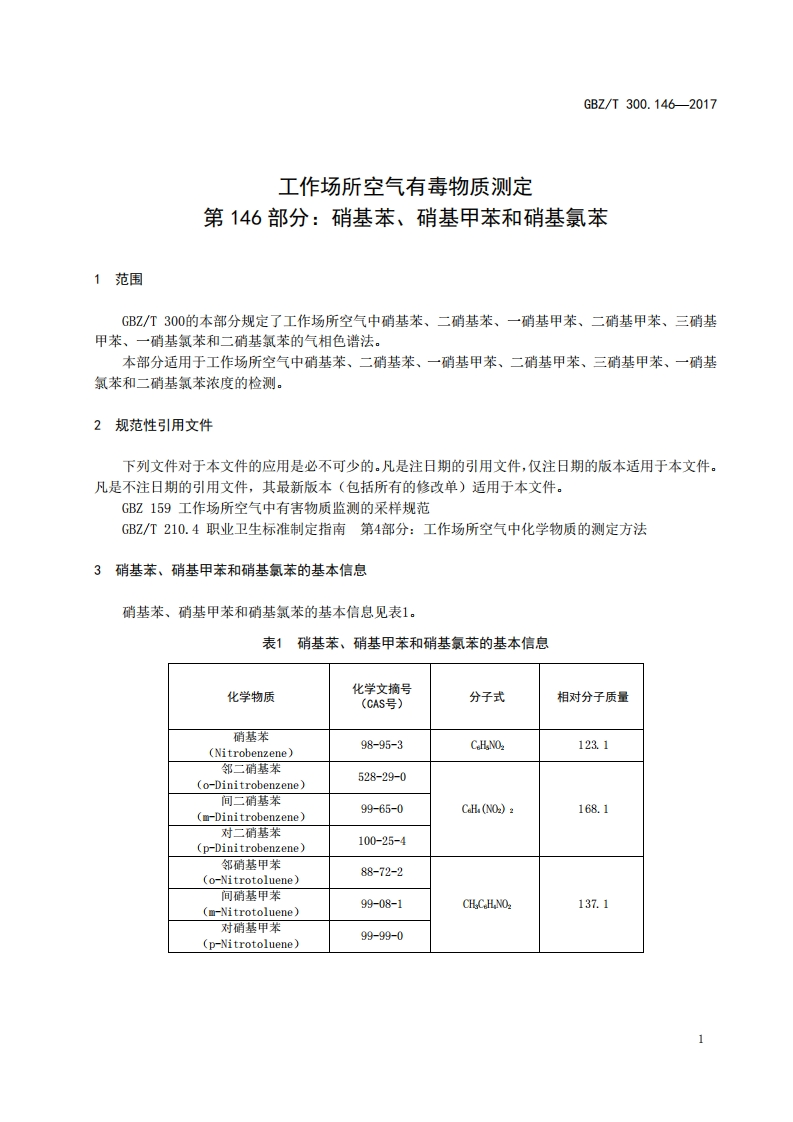 ICS13.100C52GBZ中华人民共和国国家职业卫生标准GBZ/T300.146-2017代替GBZ/T160.74一2004工作场所空气有毒物质测定第146部分:硝基苯、硝基甲苯和硝基氯苯Determination of toxic substances in workplace air-Part 146:Nitrobenzene,nitrotoluene and nitrochlorobenzene2017-11-09发布2018-05-01实施中华人民共和国国家卫生和计划生育委员会发布