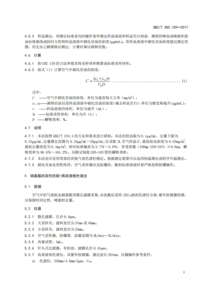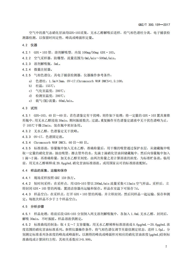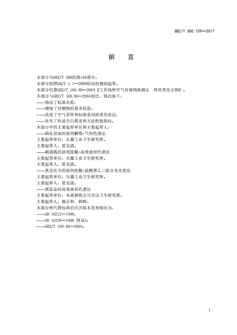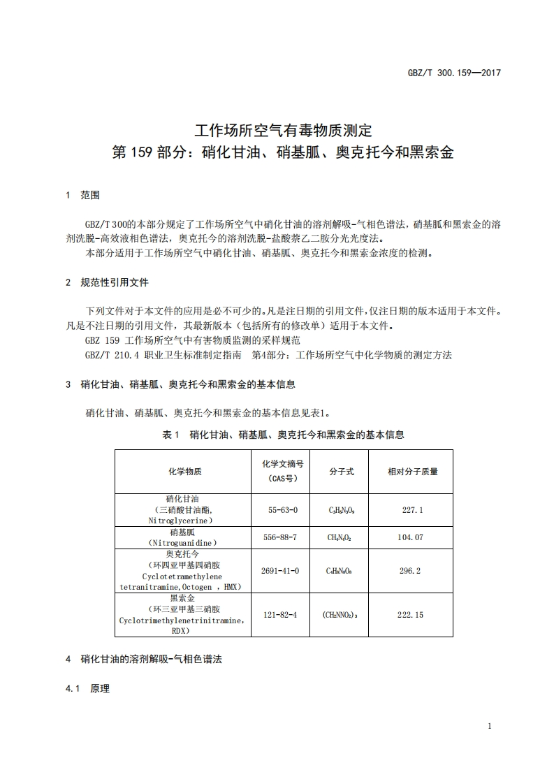 ICS13.100C52GBZ中华人民共和国国家职业卫生标准GBZT300.159-2017代替GBZ/T160.80一2004工作场所空气有毒物质测定第159部分:硝化甘油、硝基胍、奥克托今和黑索金Determination of toxic substances in workplace air-Part 159:Nitroglycerine,nitroglycerine,cyclotetramethylenetetranitramine and cyclotr imethylenetrinitramine2017-11-09发布2018-05-01实施中华人民共和国国家卫生和计划生育委员会发布