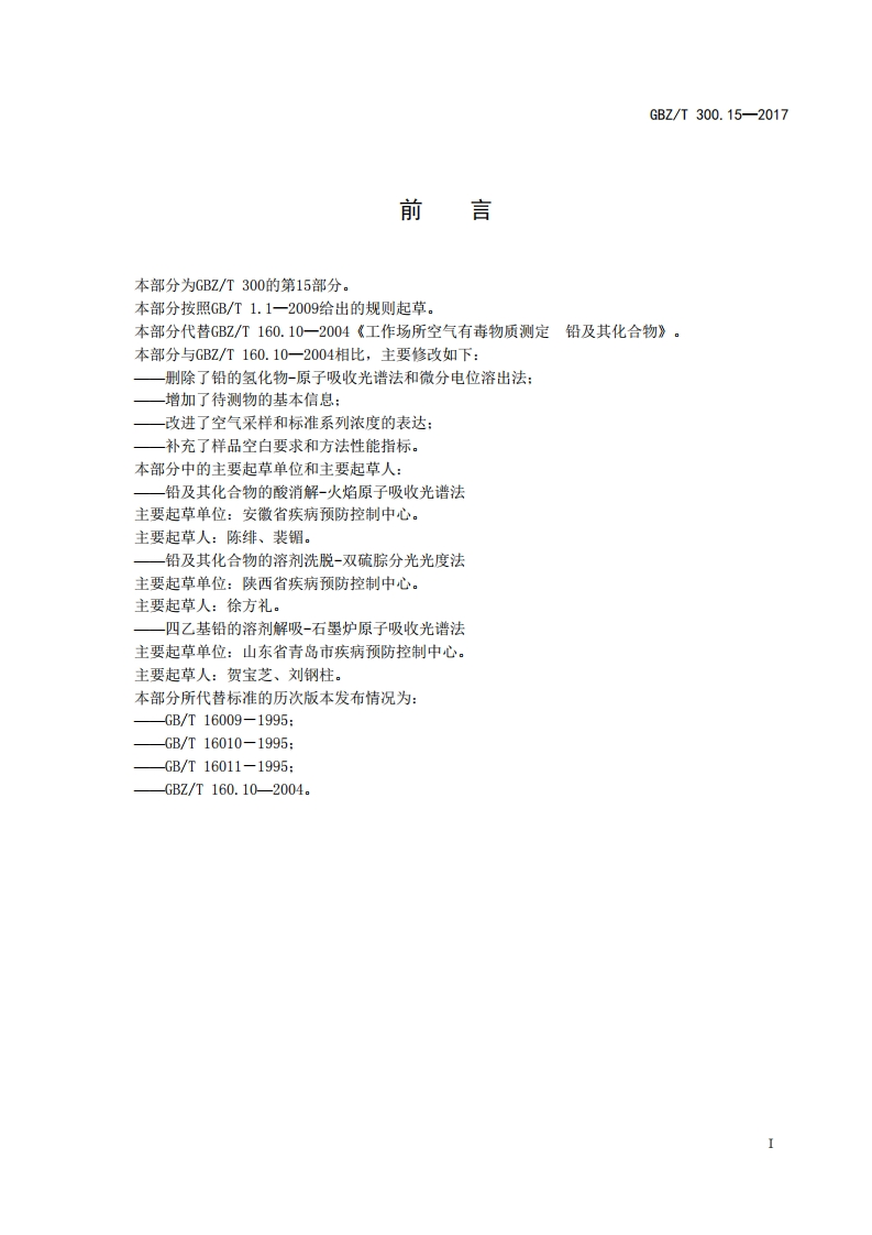 ICS13.100C52GBZ中华人民共和国国家职业卫生标准GBZ/T300.15—2017代替GBZ/T160.10一2004工作场所空气有毒物质测定第15部分:铅及其化合物Determination of toxic substances in workplace air-Part 15:Lead and its compounds2017-11-09发布2018-05-01实施中华人民共和国国家卫生和计划生育委员会发布