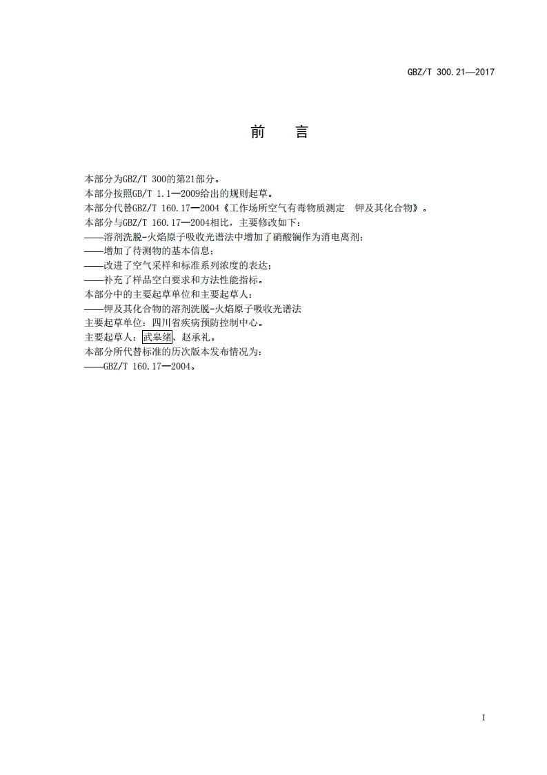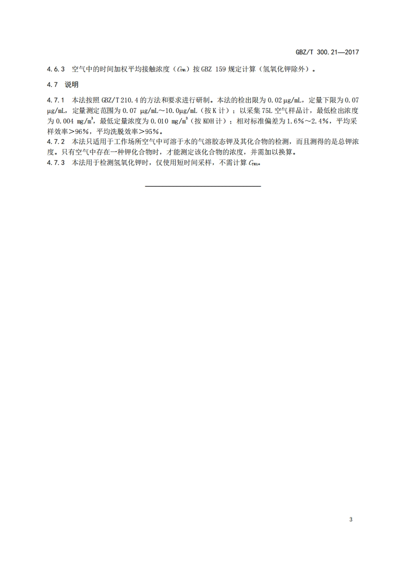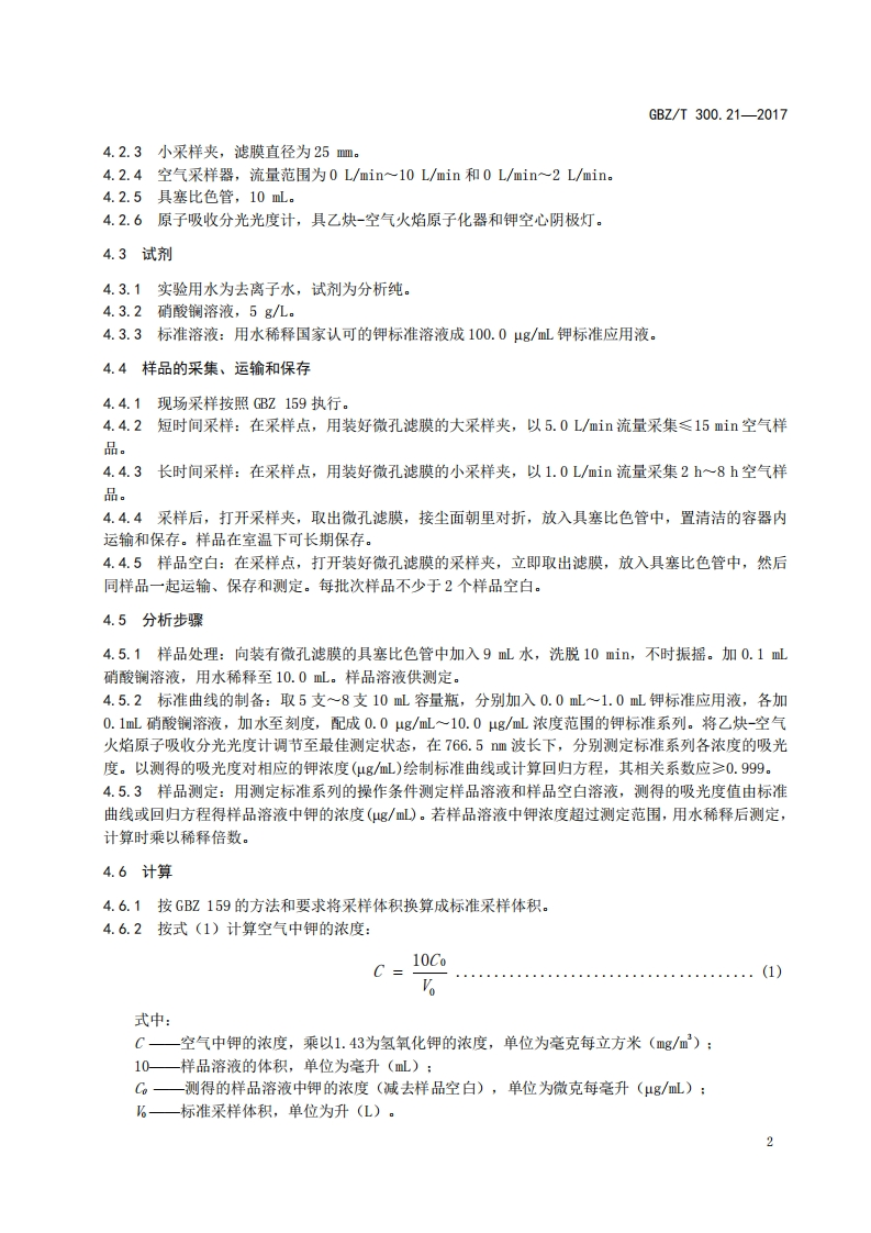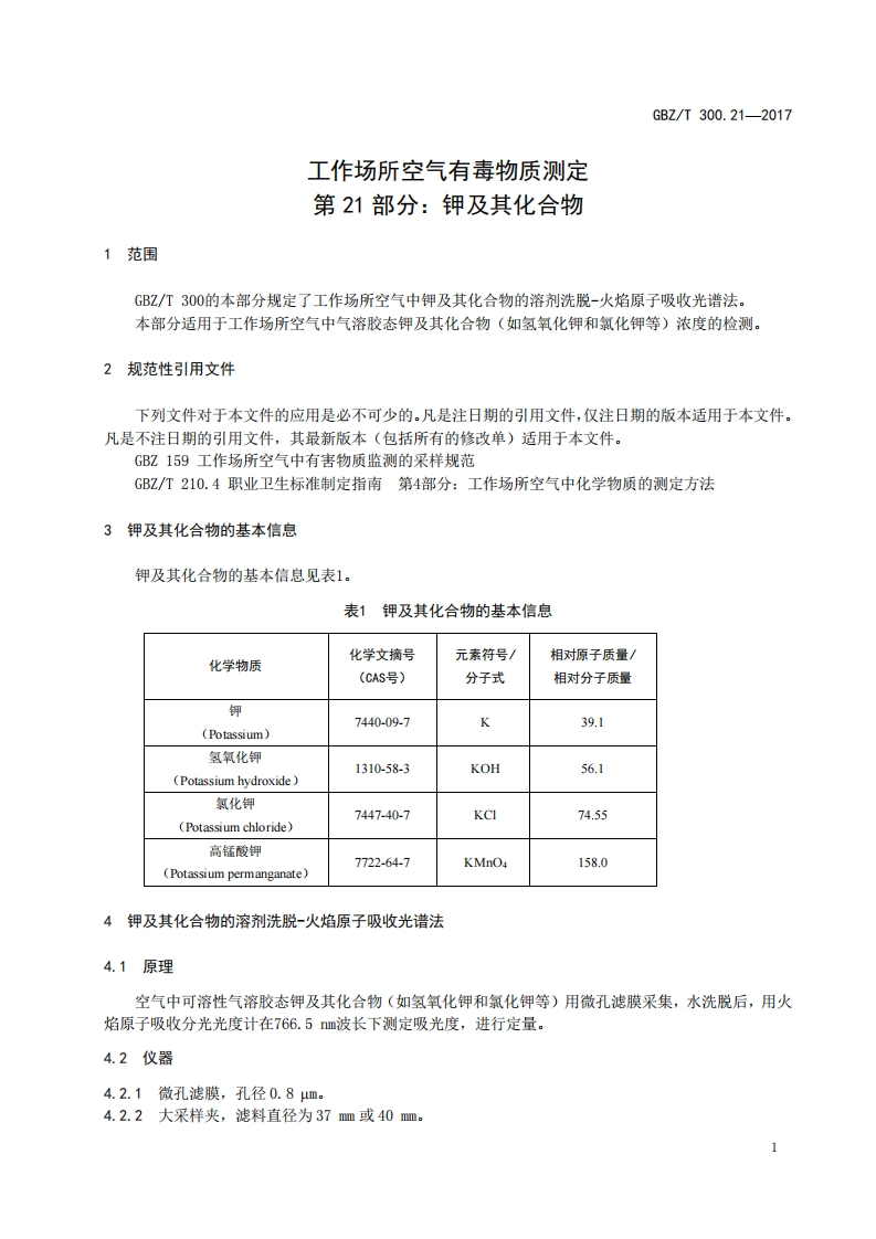 工作场所空气有毒物质测定第21部分_钾及其化合物Determinationoftoxicsubstancesinworkplaceair-Part21_Potassiumanditscompounds348072@abc9天前发布关注私信0.29MB5页047工作场所空气有毒物质测定第21部分_钾及其化合物Determinationoftoxicsubstancesinworkplaceair-Part21_Potassiumanditscompounds此内容为付费资源,请付费后查看¥13¥19黄金会员免费钻石会员免费立即购买您当前未登录!建议登陆后购买,可保存购买订单付费资源 第1页 / 共5页 第2页 / 共5页 第3页 / 共5页 第4页 / 共5页 第5页 / 共5页 已完成全部阅读,共5页 THE END标准规范 文本预览 ICS13.100C52FBZ中华人民共和国国家职业卫生标准GBZT300.21—2017代替GBZ/T160.17一2004工作场所空气有毒物质测定第21部分:钾及其化合物Determination of toxic substances in workplace air-Part 21:Potassium and its compounds2017-11-09发布2018-05-01实施中华人民共和国国家卫生和计划生育委员会发布 查看更多 收起部分 喜欢就支持一下吧收藏