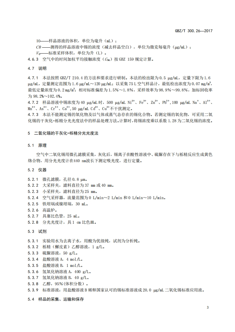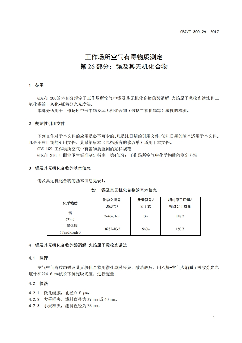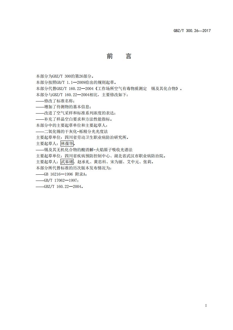 ICS13.100C52FBZ中华人民共和国国家职业卫生标准GBZ/T300.26-2017部分代替GBZ/T160.22一2004工作场所空气有毒物质测定第26部分:锡及其无机化合物Determination of toxic substances in workplace air-Part 26:Tin and its inorganic compounds2017-11-09发布2018-05-01实施中华人民共和国国家卫生和计划生育委员会发布