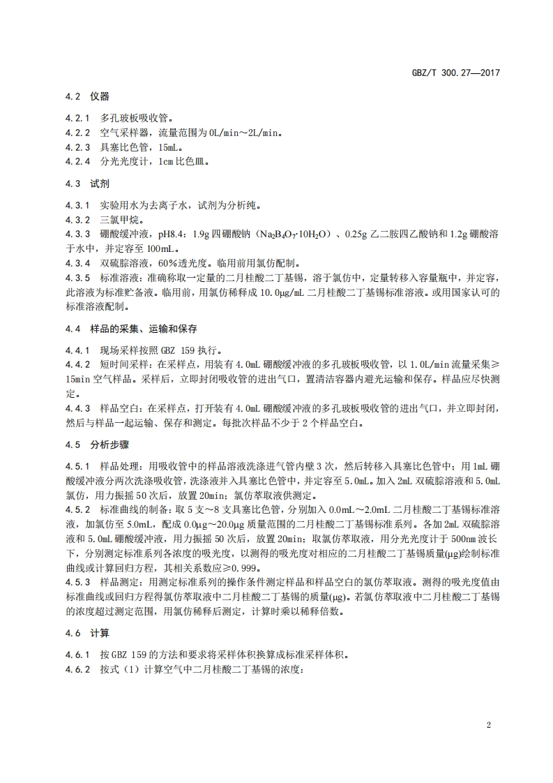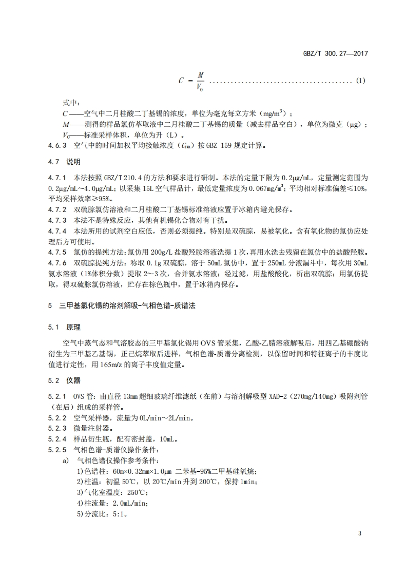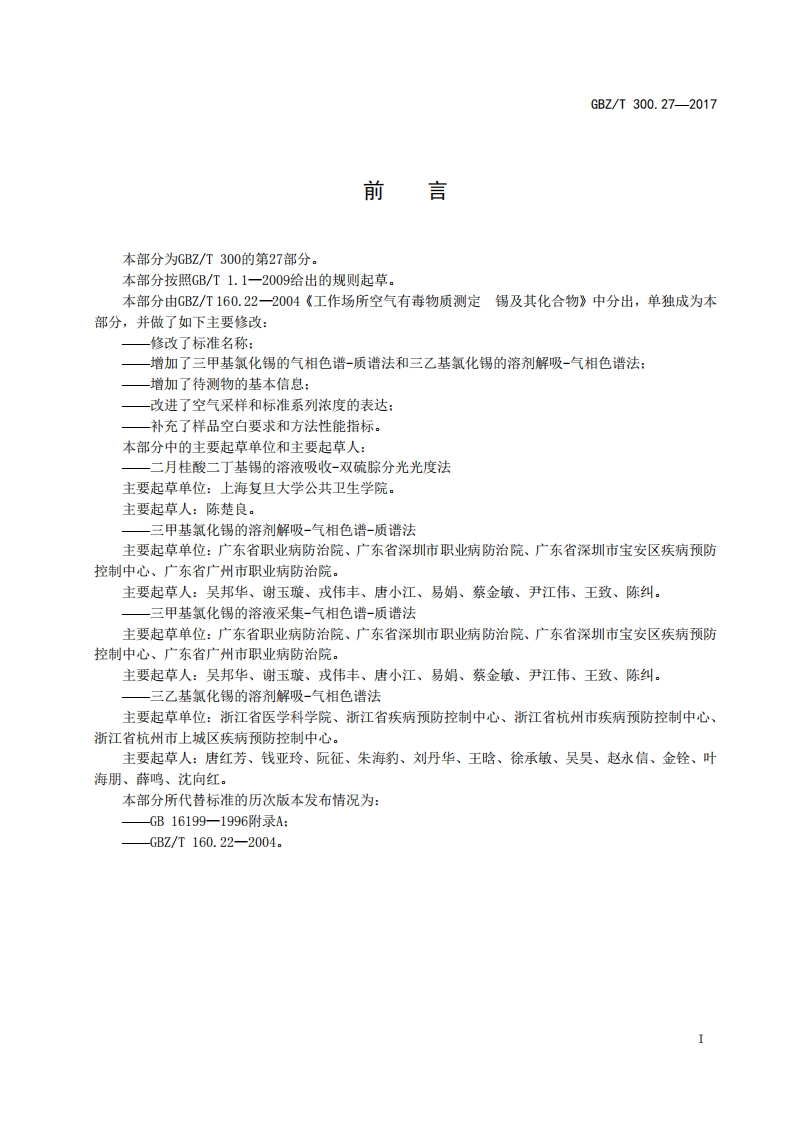 ICS13.100C52HBZ中华人民共和国国家职业卫生标准GBZT300.27-2017部分代替GBZ/T160.22一2004工作场所空气有毒物质测定第27部分:二月桂酸二丁基锡、三甲基氯化锡和三乙基氯化锡Determination of toxic substances in workplace air-Part 27:Dibutyltin dilaurate,trimethyltin chloride and triethyltinchl oride2017-11-09发布2018-05-01实施中华人民共和国国家卫生和计划生育委员会发布