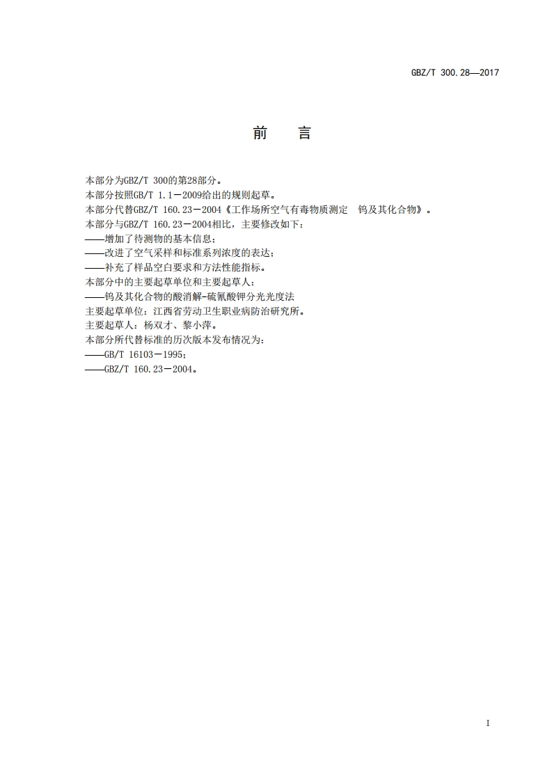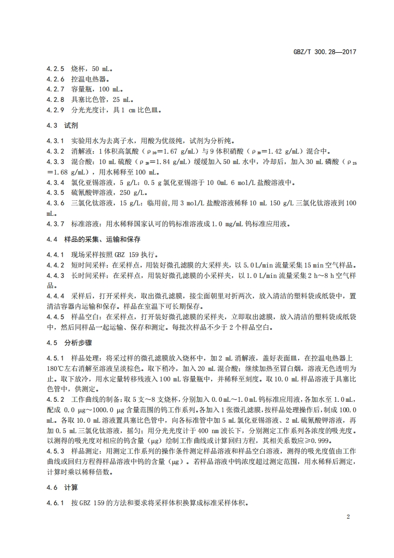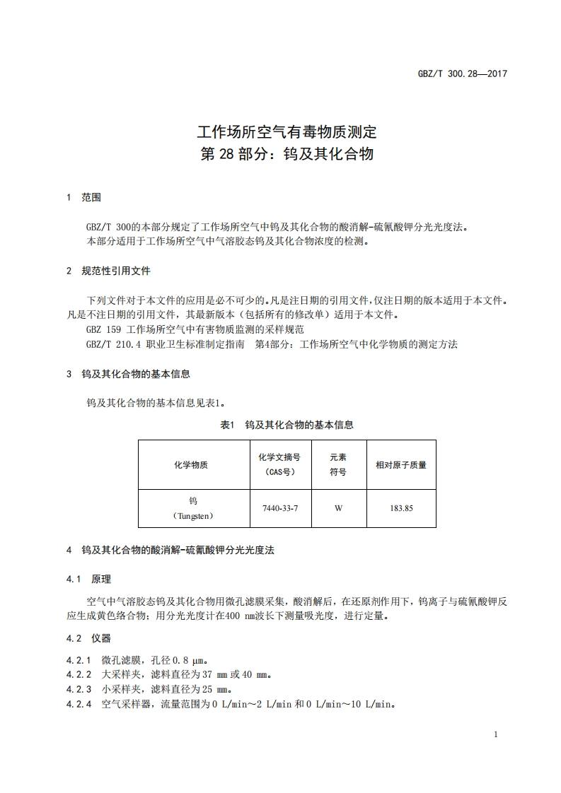 工作场所空气有毒物质测定第28部分_钨及其化合物Determinationoftoxicsubstancesinworkplaceair-Part28_Tungstenanditscompounds348072@abc9天前发布关注私信0.36MB5页020工作场所空气有毒物质测定第28部分_钨及其化合物Determinationoftoxicsubstancesinworkplaceair-Part28_Tungstenanditscompounds此内容为付费资源,请付费后查看¥13¥19黄金会员免费钻石会员免费立即购买您当前未登录!建议登陆后购买,可保存购买订单付费资源 第1页 / 共5页 第2页 / 共5页 第3页 / 共5页 第4页 / 共5页 第5页 / 共5页 已完成全部阅读,共5页 THE END标准规范 文本预览 ICS13.100C52FBZ中华人民共和国国家职业卫生标准GBZT300.28—2017代替GBZ/T160.23一2004工作场所空气有毒物质测定第28部分:钨及其化合物Determination of toxic substances in workplace air-Part 28:Tungsten and its compounds2017-11-09发布2018-05-01实施中华人民共和国国家卫生和计划生育委员会发布 查看更多 收起部分 喜欢就支持一下吧收藏