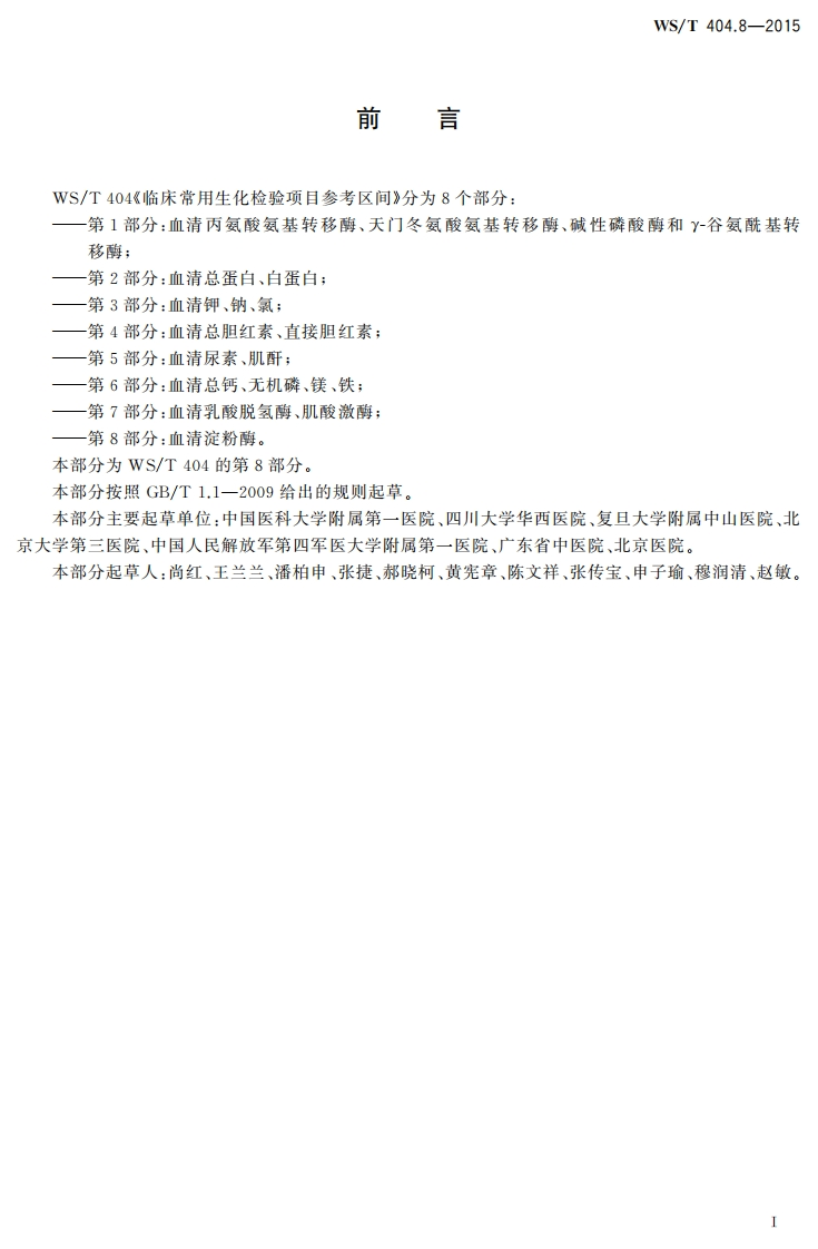 WST402-2012临床实验室检验项目参考区间的制定348072@abc2个月前发布关注私信0.33MB8页03111WST402-2012临床实验室检验项目参考区间的制定此内容为付费资源,请付费后查看¥17¥32黄金会员免费钻石会员免费立即购买您当前未登录!建议登陆后购买,可保存购买订单付费资源 第1页 / 共8页 第2页 / 共8页 试读已结束,还剩6页,您可下载完整版后进行离线阅读 © 版权声明文章版权归作者所有,未经允许请勿转载。THE END标准规范 文本预览 1CS11.100C50WS中华人民共和国卫生行业标准WS/T404.8-2015临床常用生化检验项目参考区间第8部分:血清淀粉酶Reference intervals for common clinical biochemistry tests-Part 8:Serum amylase2015-04-21发布2015-10-01实施中华人民共和国国家卫生和计划生育委员会发布 查看更多 收起部分 喜欢就支持一下吧点赞11 分享QQ空间微博QQ好友海报分享复制链接收藏