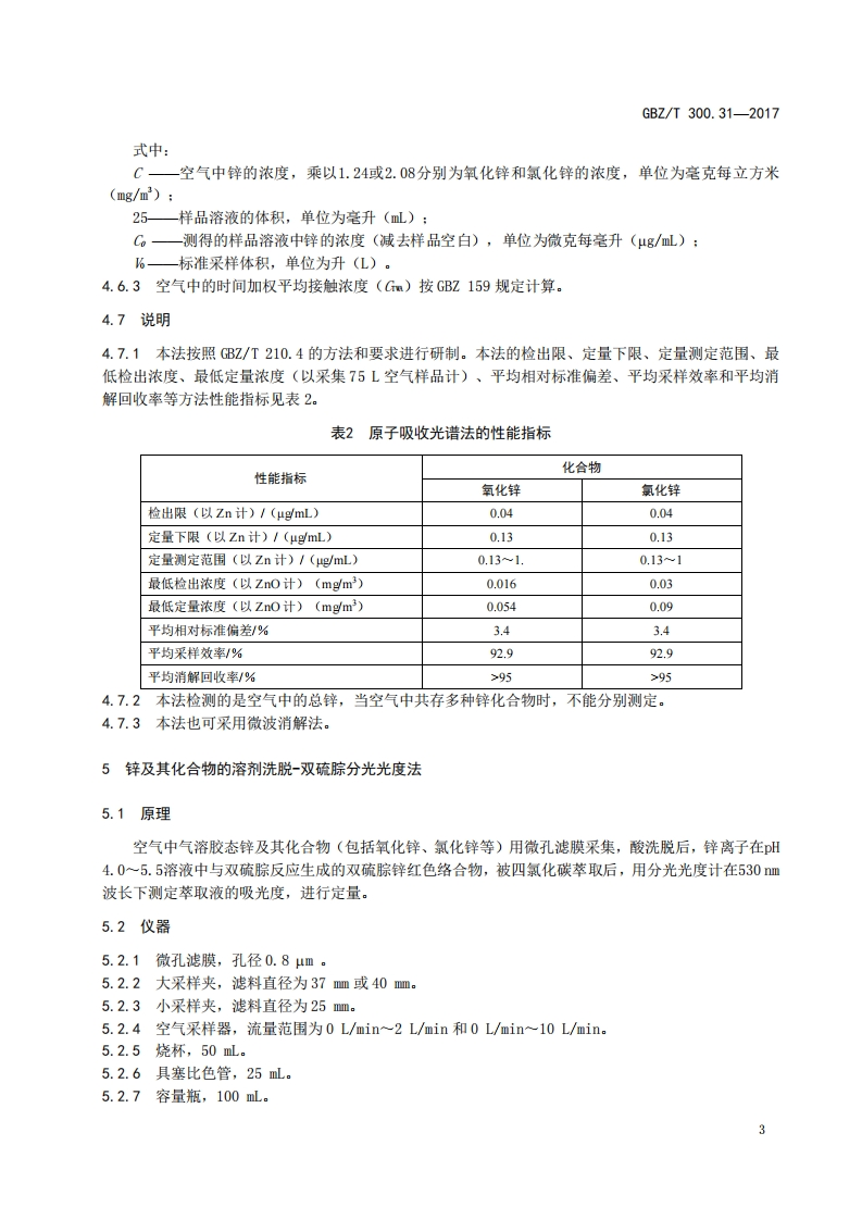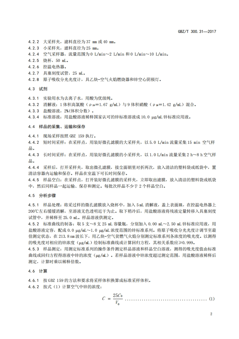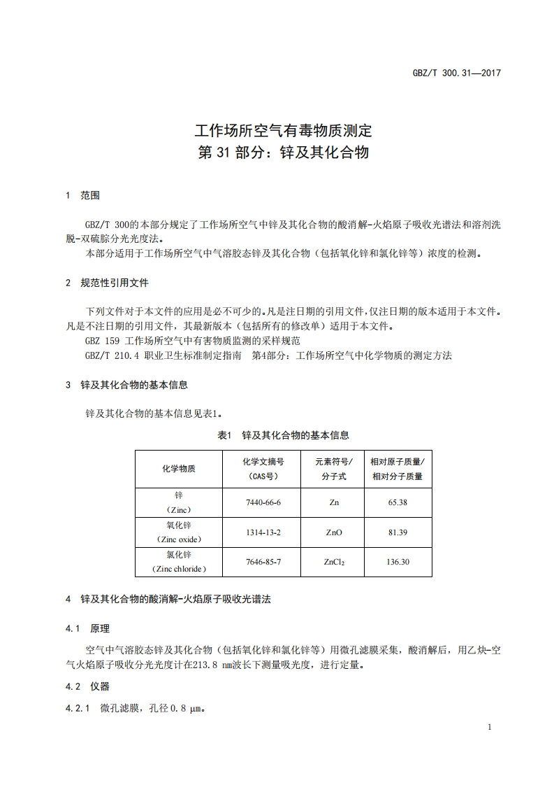 ICS13.100C52FEZ中华人民共和国国家职业卫生标准GBZ/T300.31—2017代替GBZ/T160.25一2004工作场所空气有毒物质测定第31部分:锌及其化合物Determination of toxic substances in workplace air-Part 31:Zinc and its compounds2017-11-09发布2018-05-01实施中华人民共和国国家卫生和计划生育委员会发布