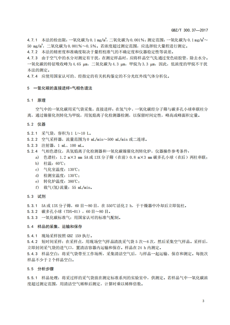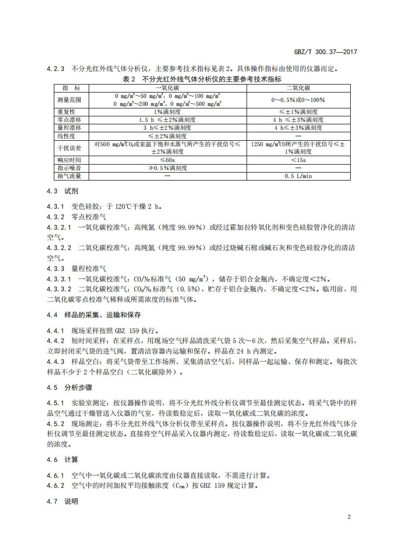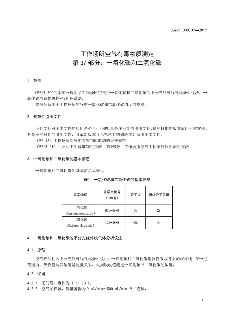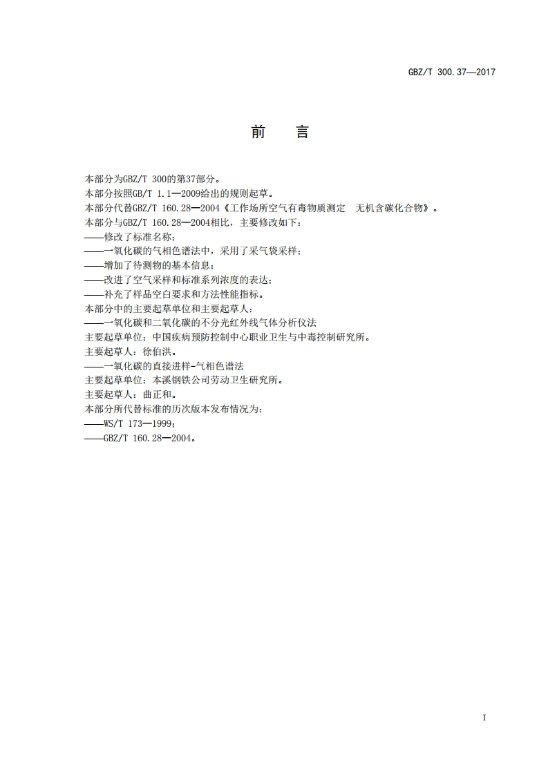 ICS13.100C52FEZ中华人民共和国国家职业卫生标准GBZ/T300.37-2017代替GBZ/T160.28一2004工作场所空气有毒物质测定第37部分:一氧化碳和二氧化碳Determination of toxic substances in workplace air-Part 37:Carbon monoxide and carbon dioxide2017-11-09发布2018-05-01实施中华人民共和国国家卫生和计划生育委员会发布