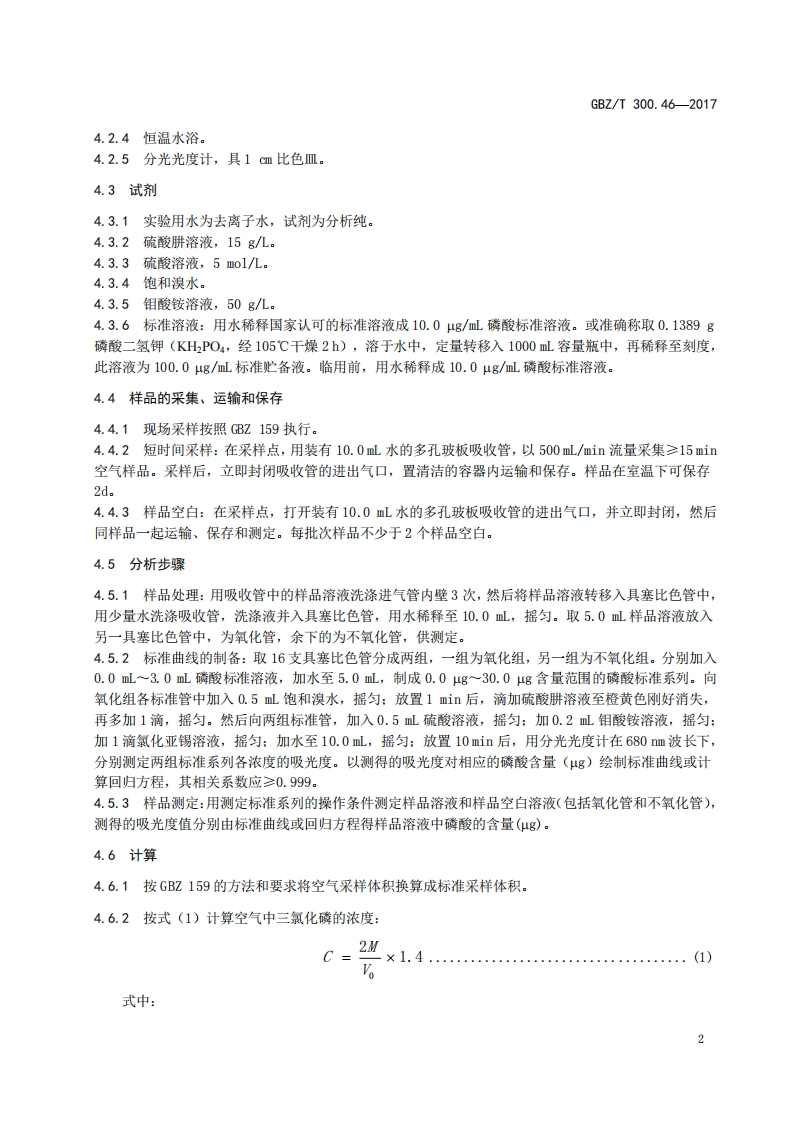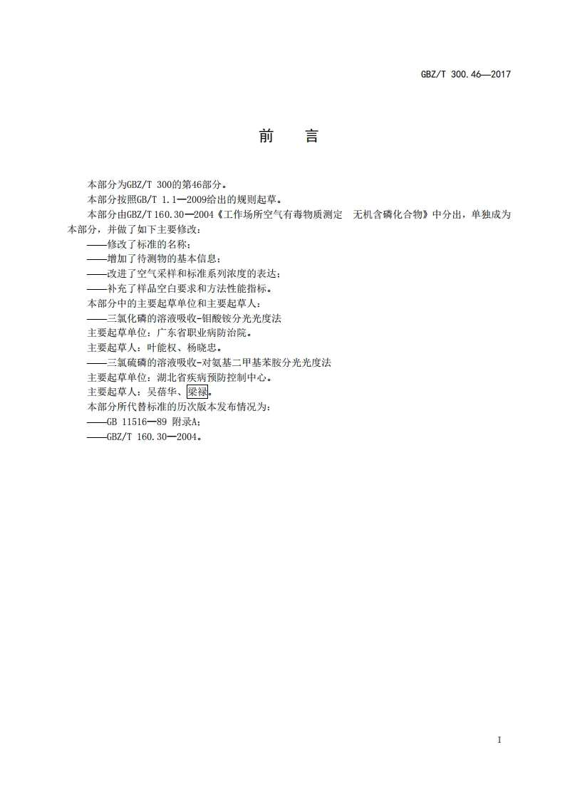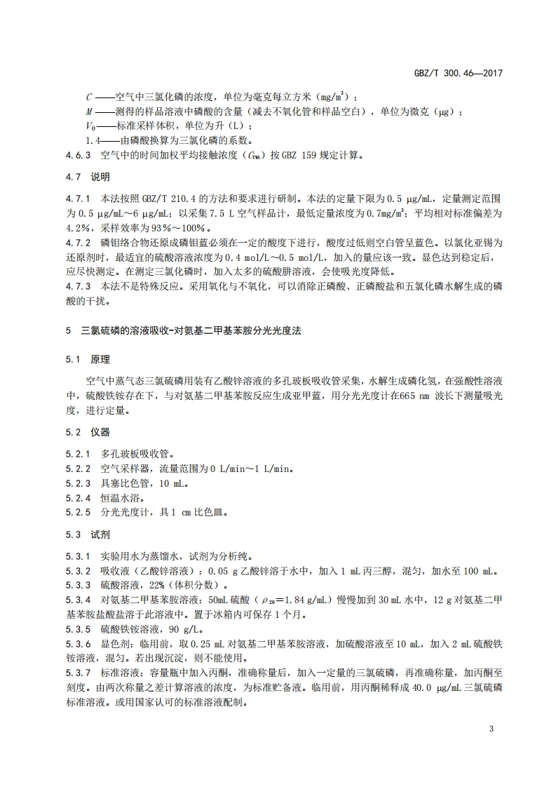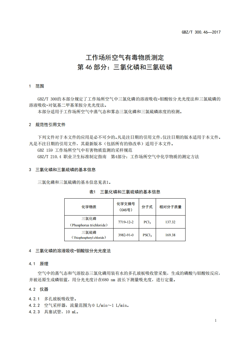 ICS13.100C52FBZ中华人民共和国国家职业卫生标准GBZ/T300.46-2017部分代替GBZ/T160.30一2004工作场所空气有毒物质测定第46部分:三氯化磷和三氯硫磷Determination of toxic substances in workplace air-Part 46:Phosphorus trichloride2017-11-09发布2018-05-01实施中华人民共和国国家卫生和计划生育委员会发布