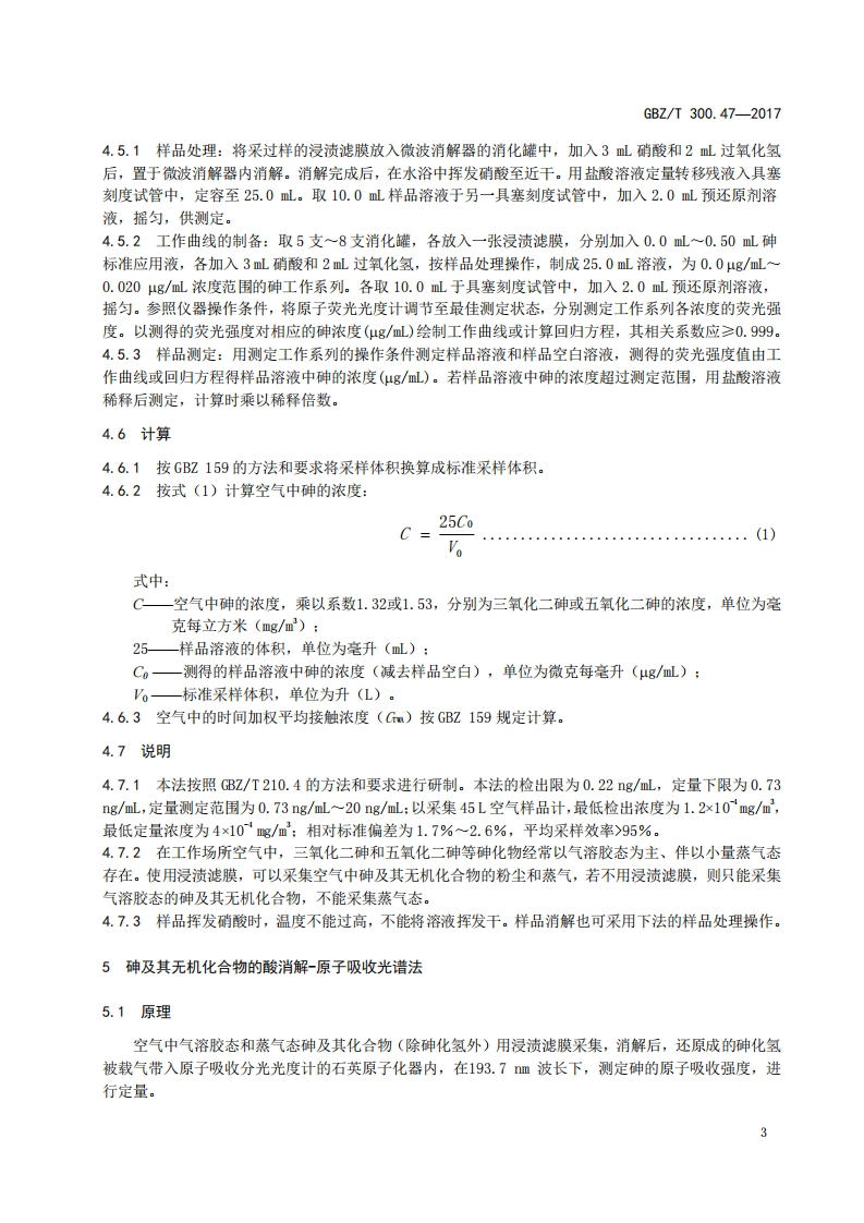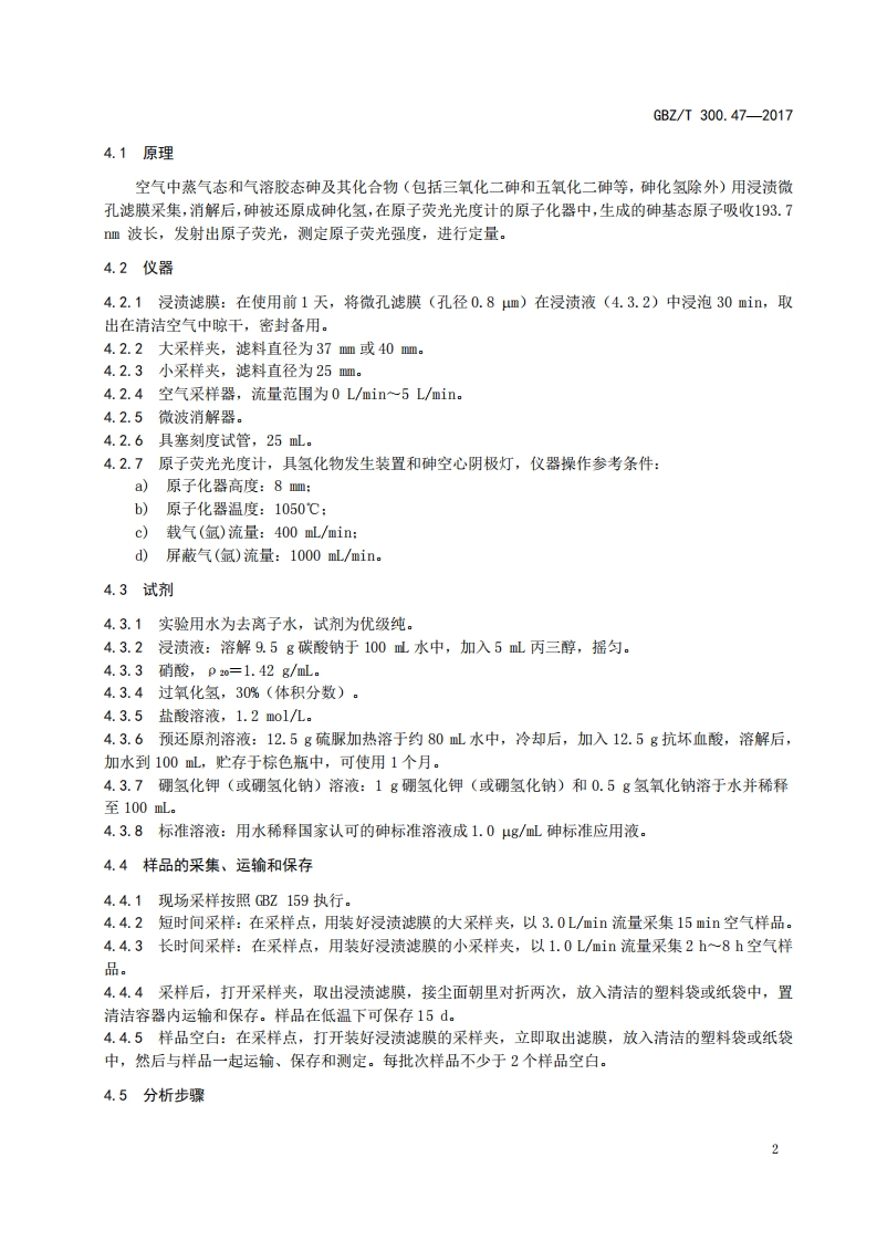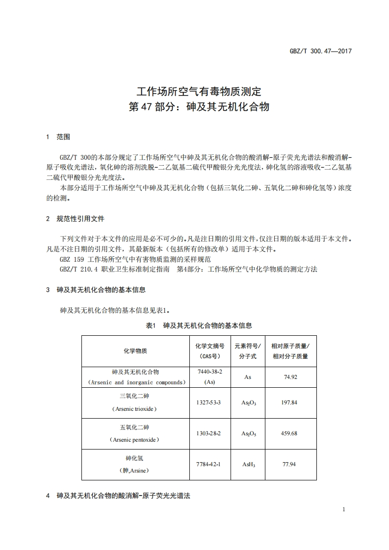 ICS13.100C52GBZ中华人民共和国国家职业卫生标准GBZT300.47-2017代替GBZ/T160.31一2004工作场所空气有毒物质测定第47部分:砷及其无机化合物Determination of toxic substances in workplace air-Part 47:Arsenic and its inorganic compounds2017-11-09发布2018-05-01实施中华人民共和国国家卫生和计划生育委员会发布
