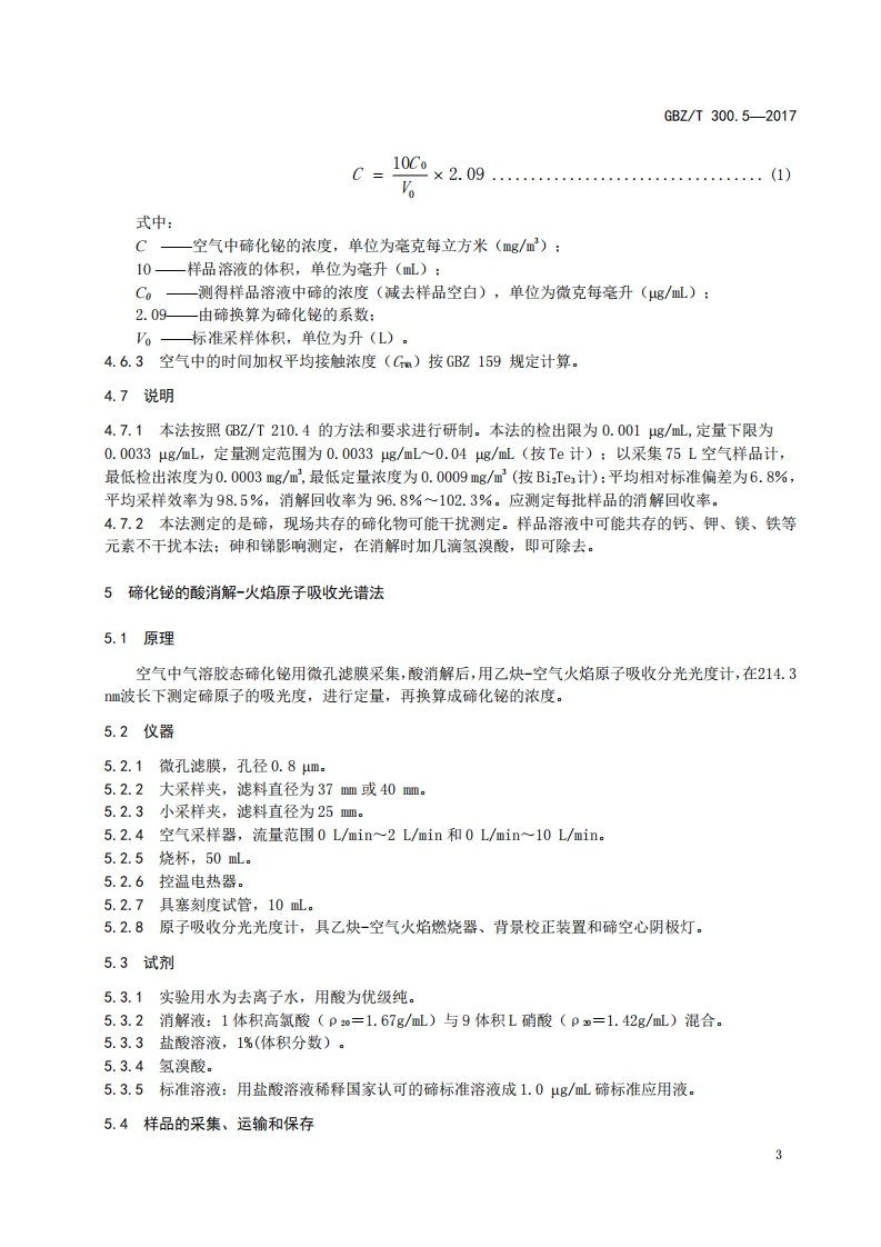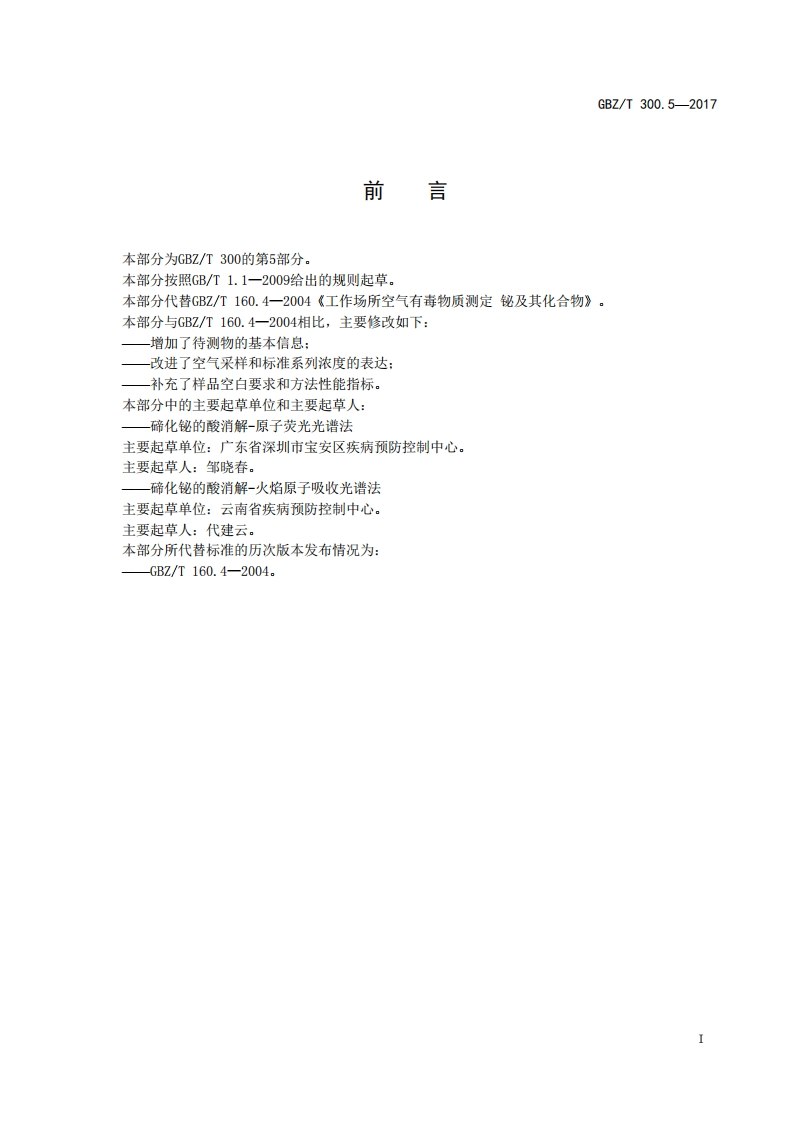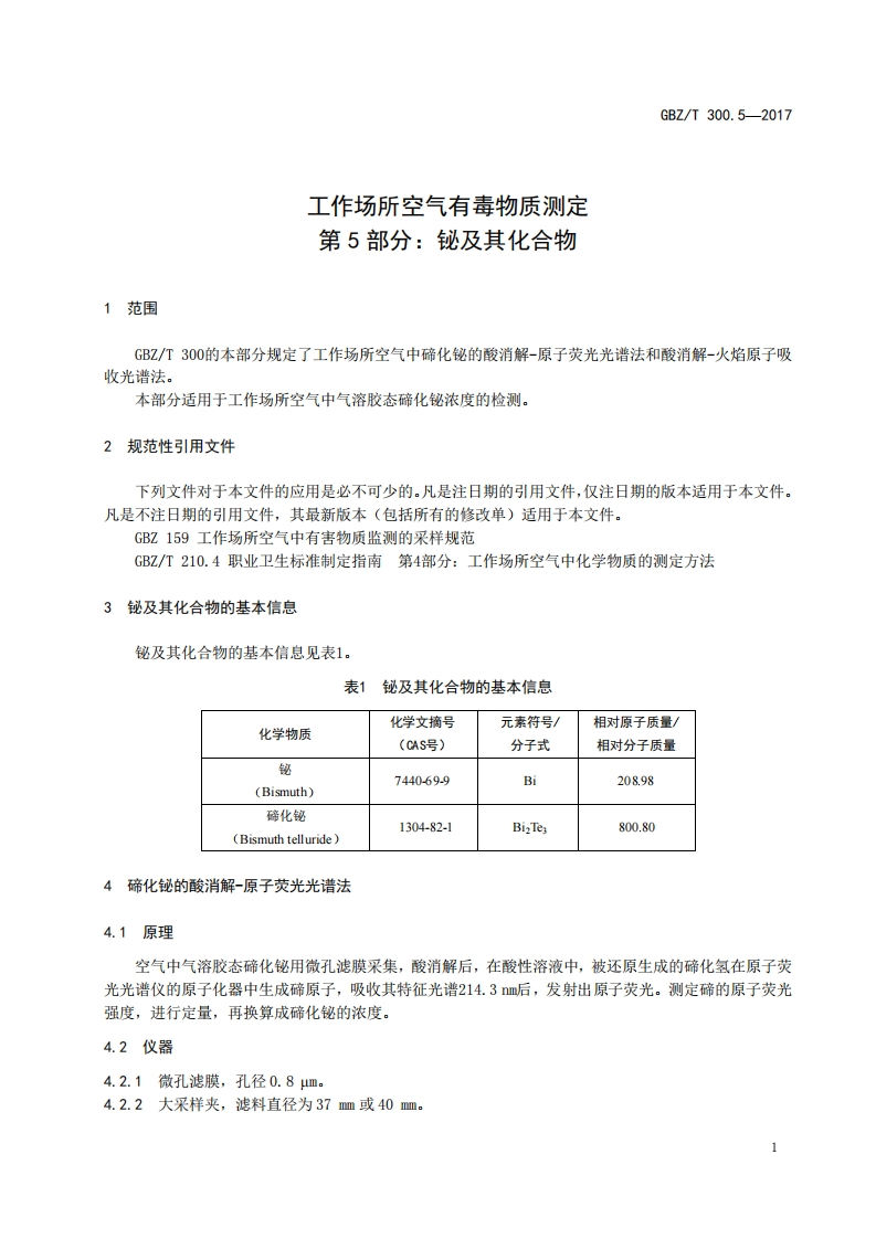 ICS13.100C52FBZ中华人民共和国国家职业卫生标准GBZT300.5-2017代替GB2/T160.4一2004工作场所空气有毒物质测定第5部分:铋及其化合物Determination of toxic substances in workplace air-Part 5:Bismuth and its compounds2017-11-09发布2018-05-01实施中华人民共和国国家卫生和计划生育委员会发布