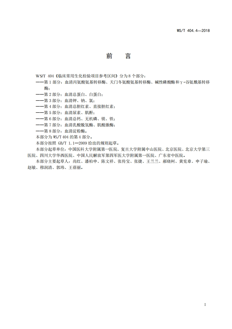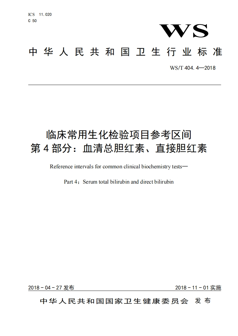 ICS11.020C50中华人民共和国卫生行业标准WS/T404.4-2018临床常用生化检验项目参考区间第4部分:血清总胆红素、直接胆红素Reference intervals for common clinical biochemistry tests-Part 4:Serum total bilirubin and direct bilirubin2018-04-27发布2018-11-01实施中华人民共和国国家卫生建康委员会发布