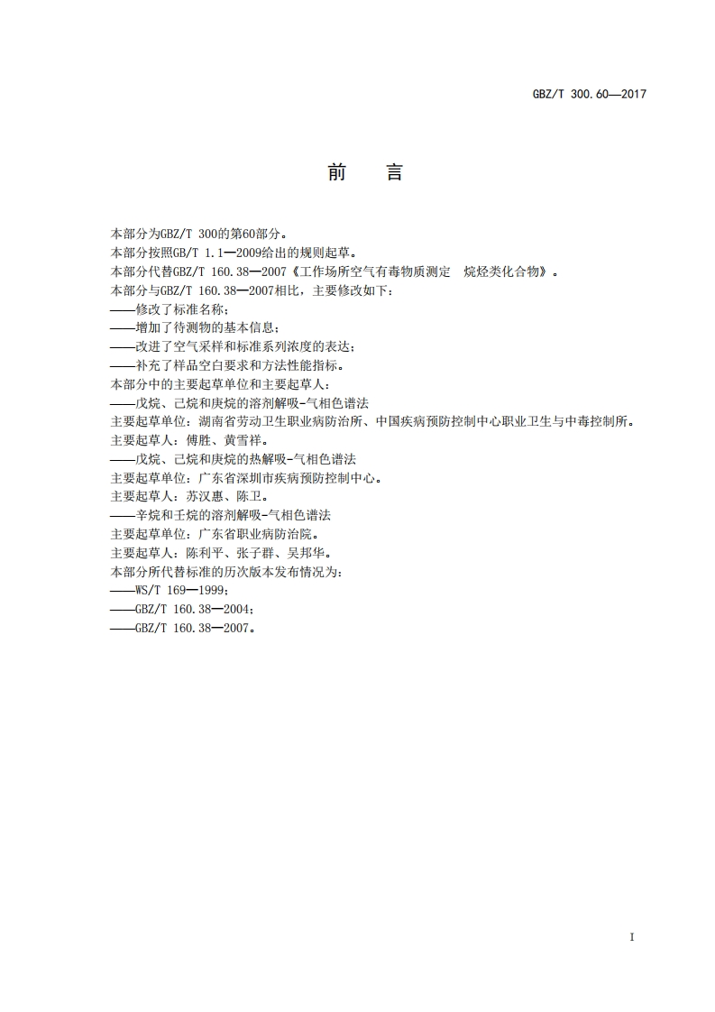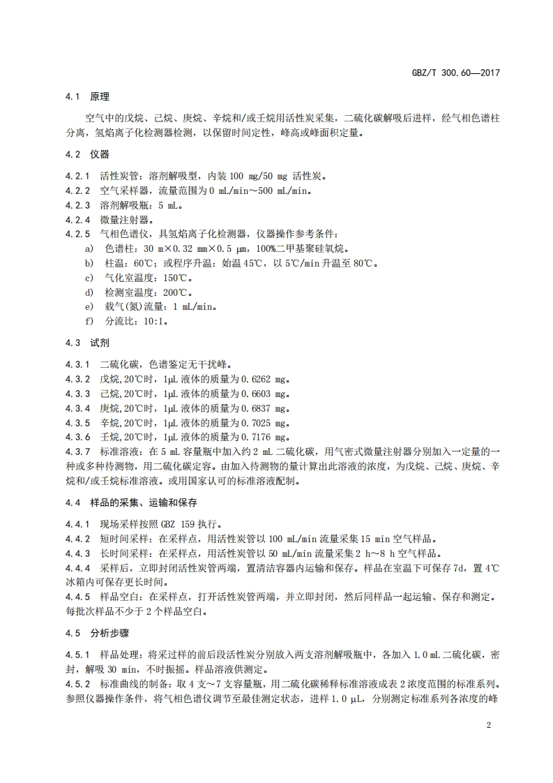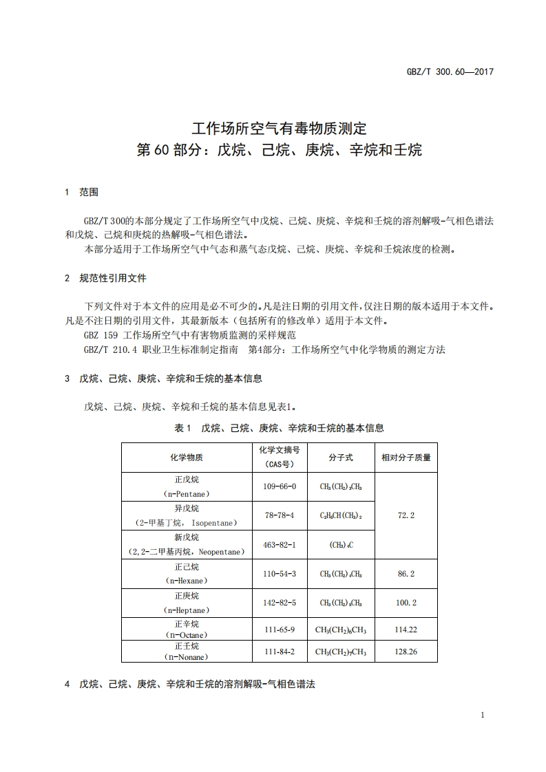ICS13.100C52GBZ中华人民共和国国家职业卫生标准GBZ/T300.60-2017代替GBZ/T160.38一2007工作场所空气有毒物质测定第60部分:戊烷、己烷、庚烷、辛烷和壬烷Determination of toxic substances in workplace air-Part 60:Pantane,hexane,heptane,octane and nonane2017-11-09发布2018-05-01实施中华人民共和国国家卫生和计划生育委员会发布
