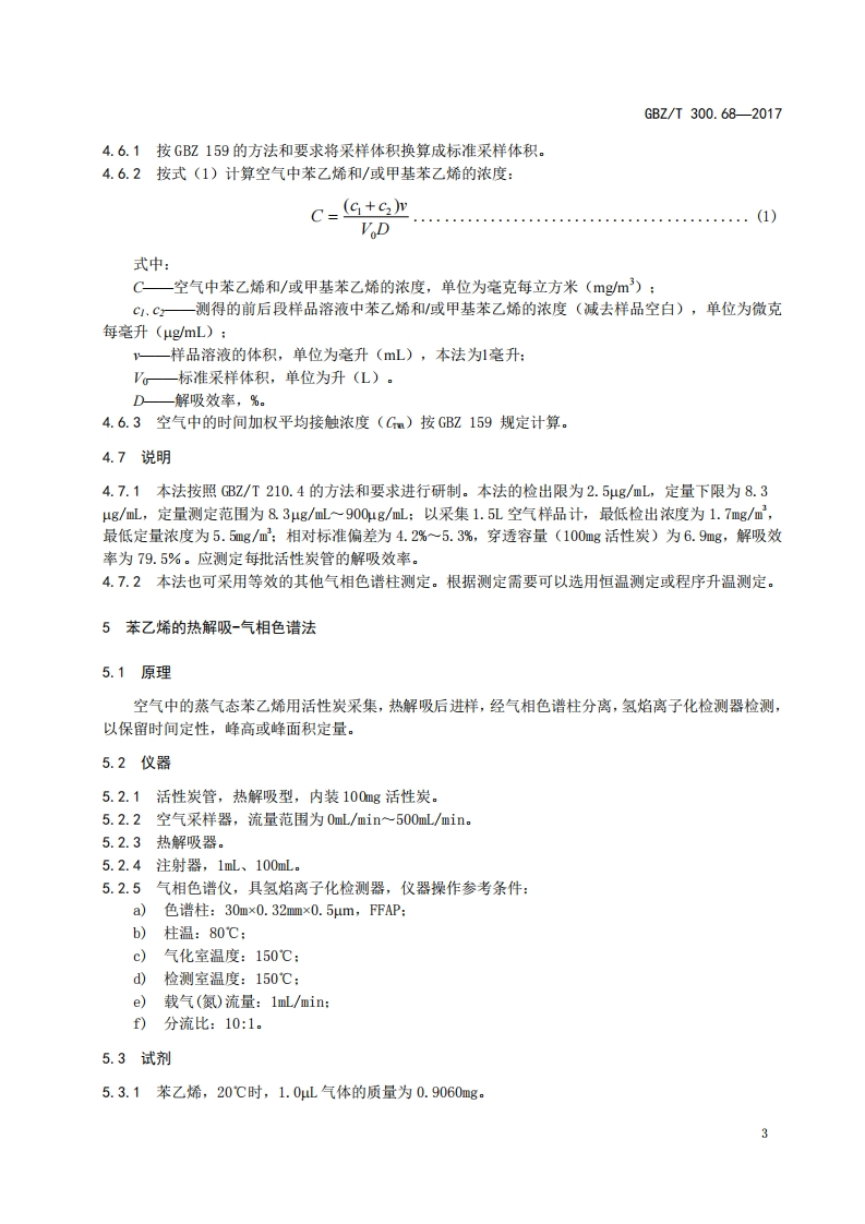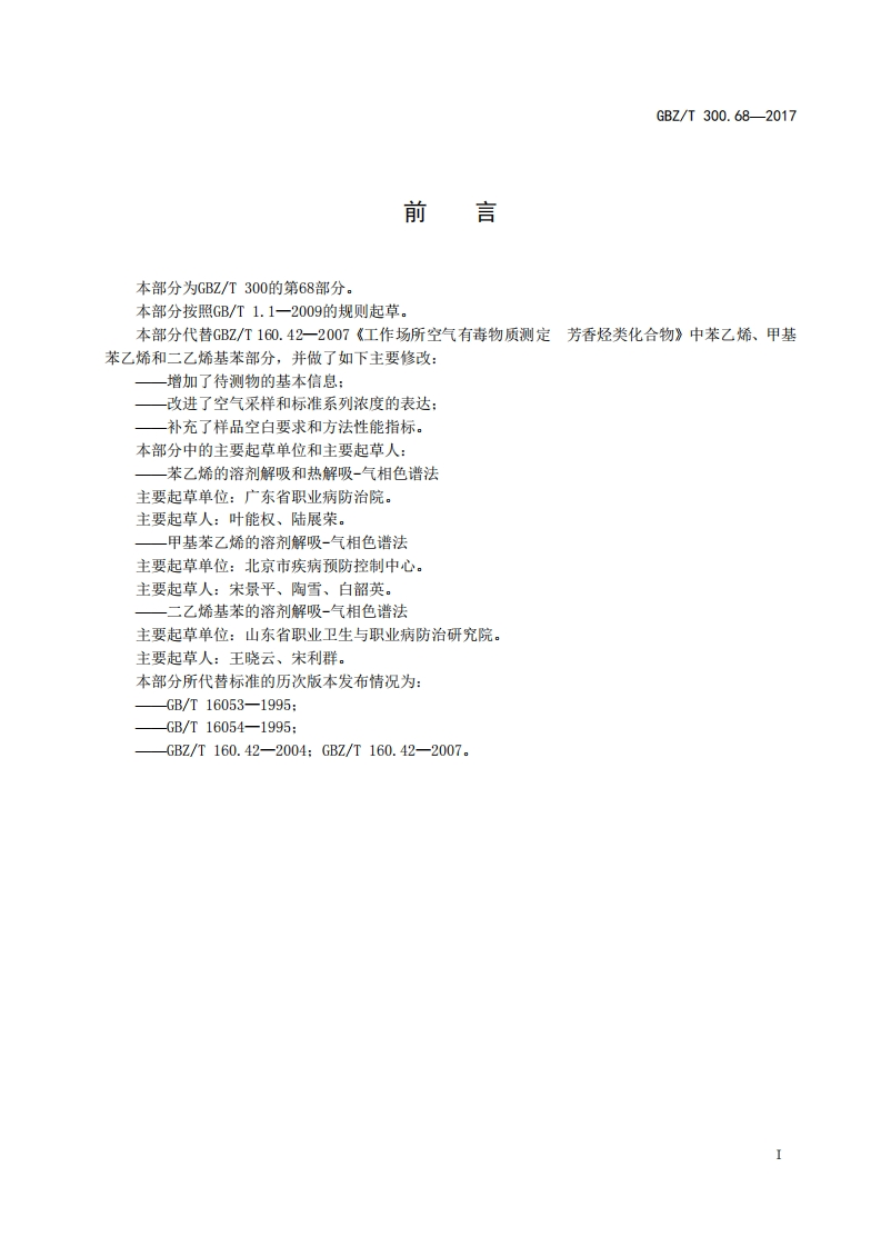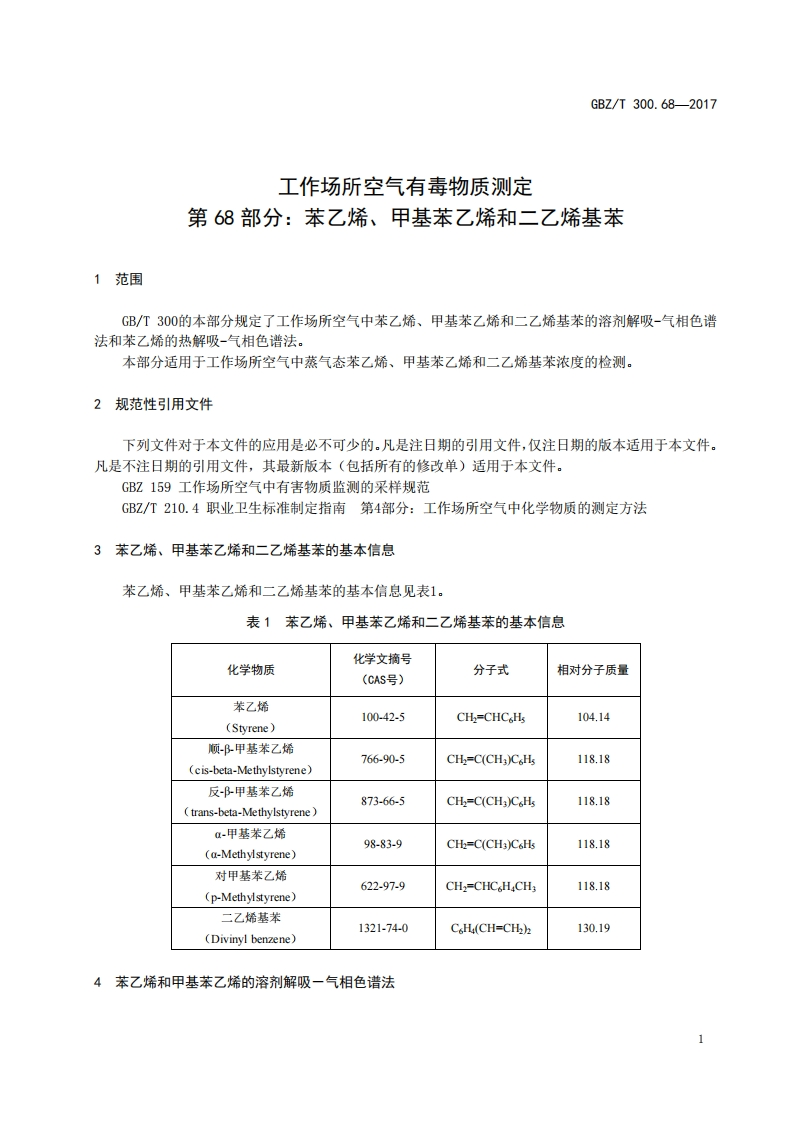 1CS13.100C52FEZ中华人民共和国国家职业卫生标准GBZT300.68-2017部分代替GBZ/T160.42一2007工作场所空气有毒物质测定第68部分:苯乙烯、甲基苯乙烯和二乙烯基苯Determination of toxic substances in workplace air-Part 68:Styrene,methyIstyrene and divinyI benzene2017-11-09发布2018-05-01实施中华人民共和国国家卫生和计划生育委员会发布