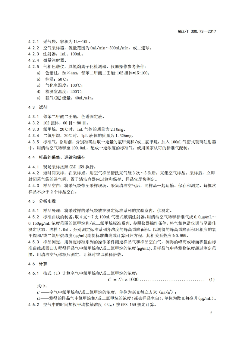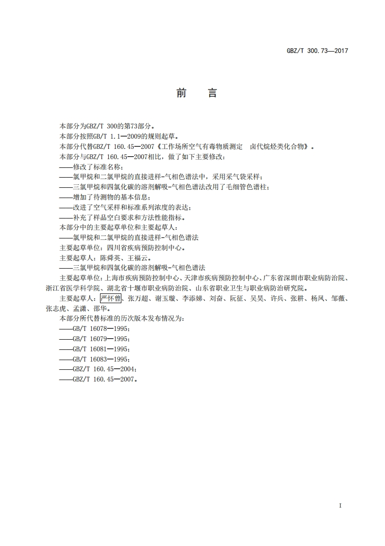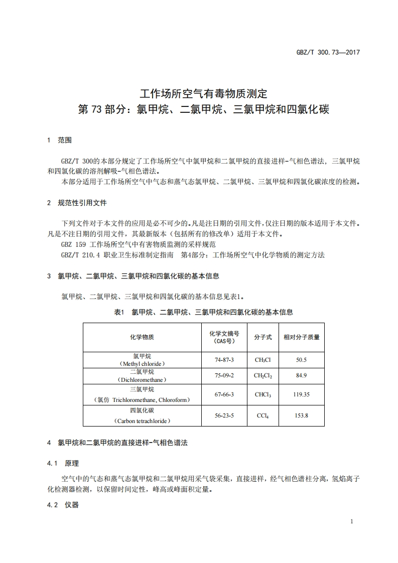 ICS13.100C52GB☑中华人民共和国国家职业卫生标准GBZT300.73—2017代替GBZ/T160.45一2007工作场所空气有毒物质测定第73部分:氯甲烷、二氯甲烷、三氯甲烷和四氯化碳Determination of toxic substances in workplace air-Part 73:Methyl chloride,dichloromethane,chloroform and carbontetrachlor ide2017-11-09发布2018-05-01实施中华人民共和国国家卫生和计划生育委员会发布