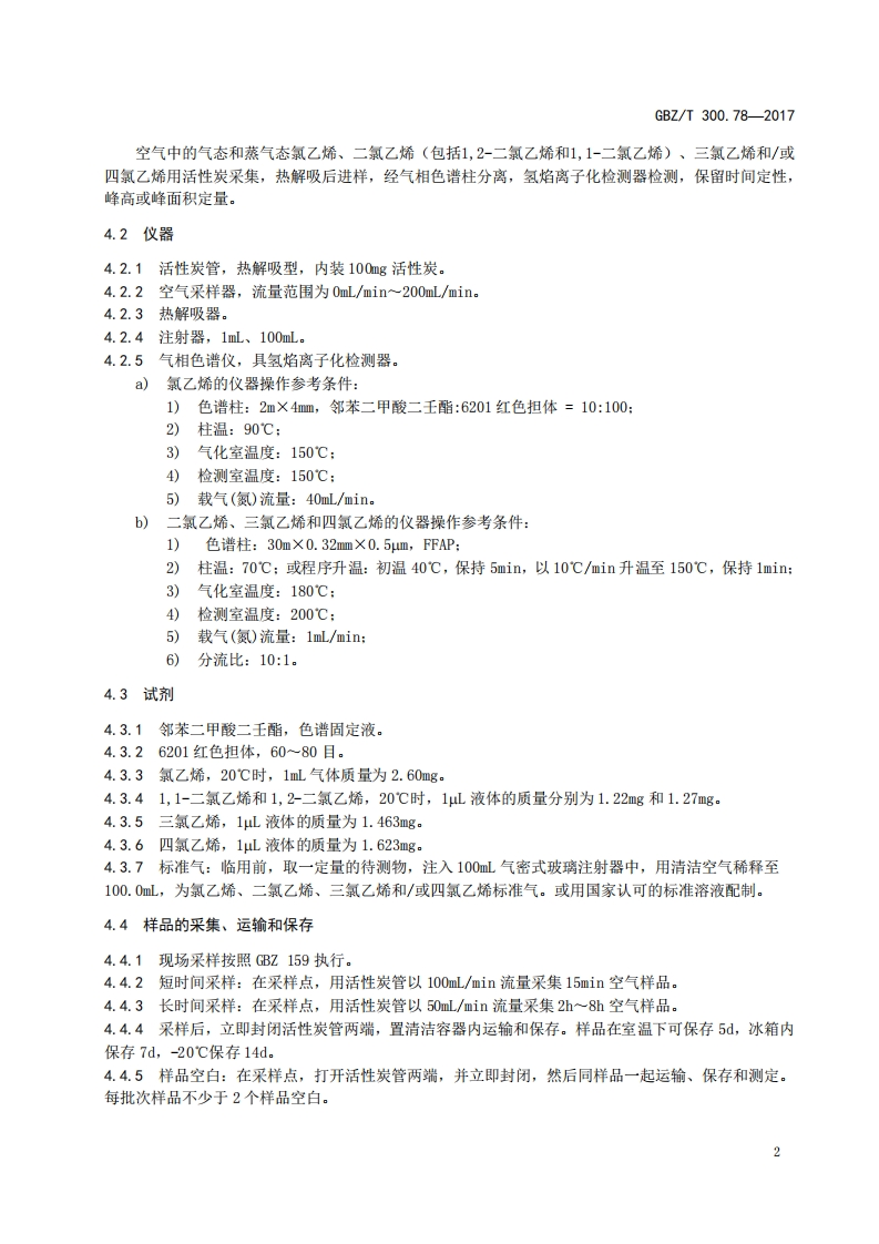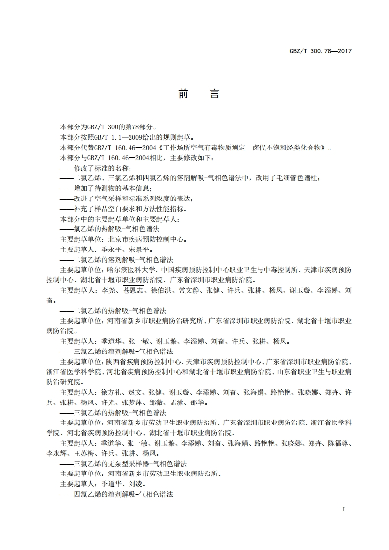 ICS13.100C52GBZ中华人民共和国国家职业卫生标准GBZT300.782017部分代替GBZ/T160.46一2004工作场所空气有毒物质测定第78部分:氯乙烯、二氯乙烯、三氯乙烯和四氯乙烯Determination of toxic substances in workplace air-Part 78:Vinyl chloride,dichloroethene,trichloroethene andtetrachloroethene2017-11-09发布2018-05-01实施中华人民共和国国家卫生和计划生育委员会发布