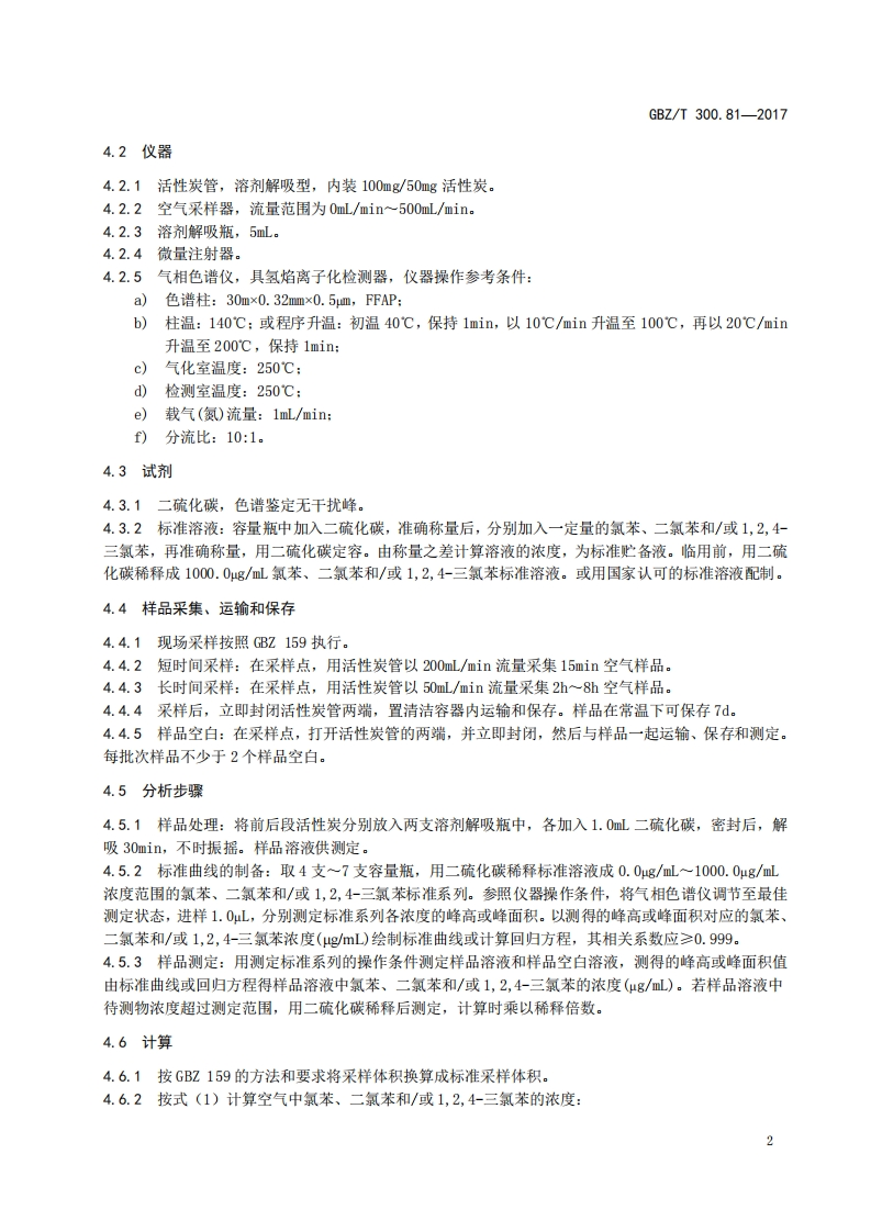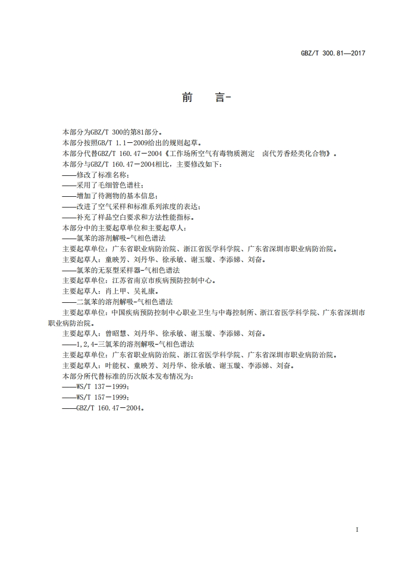 ICS13.100C52FEZ中华人民共和国国家职业卫生标准GBZT300.81-2017部分代替GBZ/T160.47一2004工作场所空气有毒物质测定第81部分:氯苯、二氯苯和三氯苯Determination of toxic substances in workplace air-Part 81:Chlorobenzene,dichlorobenzene and trichlorobenzene2017-11-09发布2018-05-01实施中华人民共和国国家卫生和计划生育委员会发布