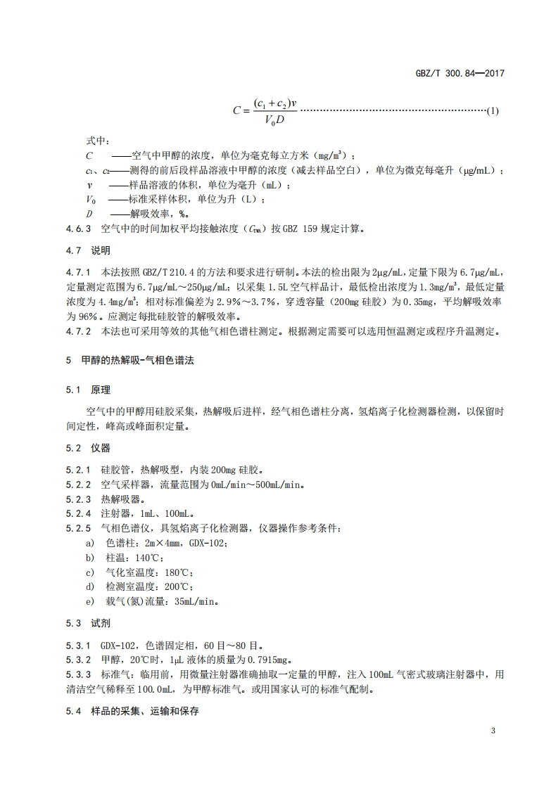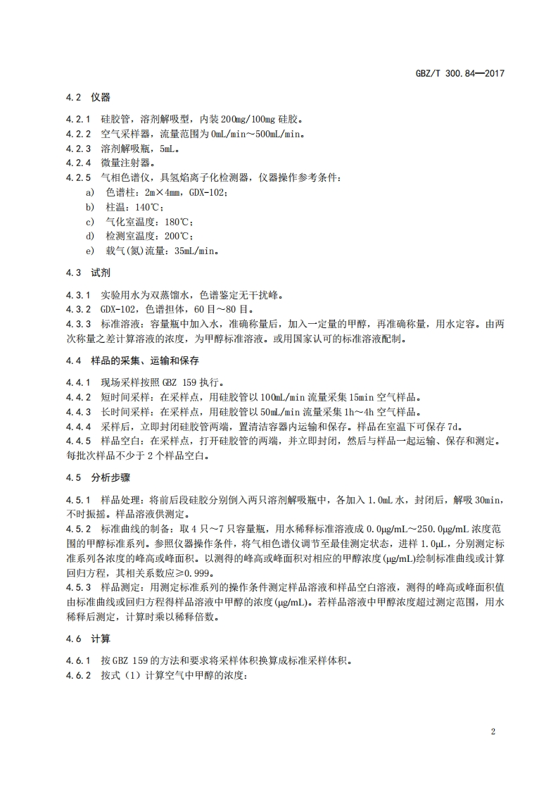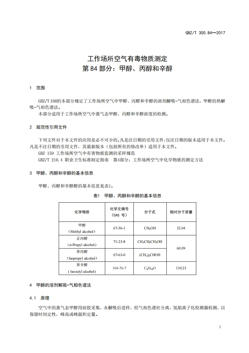 ICS13.100C52FEZ中华人民共和国国家职业卫生标准GBZT300.84-2017部分代替GBZ/T160.48一2004工作场所空气有毒物质测定第84部分:甲醇、丙醇和辛醇Determination of toxic substances in workplace air-Part 84:Methyl alcohol,propyl alcohol and octyl alcohol2017-11-09发布2018-05-01实施中华人民共和国国家卫生和计划生育委员会发布