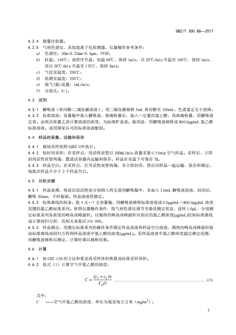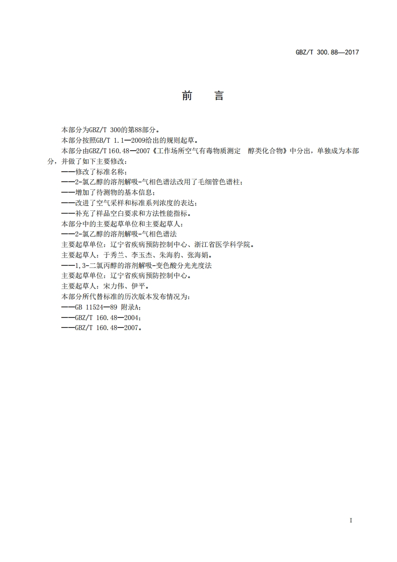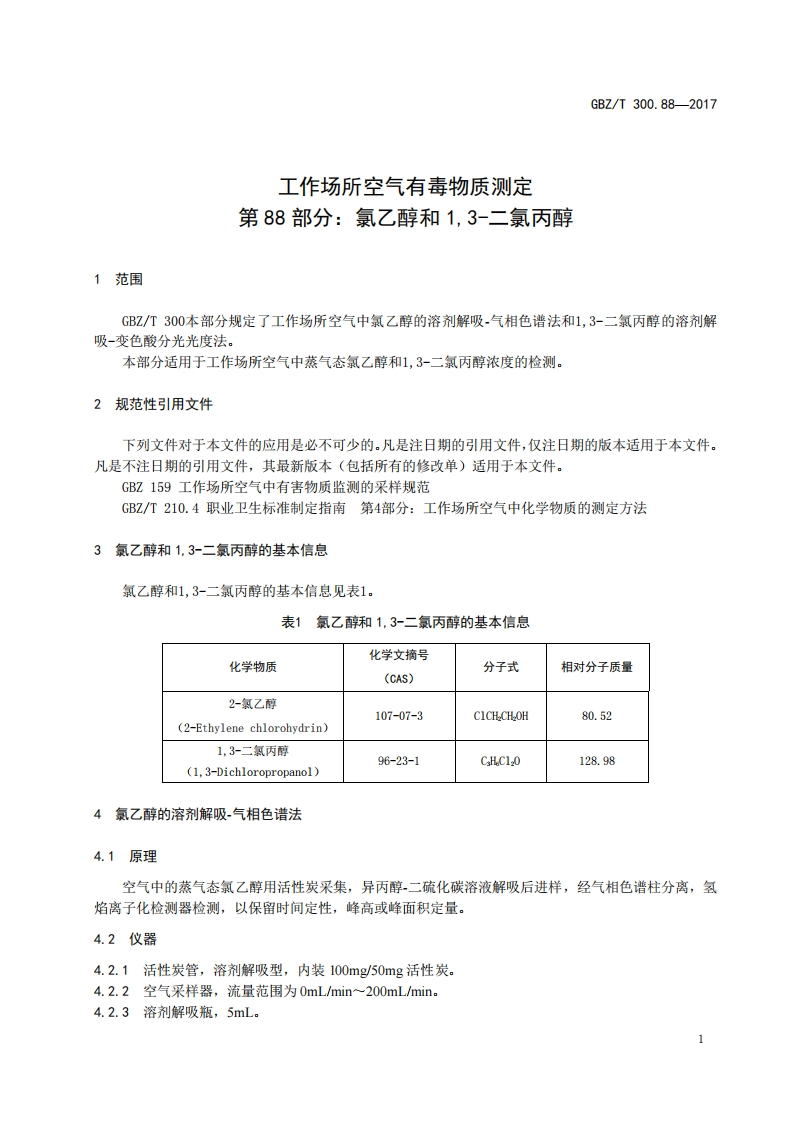 ICS13.100C52GBZ中华人民共和国国家职业卫生标准GBZ/T300.88-2017部分代替GBZ/T160.48一2007工作场所空气有毒物质测定第88部分:氯乙醇和1,3-二氯丙醇Determination of toxic substances in workplace air-Part 88:Ethy lene chlorohydr in and 1,3-dichloropropanol2017-11-09发布2018-05-01实施中华人民共和国国家卫生和计划生育委员会发布