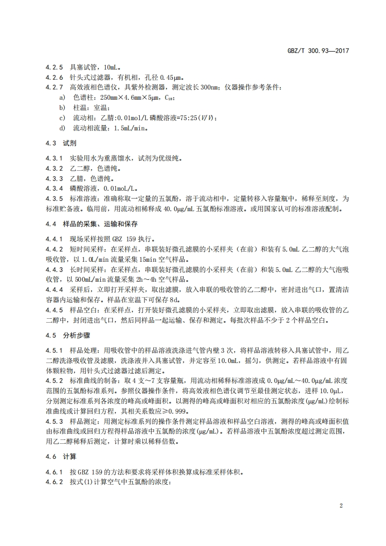 工作场所空气有毒物质测定第93部分_五氯酚和五氯酚钠Determinationoftoxicsubstancesinworkplaceair-Part93_Pentachlorophenolanditssodiumsalt348072@abc12天前发布关注私信0.30MB5页038工作场所空气有毒物质测定第93部分_五氯酚和五氯酚钠Determinationoftoxicsubstancesinworkplaceair-Part93_Pentachlorophenolanditssodiumsalt此内容为付费资源,请付费后查看¥13¥19黄金会员免费钻石会员免费立即购买您当前未登录!建议登陆后购买,可保存购买订单付费资源 第1页 / 共5页 第2页 / 共5页 第3页 / 共5页 第4页 / 共5页 第5页 / 共5页 已完成全部阅读,共5页 THE END标准规范 文本预览 ICS13.100C52GBZ中华人民共和国国家职业卫生标准GBZT300.93—2017代替GBZ/T160.51一2007工作场所空气有毒物质测定第93部分:五氯酚和五氯酚钠Determination of toxic substances in workplace air-Part 93:Pentachlorophenol and its sodium salt2017-11-09发布2018-05-01实施中华人民共和国国家卫生和计划生育委员会发布 查看更多 收起部分 喜欢就支持一下吧收藏