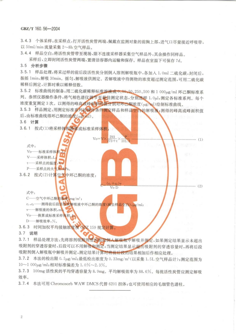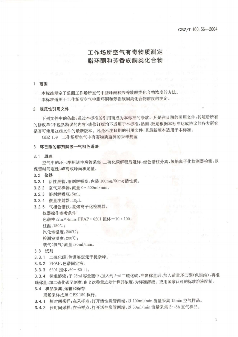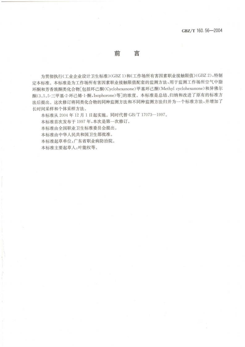 工作场所空气有毒物质测定脂环酮和芳香族酮类化合物Methodsfordeterminationofcyclicandaromaticketonesintheairofworkplace348072@abc13天前发布关注私信0.50MB4页028工作场所空气有毒物质测定脂环酮和芳香族酮类化合物Methodsfordeterminationofcyclicandaromaticketonesintheairofworkplace此内容为付费资源,请付费后查看¥13¥19黄金会员免费钻石会员免费立即购买您当前未登录!建议登陆后购买,可保存购买订单付费资源 第1页 / 共4页 第2页 / 共4页 第3页 / 共4页 第4页 / 共4页 已完成全部阅读,共4页 THE END标准规范 文本预览 1Cs13.100c52GBZ中华人民共和国国家积业卫生标准GBZT160.56-2004工作场所空气有毒物质测定脂环酮和芳香族酮类化合物Methods for determination of cyclic and aromatic ketonesin the air of workplace2004-05-21发布2004-12-01实施中华人民共和国卫生邵发布 查看更多 收起部分 喜欢就支持一下吧收藏
