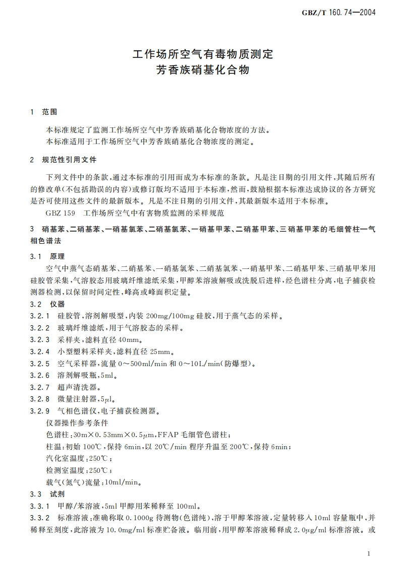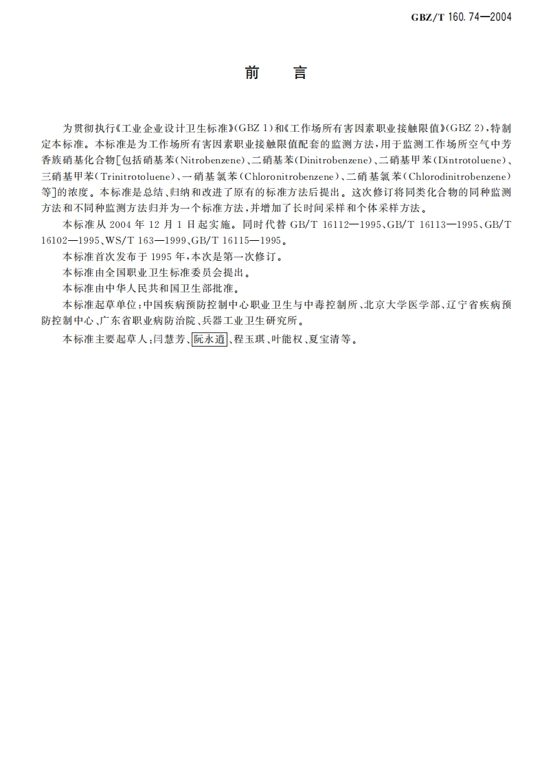 工作场所空气有毒物质测定芳香族硝基化合物Methodsfordeterminationofaromaticnitro-compoundsintheairofworkplace348072@abc13天前发布关注私信2.35MB9页030工作场所空气有毒物质测定芳香族硝基化合物Methodsfordeterminationofaromaticnitro-compoundsintheairofworkplace此内容为付费资源,请付费后查看¥13¥19黄金会员免费钻石会员免费立即购买您当前未登录!建议登陆后购买,可保存购买订单付费资源 第1页 / 共9页 第2页 / 共9页 第3页 / 共9页 第4页 / 共9页 第5页 / 共9页 试读已结束,还剩4页,您可下载完整版后进行离线阅读 THE END标准规范 文本预览 1Cs13.100C52GBZ中华人民共和国国家职业卫生标住GBZ/T160.74-2004工作场所空气有毒物质测定芳香族硝基化合物Methods for determination of aromatic nitro-compoundsin the air of workplace2004-05-21发布2004-12-01实施中华人民共和国卫生邻发布 查看更多 收起部分 喜欢就支持一下吧收藏