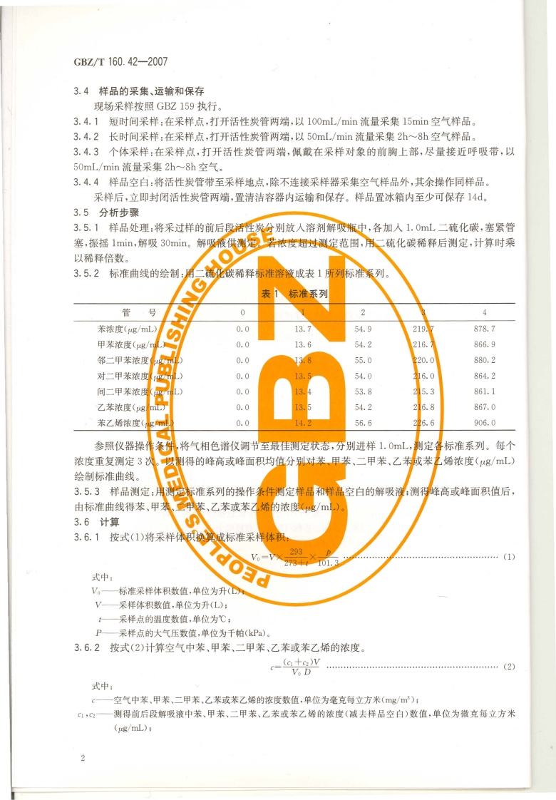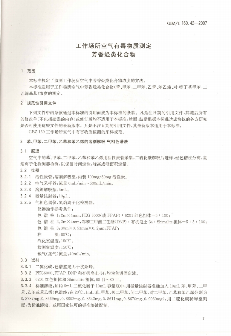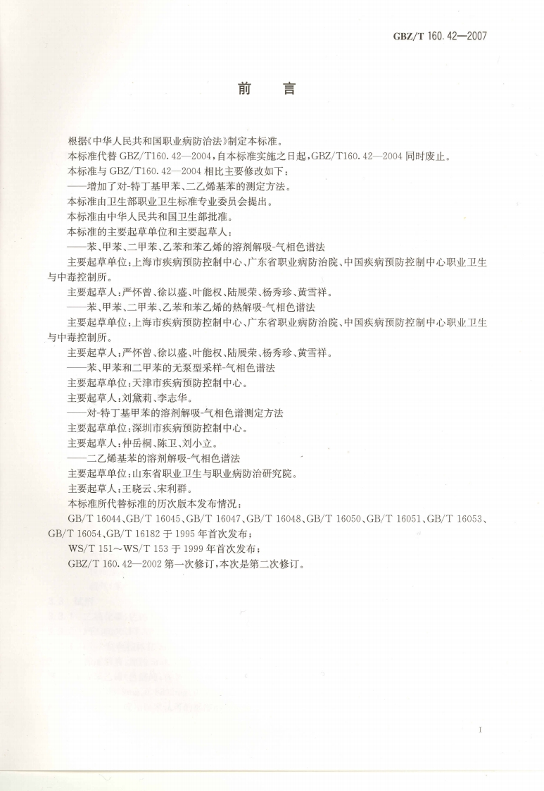 工作场所空气有毒物质测定芳香烃类化合物Determinationofaromatichydrocarbonsintheairofworkplace348072@abc13天前发布关注私信6.47MB13页046工作场所空气有毒物质测定芳香烃类化合物Determinationofaromatichydrocarbonsintheairofworkplace此内容为付费资源,请付费后查看¥13¥19黄金会员免费钻石会员免费立即购买您当前未登录!建议登陆后购买,可保存购买订单付费资源 第1页 / 共13页 第2页 / 共13页 第3页 / 共13页 第4页 / 共13页 第5页 / 共13页 试读已结束,还剩8页,您可下载完整版后进行离线阅读 THE END标准规范 文本预览 ICs13.100C52GBZ中华人民共和国国家职业卫生标准GBZ/T160.42-2007代替GBZ/T160.42-2004工作场所空气有毒物质测定芳香烃类化合物Determination of aromatic hydrocarbons in the air of workplace2007-06-13发布2007-11-30实施G人民里生禁底法P M P H中华人民共和国卫生邵发布 查看更多 收起部分 喜欢就支持一下吧收藏