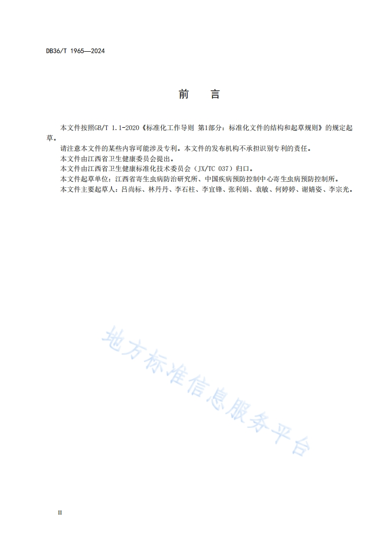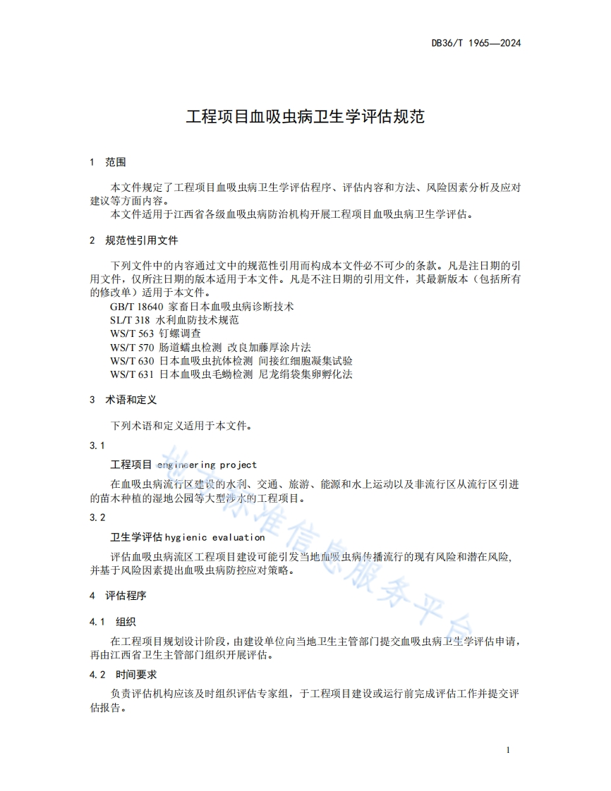工程项目血吸虫病卫生学评估规范Specificationforhygienicevaluationofschistosomiasisinengineeringproject势348072@abc14天前发布关注私信0.82MB19页049工程项目血吸虫病卫生学评估规范Specificationforhygienicevaluationofschistosomiasisinengineeringproject势此内容为付费资源,请付费后查看¥13¥19黄金会员免费钻石会员免费立即购买您当前未登录!建议登陆后购买,可保存购买订单付费资源 第1页 / 共19页 第2页 / 共19页 第3页 / 共19页 第4页 / 共19页 第5页 / 共19页 试读已结束,还剩14页,您可下载完整版后进行离线阅读 THE END标准规范 文本预览 10511.020CCS C 62DB36江西省地方,标准DB36/T1965-2024工程项目血吸虫病卫生学评估规范Specification for hygienic evaluation of schistosomiasis in engineering project地方标准信息服务平台2024-05-23发布2024-11-01实施江西省市场监督管理局发布 查看更多 收起部分 喜欢就支持一下吧收藏
