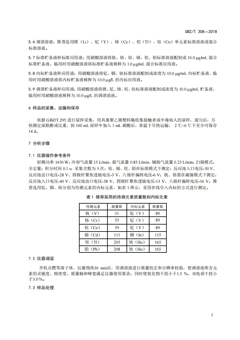 ICS13.100C52GEZ中华人民共和国国家职业卫生标准GBZT308-2018尿中多种金属同时测定电感耦合等离子体质谱法Simultaneous determination of a variety of metals in urineInductively coupled plasma mass spectrometry method2018-08-16发布2019-01-01实施中华人民共和国国家卫生健康委员会发布