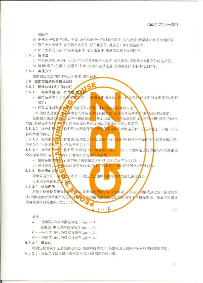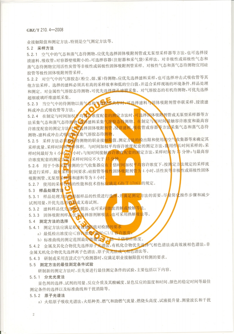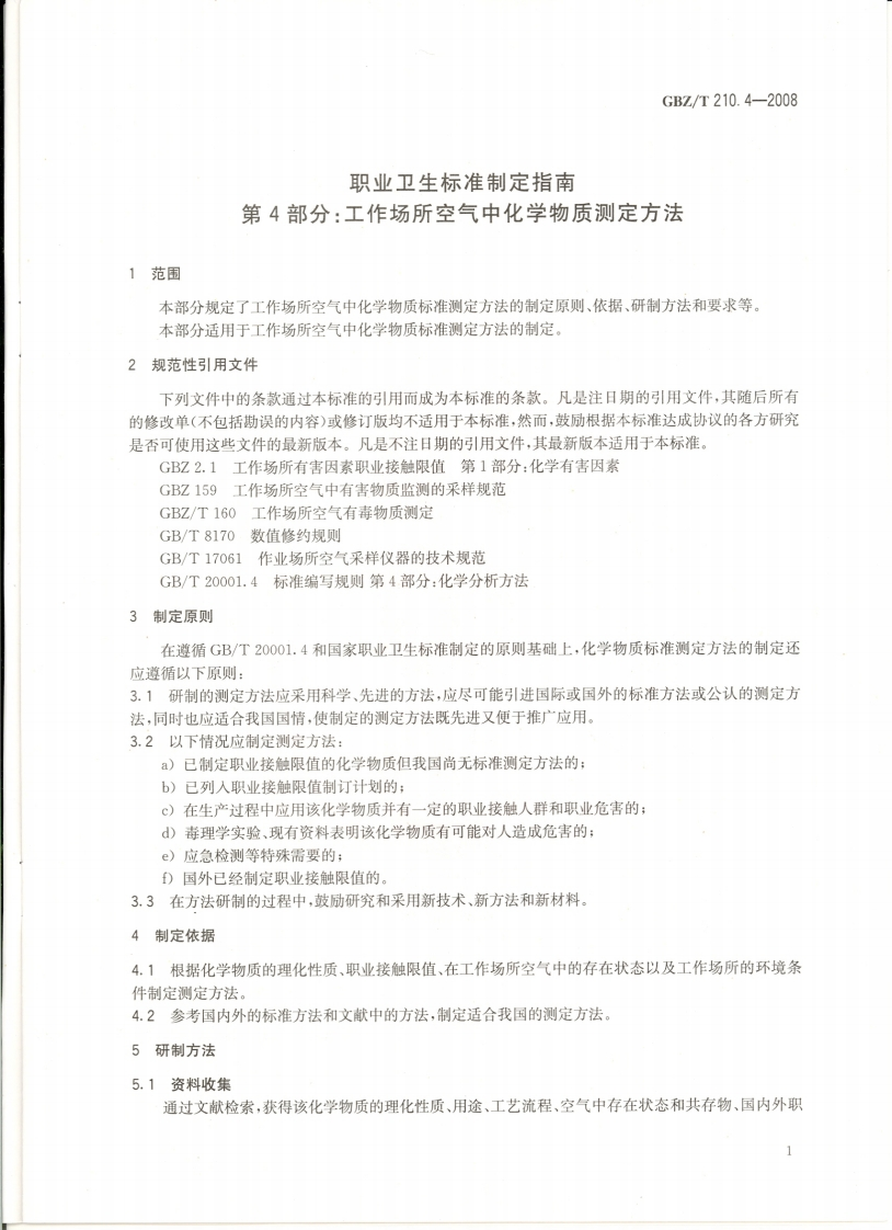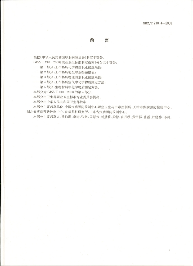 ICs13.100c52GBZ中华人民共和国国家职业卫生标雀GBZ/T210.4-2008职业卫生标准制定指南第4部分:工作场所空气中化学物质测定方法Guide for establishing occupational health standards-Part 4:Determination methods of air chemicalsin workplace2008-07-08发布2008-12-30实施@人所名生典息热P M P H中华人民共和国卫生邵发布02