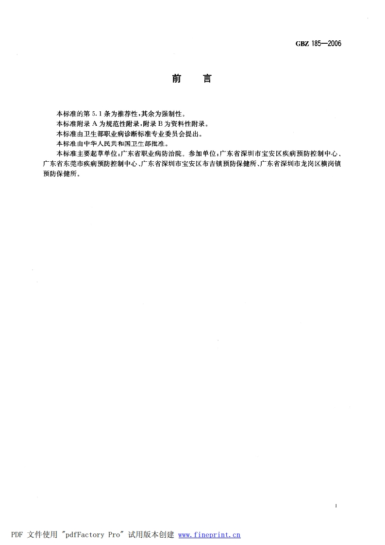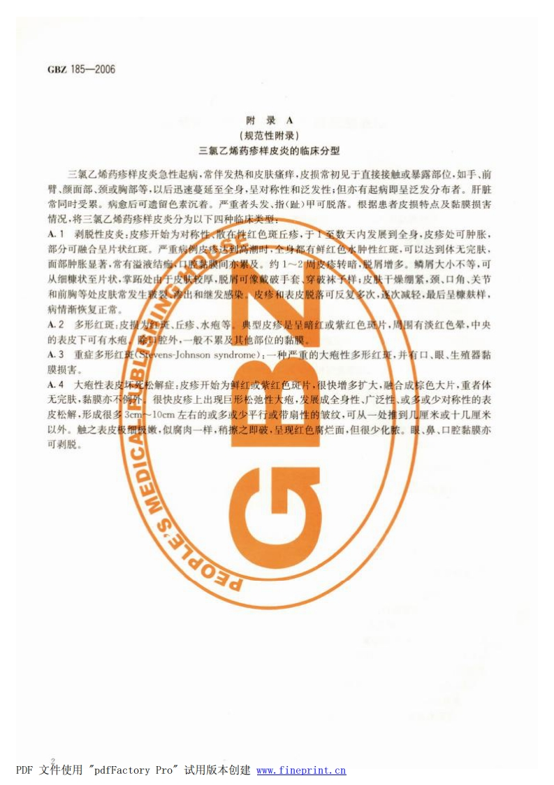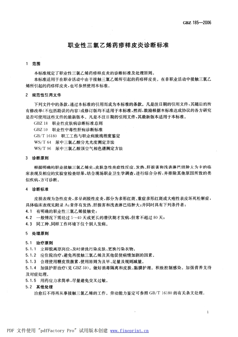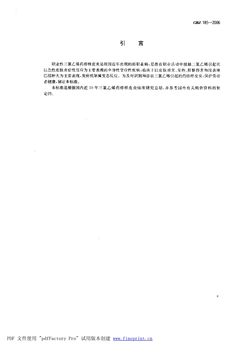 c60GBZ中华人民共和国国家职业卫生标准GBZ185-2006职业性三氯乙烯药疹样皮炎诊断标准Diagnostic criteria of occupational medicamentose-likedermatitis due to trichloroethylene2007-01-04发布2007-07-01实施人民金理来果出中华人民共和国卫生祁发布PDF文件使用"pdfFactory Pro”试用版本创建ww.fineprint..cn