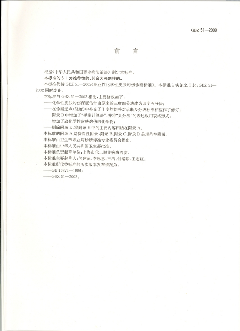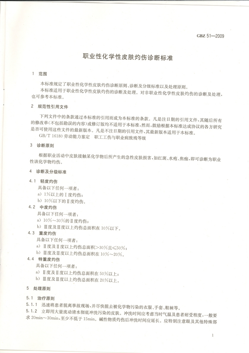 职业性化学性皮肤灼伤诊断标准Diagnosticcriteriaofoccupationalchemicalskinburns348072@abc前天发布关注私信4.70MB9页043职业性化学性皮肤灼伤诊断标准Diagnosticcriteriaofoccupationalchemicalskinburns此内容为付费资源,请付费后查看¥13¥19黄金会员免费钻石会员免费立即购买您当前未登录!建议登陆后购买,可保存购买订单付费资源 第1页 / 共9页 第2页 / 共9页 第3页 / 共9页 第4页 / 共9页 第5页 / 共9页 试读已结束,还剩4页,您可下载完整版后进行离线阅读 THE END标准规范 文本预览 1Cs13.100c60GBZ中华人民共和国国家职业卫生标准GBZ51-2009代替GBZ51一2002职业性化学性皮肤灼伤诊断标准Diagnostic criteria of occupational chemical skin burns2009-03-16发布2009-11-01实施人k生电息热P M P H中华人民共和国卫生部发布 查看更多 收起部分 喜欢就支持一下吧收藏