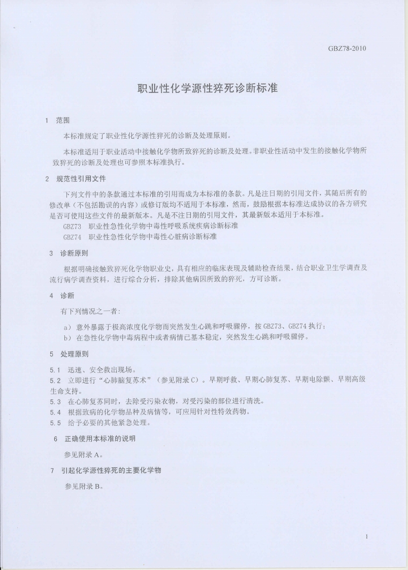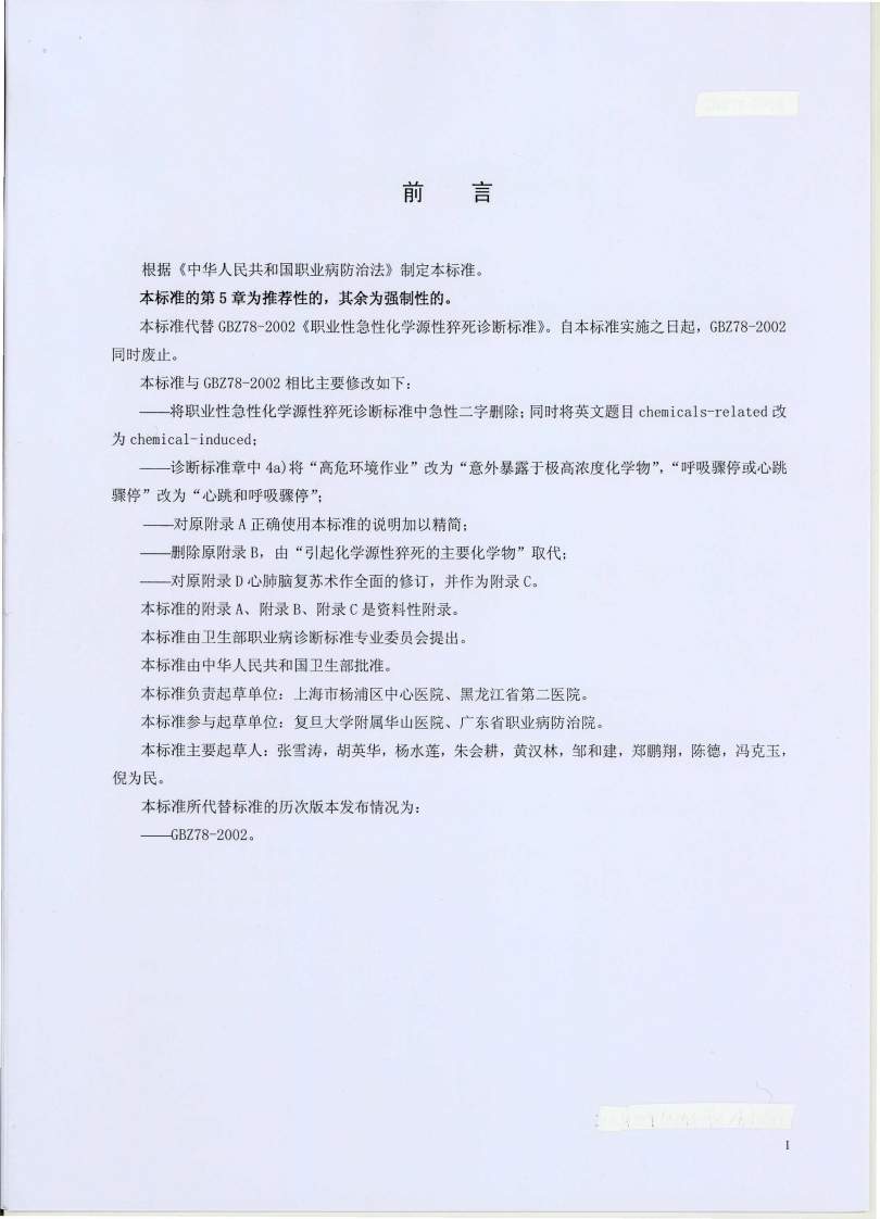 职业性化学源性猝死诊断标准Diagnosticcriteriaofoccupationalchemical-inducedsuddendeath348072@abc前天发布关注私信3.81MB8页024职业性化学源性猝死诊断标准Diagnosticcriteriaofoccupationalchemical-inducedsuddendeath此内容为付费资源,请付费后查看¥13¥19黄金会员免费钻石会员免费立即购买您当前未登录!建议登陆后购买,可保存购买订单付费资源 第1页 / 共8页 第2页 / 共8页 第3页 / 共8页 第4页 / 共8页 第5页 / 共8页 试读已结束,还剩3页,您可下载完整版后进行离线阅读 THE END标准规范 文本预览 1CS13.100C60GBZ中华人民共和国国家职业卫生标准GBZ78-2010代替GB278-2002职业性化学源性猝死诊断标准Diagnostic criteria of occupational chemical-induced sudden death2010-03-10发布2010-10-01实施中华人民共和国卫生部发布 查看更多 收起部分 喜欢就支持一下吧收藏