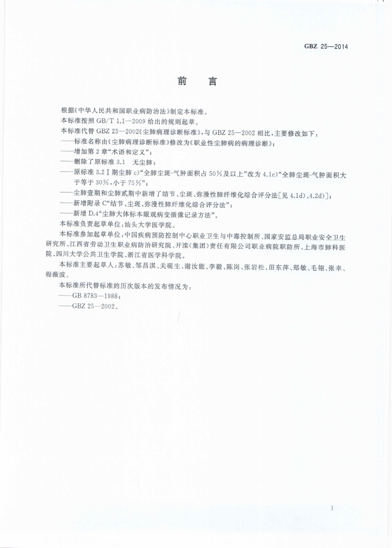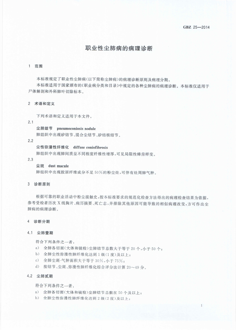 职业性尘肺病的病理诊断Pathologicaldiagnosiscriteriaofpneumoconioses348072@abc昨天发布关注私信5.87MB16页023职业性尘肺病的病理诊断Pathologicaldiagnosiscriteriaofpneumoconioses此内容为付费资源,请付费后查看¥13¥19黄金会员免费钻石会员免费立即购买您当前未登录!建议登陆后购买,可保存购买订单付费资源 第1页 / 共16页 第2页 / 共16页 第3页 / 共16页 第4页 / 共16页 第5页 / 共16页 试读已结束,还剩11页,您可下载完整版后进行离线阅读 THE END标准规范 文本预览 ICS13.100C60B☑中华人民共和国国家职业卫生标准GBZ25-2014代替GBZ25-2002职业性尘肺病的病理诊断Pathological diagnosis criteria of pneumoconioses2014-10-13发布2015-03-01实施中华人民共和国国家卫生和计划生育委员会发布 查看更多 收起部分 喜欢就支持一下吧收藏