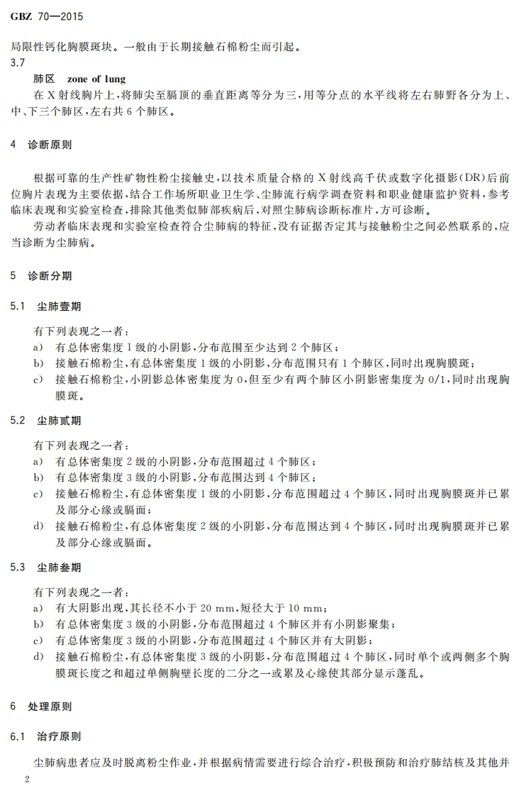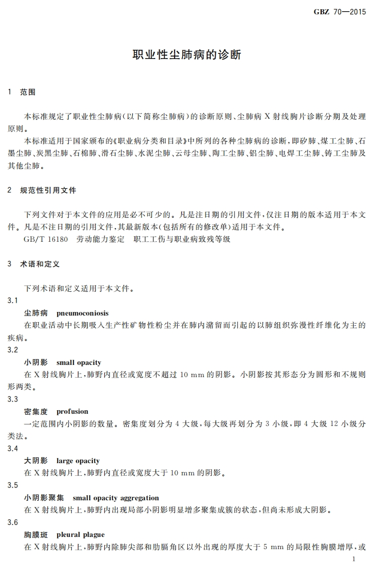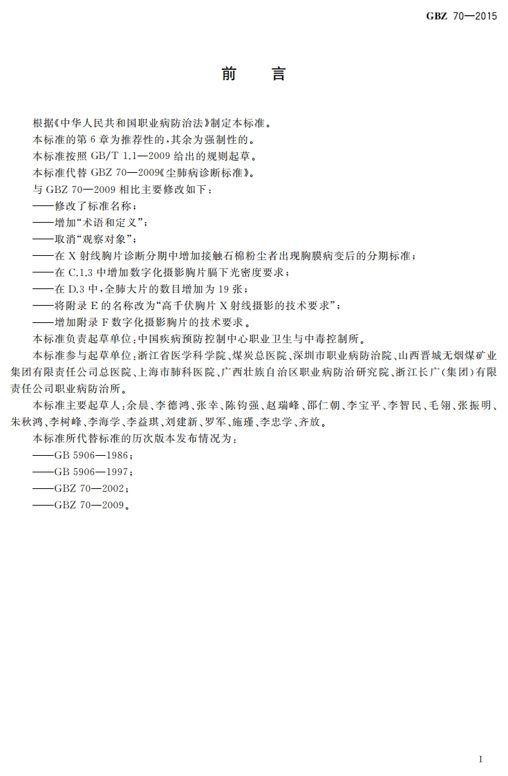 职业性尘肺病的诊断Diagnosisofoccupationalpneumoconiosis348072@abc昨天发布关注私信0.89MB15页049职业性尘肺病的诊断Diagnosisofoccupationalpneumoconiosis此内容为付费资源,请付费后查看¥13¥19黄金会员免费钻石会员免费立即购买您当前未登录!建议登陆后购买,可保存购买订单付费资源 第1页 / 共15页 第2页 / 共15页 第3页 / 共15页 第4页 / 共15页 第5页 / 共15页 试读已结束,还剩10页,您可下载完整版后进行离线阅读 THE END标准规范 文本预览 1CS13.100C60G82中华人民共和国国家职业卫生标准GBZ70-2015代替GBZ70-2009职业性尘肺病的诊断Diagnosis of occupational pneumoconiosis2015-12-15发布2016-05-01实施中华人民共和国国家卫生和计划生育委员会发布 查看更多 收起部分 喜欢就支持一下吧收藏
