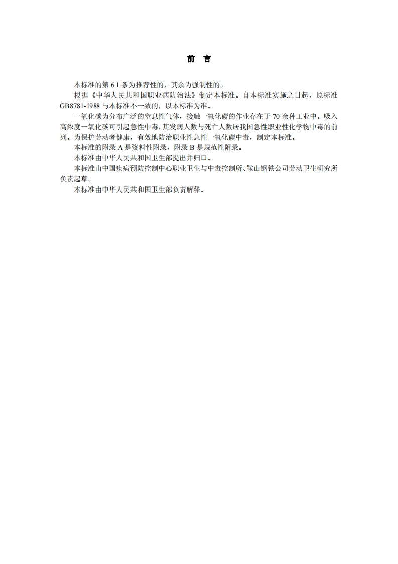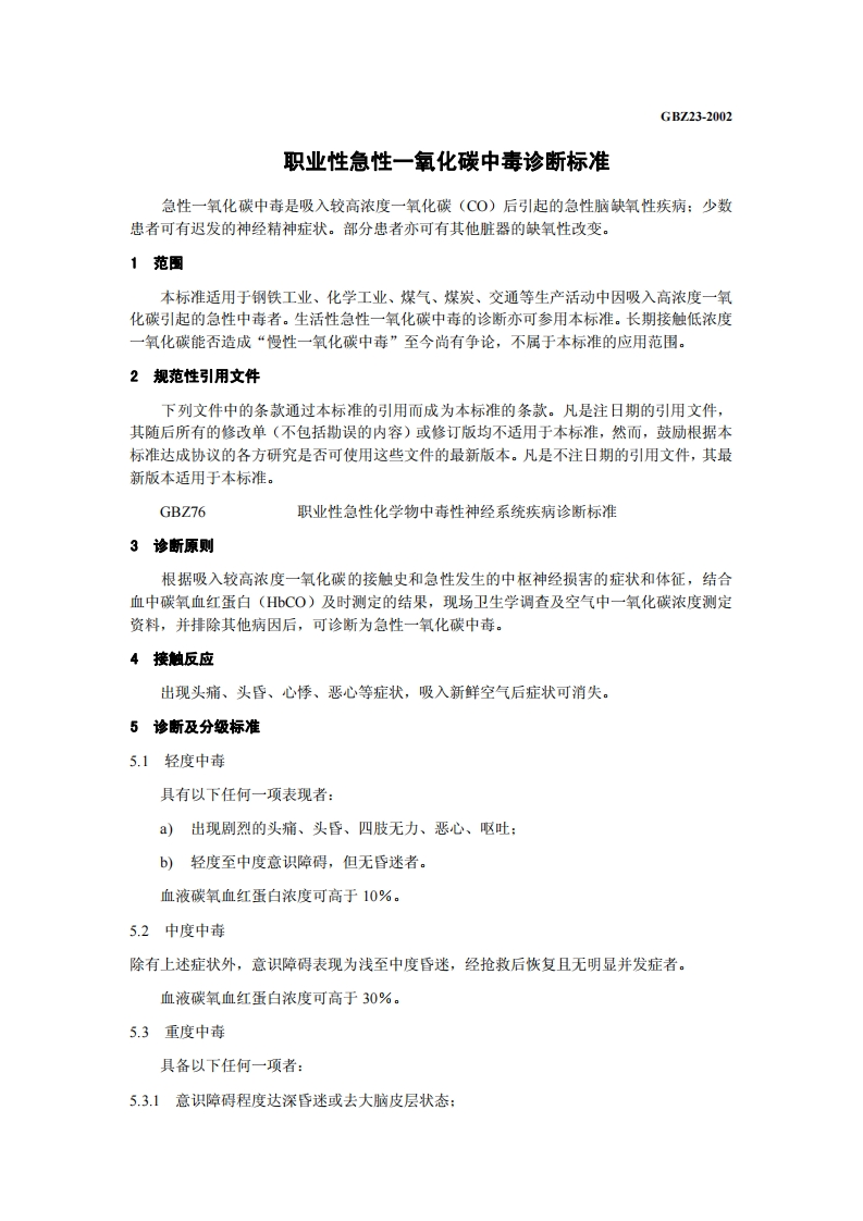 职业性急性一氧化碳中毒诊断标准DiagnosticCriteriaofOccupationalAcuteCarbonMonoxidePoisoning348072@abc昨天发布关注私信0.17MB8页033职业性急性一氧化碳中毒诊断标准DiagnosticCriteriaofOccupationalAcuteCarbonMonoxidePoisoning此内容为付费资源,请付费后查看¥13¥19黄金会员免费钻石会员免费立即购买您当前未登录!建议登陆后购买,可保存购买订单付费资源 第1页 / 共8页 第2页 / 共8页 第3页 / 共8页 第4页 / 共8页 第5页 / 共8页 试读已结束,还剩3页,您可下载完整版后进行离线阅读 THE END标准规范 文本预览 1CS13.100C60GBZ中华人民共和国国家职业卫生标准GBZ23-2002职业性急性一氧化碳中毒诊断标准Diagnostic Criteria of Occupational Acute Carbon Monoxide Poisoning2002-04-08发布2002-06-01实施中华人民共和国卫生部发布 查看更多 收起部分 喜欢就支持一下吧收藏