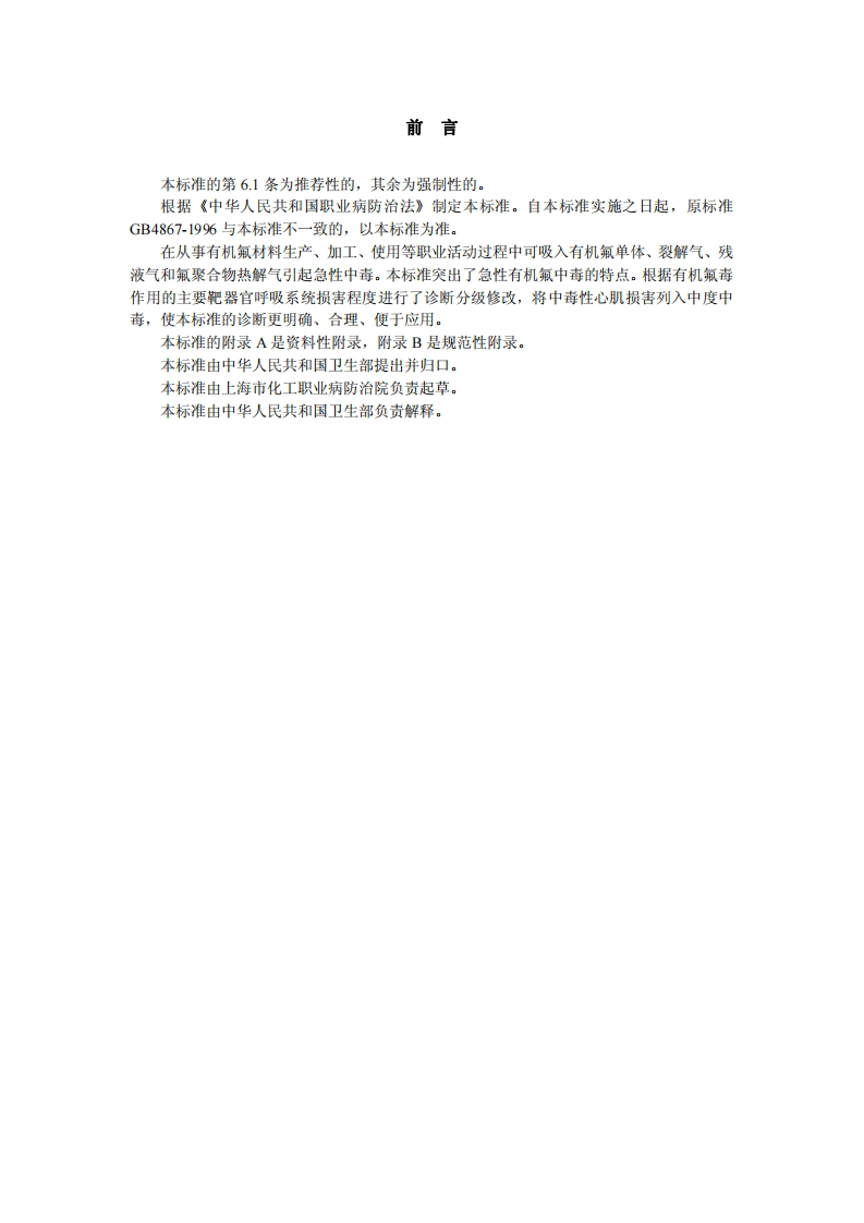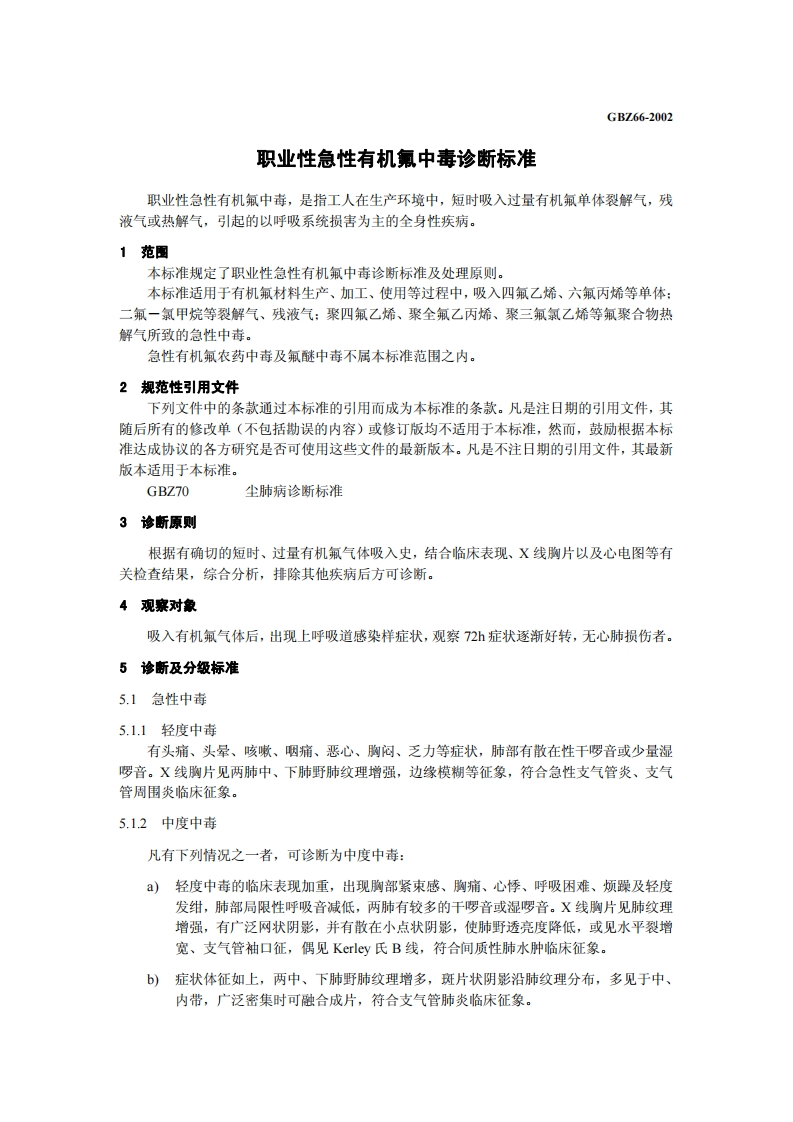 职业性急性有机氟中毒诊断标准DiagnosticCriteriaofOccupationalAcuteFluorohydrocarbonPoisoning348072@abc15小时前发布关注私信0.16MB6页032职业性急性有机氟中毒诊断标准DiagnosticCriteriaofOccupationalAcuteFluorohydrocarbonPoisoning此内容为付费资源,请付费后查看¥13¥19黄金会员免费钻石会员免费立即购买您当前未登录!建议登陆后购买,可保存购买订单付费资源 第1页 / 共6页 第2页 / 共6页 第3页 / 共6页 第4页 / 共6页 第5页 / 共6页 试读已结束,还剩1页,您可下载完整版后进行离线阅读 THE END标准规范 文本预览 1CS13.100C60GBZ中华人民共和国国家职业卫生标准GBZ66-2002职业性急性有机氟中毒诊断标准Diagnostic Criteria of Occupational Acute Fluorohydrocarbon Poisoning2002-04-08发布2002-06-01实施中华人民共和国卫生部发布 查看更多 收起部分 喜欢就支持一下吧收藏