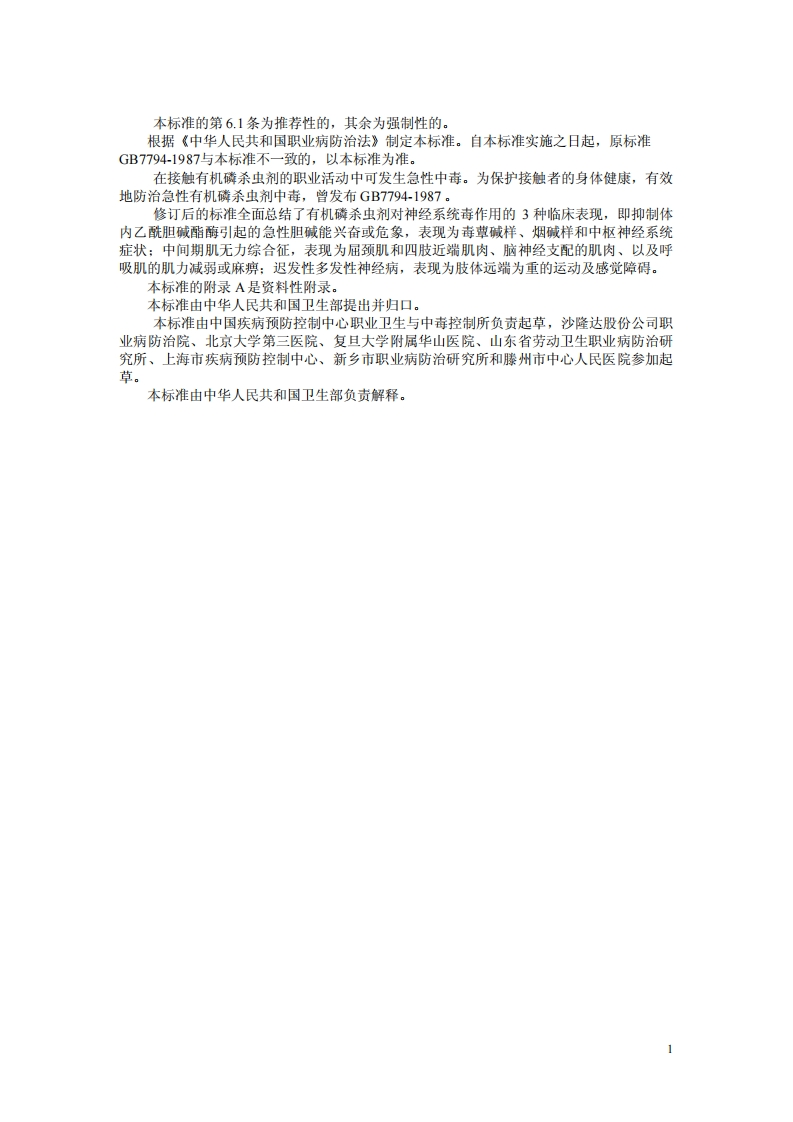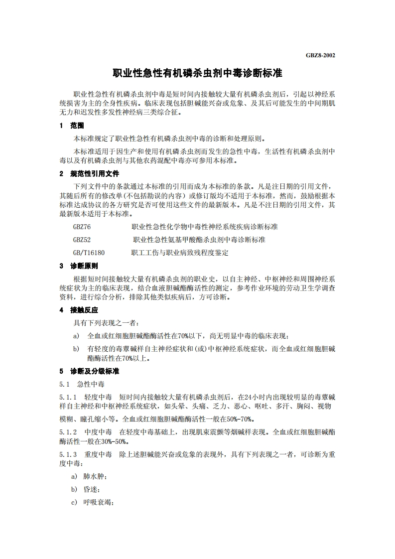 职业性急性有机磷杀虫剂中毒诊断标准DiagnosticCriteriaofOccupationalAcuteOrganophosphorusInsecticidesPoisoning348072@abc13小时前发布关注私信0.16MB7页036职业性急性有机磷杀虫剂中毒诊断标准DiagnosticCriteriaofOccupationalAcuteOrganophosphorusInsecticidesPoisoning此内容为付费资源,请付费后查看¥13¥19黄金会员免费钻石会员免费立即购买您当前未登录!建议登陆后购买,可保存购买订单付费资源 第1页 / 共7页 第2页 / 共7页 第3页 / 共7页 第4页 / 共7页 第5页 / 共7页 试读已结束,还剩2页,您可下载完整版后进行离线阅读 THE END标准规范 文本预览 1CS13.100C60GBZ中华人民共和国国家职业卫生标准GBZ8-2002职业性急性有机磷杀虫剂中毒诊断标准Diagnostic Criteria of Occupational Acute Organophosphorus Insecticides Poisoning2002-04-08发布2002-06-01实施中华人民共和国卫生部发布前言 查看更多 收起部分 喜欢就支持一下吧收藏