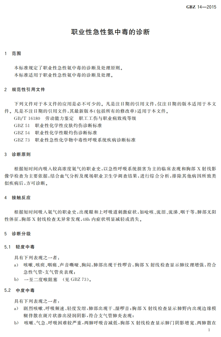 职业性急性氨中毒的诊断Diagnosisofoccupationalacuteammoniapoisoning348072@abc12小时前发布关注私信0.29MB5页046职业性急性氨中毒的诊断Diagnosisofoccupationalacuteammoniapoisoning此内容为付费资源,请付费后查看¥13¥19黄金会员免费钻石会员免费立即购买您当前未登录!建议登陆后购买,可保存购买订单付费资源 第1页 / 共5页 第2页 / 共5页 第3页 / 共5页 第4页 / 共5页 第5页 / 共5页 已完成全部阅读,共5页 THE END标准规范 文本预览 1CS13.100C60GBZ中华人民共和国国家职业卫生标准GBZ14-2015代替GBZ14一2002职业性急性氨中毒的诊断Diagnosis of occupational acute ammonia poisoning2015-04-21发布2015-11-01实施中华人民共和国国家卫生和计划生育委员会发布 查看更多 收起部分 喜欢就支持一下吧收藏