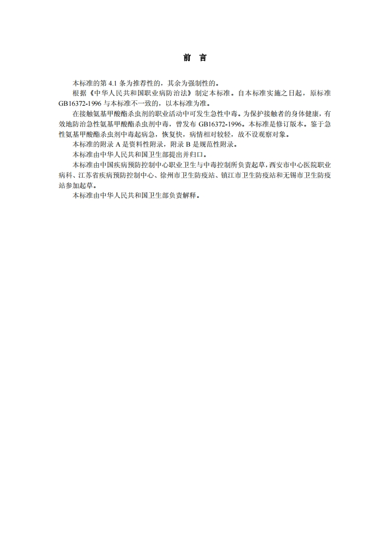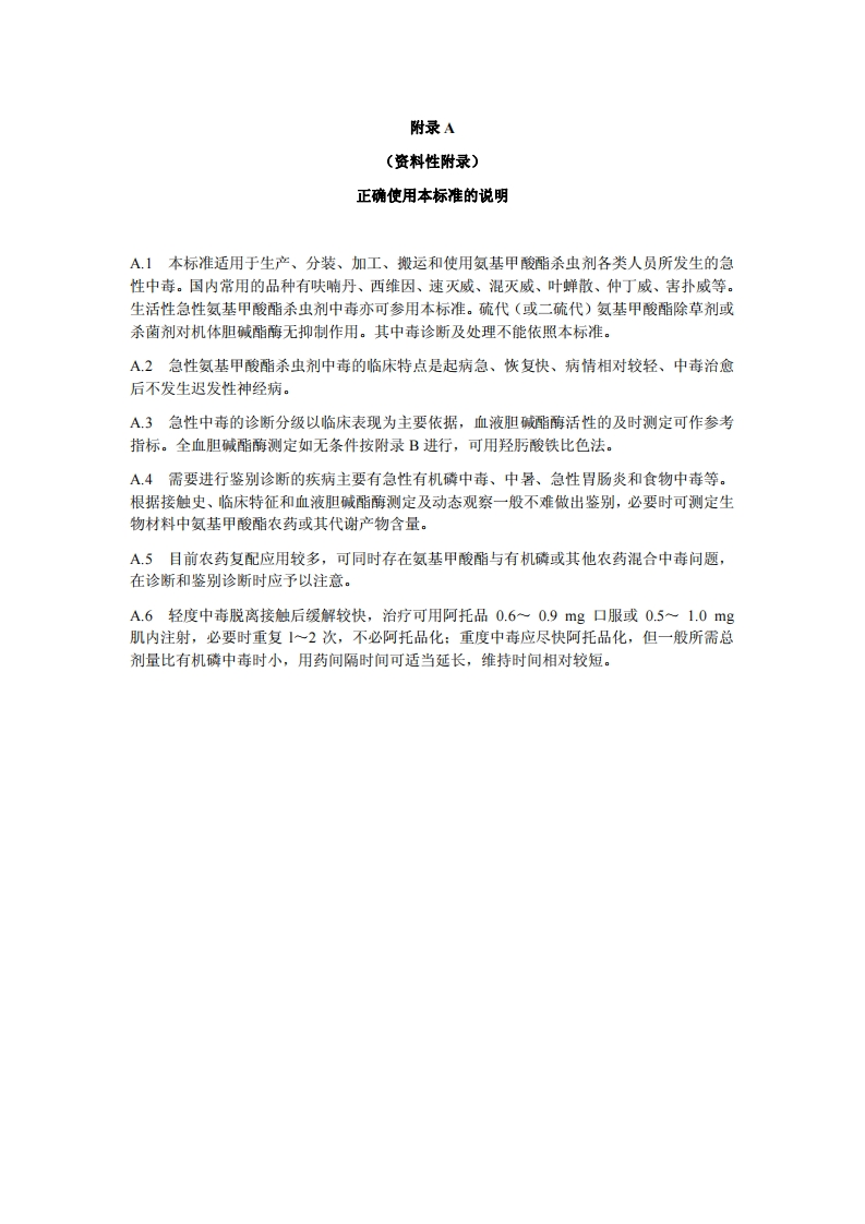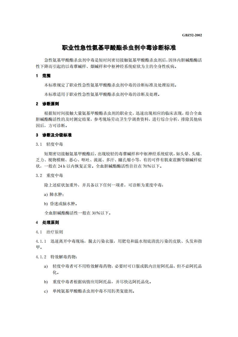 职业性急性氨基甲酸酯杀虫剂中毒诊断标准DiagnosticCriteriaofOccupationalAcuteCarbamateInsecticidesPoisoning348072@abc10小时前发布关注私信0.14MB7页037职业性急性氨基甲酸酯杀虫剂中毒诊断标准DiagnosticCriteriaofOccupationalAcuteCarbamateInsecticidesPoisoning此内容为付费资源,请付费后查看¥13¥19黄金会员免费钻石会员免费立即购买您当前未登录!建议登陆后购买,可保存购买订单付费资源 第1页 / 共7页 第2页 / 共7页 第3页 / 共7页 第4页 / 共7页 第5页 / 共7页 试读已结束,还剩2页,您可下载完整版后进行离线阅读 THE END标准规范 文本预览 1CS13.100C60GBZ中华人民共和国国家职业卫生标准GBZ52-2002职业性急性氨基甲酸酯杀虫剂中毒诊断标准Diagnostic Criteria of Occupational Acute Carbamate Insecticides Poisoning2002-04-08发布2002-06-01实施中华人民共和国卫生部发布 查看更多 收起部分 喜欢就支持一下吧收藏
