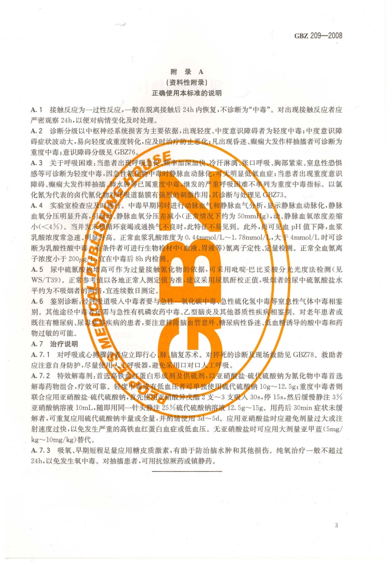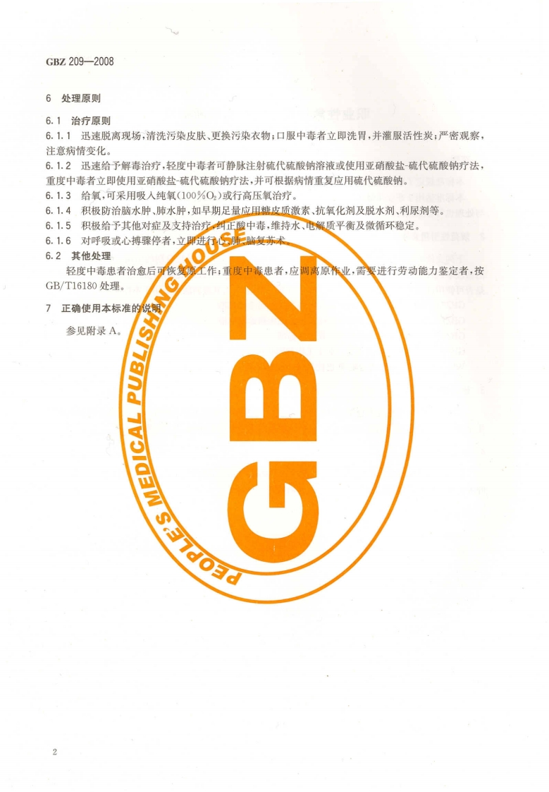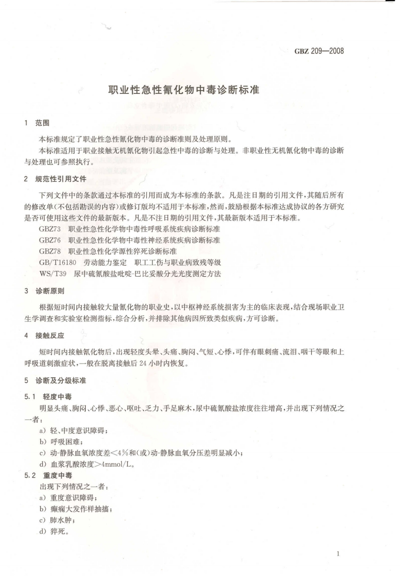 职业性急性氰化物中毒诊断标准Diagnosticcriteriaofoccupationalacutecyanidepoisoning348072@abc6小时前发布关注私信1.26MB6页049职业性急性氰化物中毒诊断标准Diagnosticcriteriaofoccupationalacutecyanidepoisoning此内容为付费资源,请付费后查看¥13¥19黄金会员免费钻石会员免费立即购买您当前未登录!建议登陆后购买,可保存购买订单付费资源 第1页 / 共6页 第2页 / 共6页 第3页 / 共6页 第4页 / 共6页 第5页 / 共6页 试读已结束,还剩1页,您可下载完整版后进行离线阅读 THE END标准规范 文本预览 ICs13.100c60GBZ中华人民共和国国家职业卫生标能GBZ209-2008职业性急性氰化物中毒诊断标准Diagnostic criteria of occupational acute cyanide poisoning2008-06-06发布2008-12-01实施④人民里生典旅融中华人民共和国卫生邻发布 查看更多 收起部分 喜欢就支持一下吧收藏