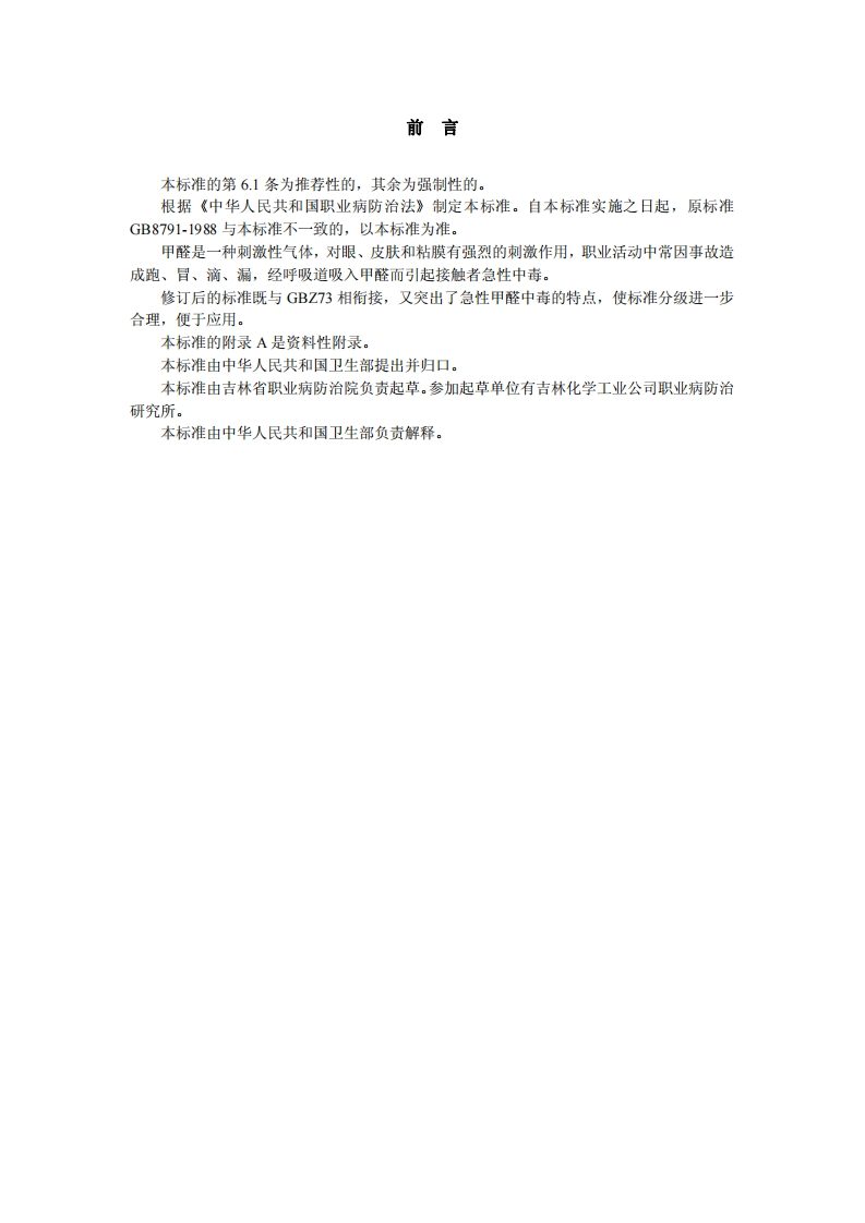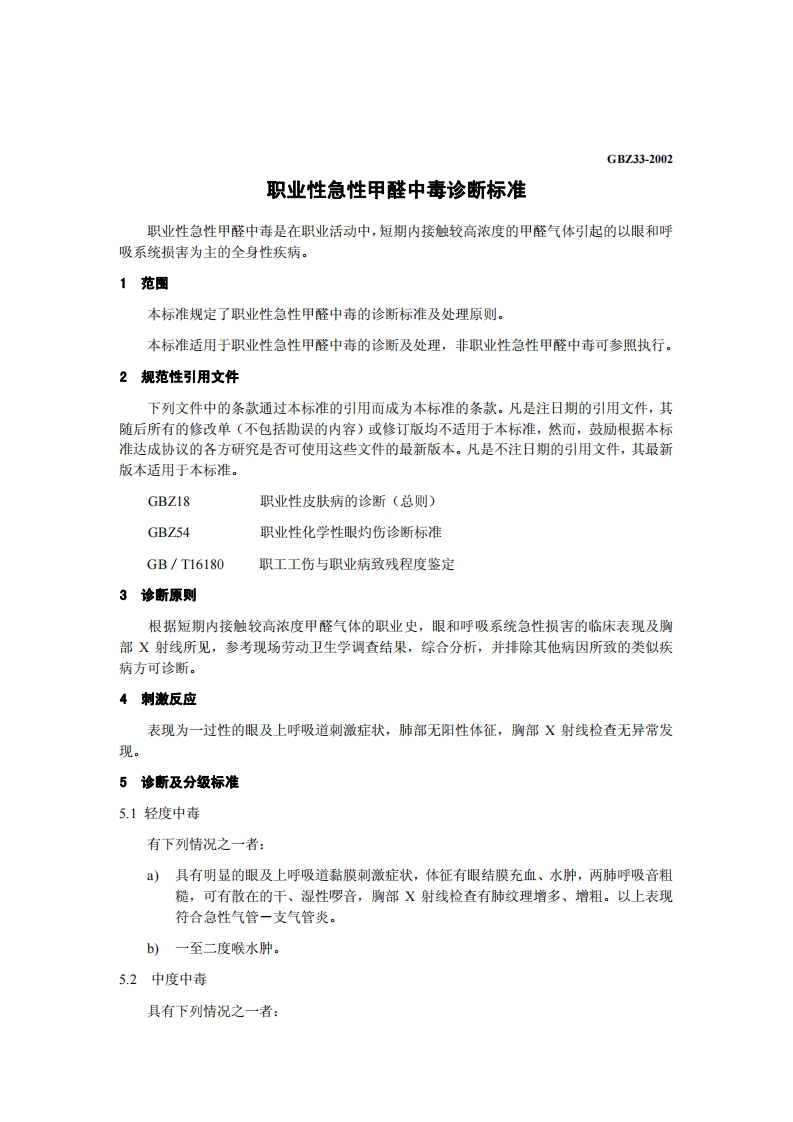 职业性急性甲醛中毒诊断标准DiagnosticCriteriaofOccupationalAcuteFormaldehydePoisoning348072@abc13小时前发布关注私信0.14MB5页037职业性急性甲醛中毒诊断标准DiagnosticCriteriaofOccupationalAcuteFormaldehydePoisoning此内容为付费资源,请付费后查看¥13¥19黄金会员免费钻石会员免费立即购买您当前未登录!建议登陆后购买,可保存购买订单付费资源 第1页 / 共5页 第2页 / 共5页 第3页 / 共5页 第4页 / 共5页 第5页 / 共5页 已完成全部阅读,共5页 THE END标准规范 文本预览 1CS13.100C60GBZ中华人民共和国国家职业卫生标准GBZ33-2002职业性急性甲醛中毒诊断标准Diagnostic Criteria of Occupational Acute Formaldehyde Poisoning2002-04-08发布2002-06-01实施中华人民共和国卫生部发布 查看更多 收起部分 喜欢就支持一下吧收藏