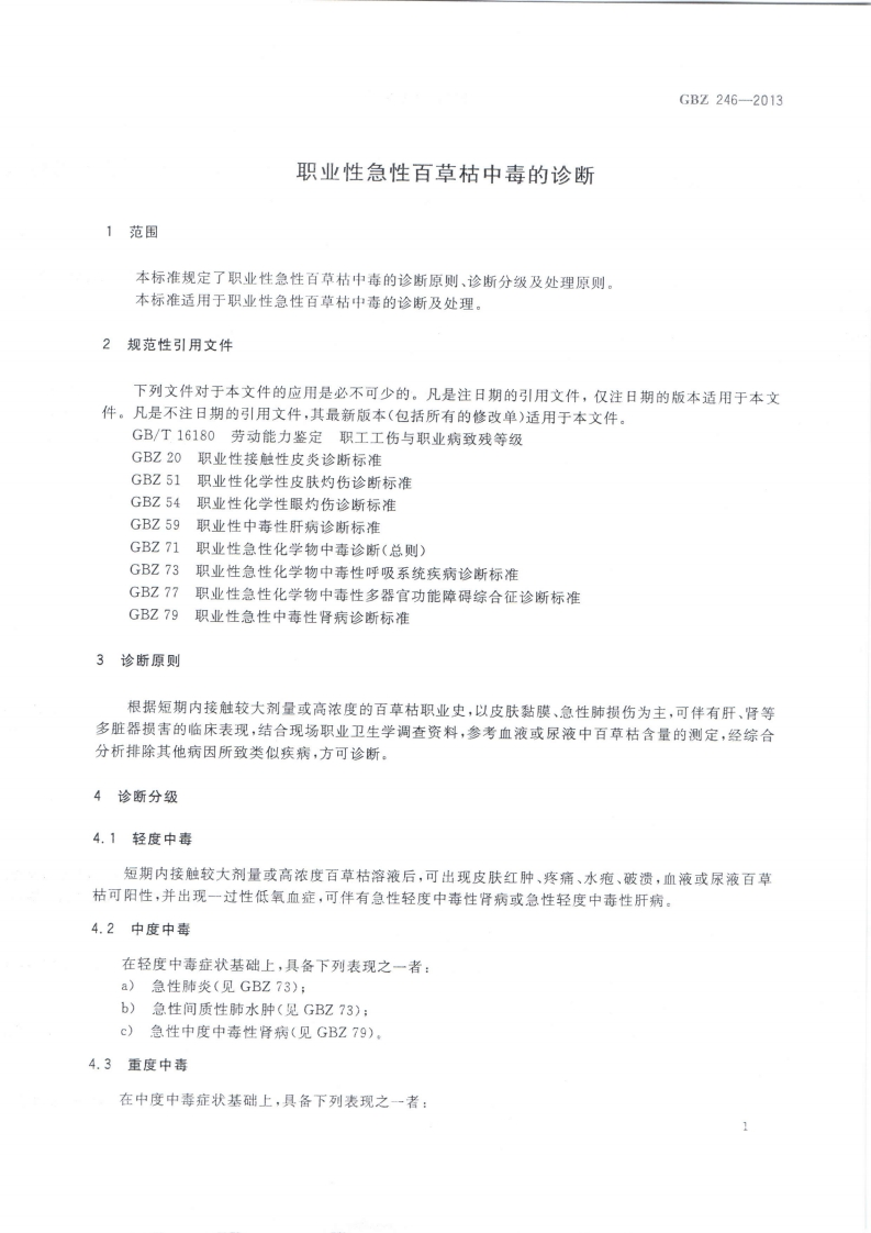 职业性急性百草枯中毒的诊断Diagnosisofoccupationalacuteparaquatpoisoning348072@abc16小时前发布关注私信2.90MB9页043职业性急性百草枯中毒的诊断Diagnosisofoccupationalacuteparaquatpoisoning此内容为付费资源,请付费后查看¥13¥19黄金会员免费钻石会员免费立即购买您当前未登录!建议登陆后购买,可保存购买订单付费资源 第1页 / 共9页 第2页 / 共9页 第3页 / 共9页 第4页 / 共9页 第5页 / 共9页 试读已结束,还剩4页,您可下载完整版后进行离线阅读 THE END标准规范 文本预览 1CS13.100C60GBZ中华人民共和国国家职业卫生标准GBZ246-2013职业性急性百草枯中毒的诊断Diagnosis of occupational acute paraquat poisoning2013-02-07发布2013-08-01实施中华人民共和国卫生邵发布 查看更多 收起部分 喜欢就支持一下吧收藏