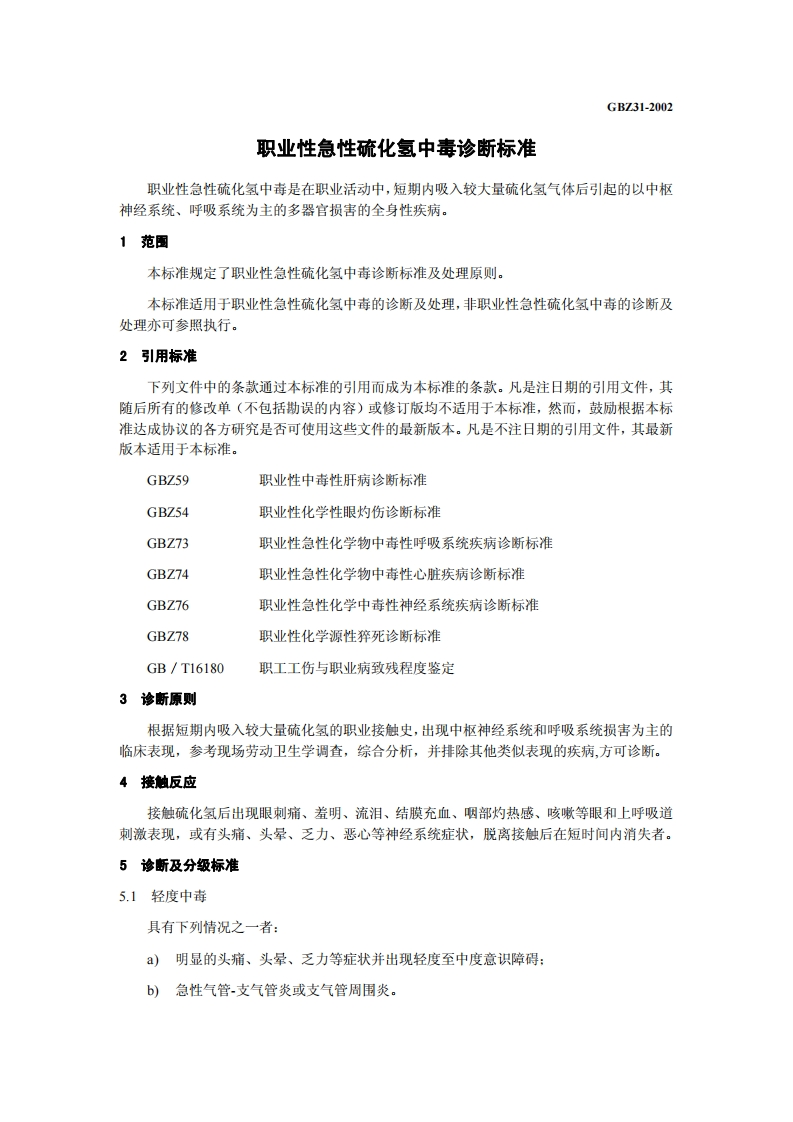 职业性急性硫化氢中毒诊断标准DiagnosticCriteriaofOccupationalAcuteHydrogenSulfidePoisoning348072@abc20小时前发布关注私信0.14MB5页022职业性急性硫化氢中毒诊断标准DiagnosticCriteriaofOccupationalAcuteHydrogenSulfidePoisoning此内容为付费资源,请付费后查看¥13¥19黄金会员免费钻石会员免费立即购买您当前未登录!建议登陆后购买,可保存购买订单付费资源 第1页 / 共5页 第2页 / 共5页 第3页 / 共5页 第4页 / 共5页 第5页 / 共5页 已完成全部阅读,共5页 THE END标准规范 文本预览 1CS13.100C60GBZ中华人民共和国国家职业卫生标准GBZ31-2002职业性急性硫化氢中毒诊断标准Diagnostic Criteria of Occupational Acute Hydrogen Sulfide Poisoning2002-04-08发布2002-06-01实施中华人民共和国卫生部发布 查看更多 收起部分 喜欢就支持一下吧收藏