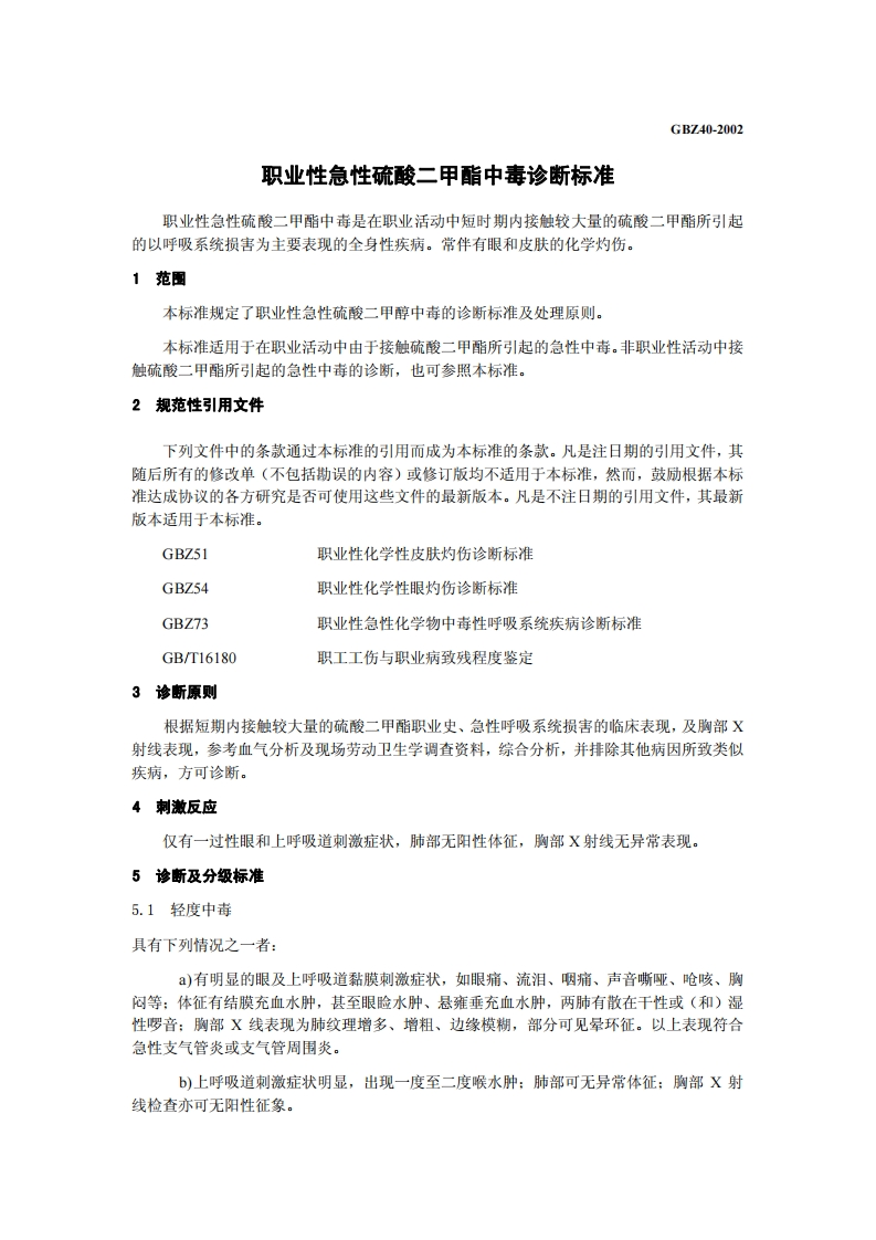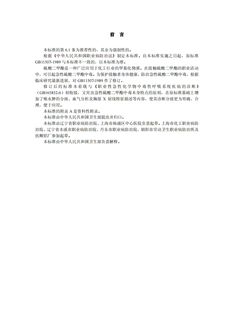 职业性急性硫酸二甲酯中毒诊断标准DiagnosticCriteriaofOccupationalAcuteDimethylSulfatePoisoning348072@abc22小时前发布关注私信0.14MB6页023职业性急性硫酸二甲酯中毒诊断标准DiagnosticCriteriaofOccupationalAcuteDimethylSulfatePoisoning此内容为付费资源,请付费后查看¥13¥19黄金会员免费钻石会员免费立即购买您当前未登录!建议登陆后购买,可保存购买订单付费资源 第1页 / 共6页 第2页 / 共6页 第3页 / 共6页 第4页 / 共6页 第5页 / 共6页 试读已结束,还剩1页,您可下载完整版后进行离线阅读 THE END标准规范 文本预览 1CS13.100C60GBZ中华人民共和国国家职业卫生标准GBZ40-2002职业性急性硫酸二甲酯中毒诊断标准Diagnostic Criteria of Occupational Acute Dimethyl Sulfate Poisoning2002-04-08发布2002-06-01实施中华人民共和国卫生部发布 查看更多 收起部分 喜欢就支持一下吧收藏