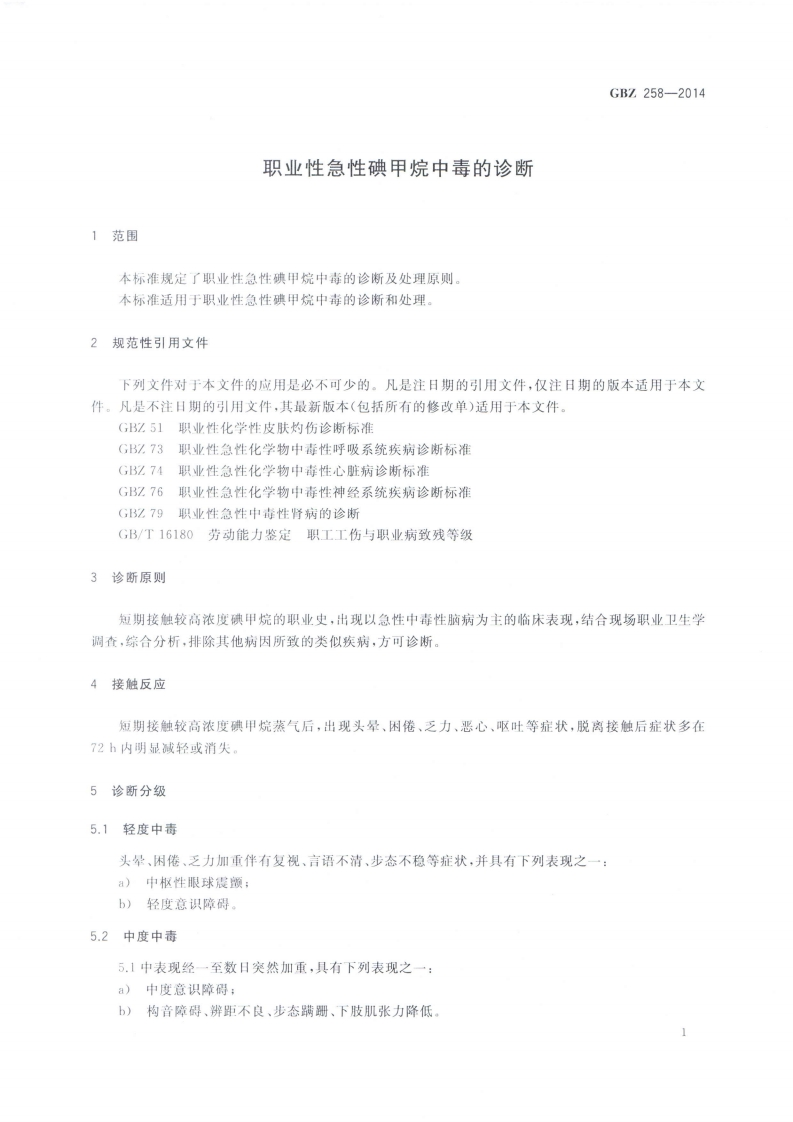 职业性急性碘甲烷中毒的诊断Diagnosisofoccupationalacutemethyliodidepoisoning348072@abc23小时前发布关注私信4.50MB5页037职业性急性碘甲烷中毒的诊断Diagnosisofoccupationalacutemethyliodidepoisoning此内容为付费资源,请付费后查看¥13¥19黄金会员免费钻石会员免费立即购买您当前未登录!建议登陆后购买,可保存购买订单付费资源 第1页 / 共5页 第2页 / 共5页 第3页 / 共5页 第4页 / 共5页 第5页 / 共5页 已完成全部阅读,共5页 THE END标准规范 文本预览 1CS13.100C60B☑中华人民共和国国家职业卫生标准GBZ258-2014职业性急性碘甲烷中毒的诊断Diagnosis of occupational acute methyl iodide poisoning2014-10-13发布2015-03-01实施中华人民共和国国家卫生和计划生育委员会发布 查看更多 收起部分 喜欢就支持一下吧收藏