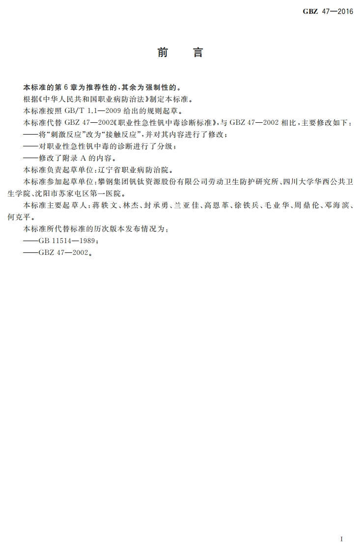 职业性急性钒中毒的诊断Diagnosisofoccupationalacutevanadiumpoisoning348072@abc昨天发布关注私信0.32MB5页031职业性急性钒中毒的诊断Diagnosisofoccupationalacutevanadiumpoisoning此内容为付费资源,请付费后查看¥13¥19黄金会员免费钻石会员免费立即购买您当前未登录!建议登陆后购买,可保存购买订单付费资源 第1页 / 共5页 第2页 / 共5页 第3页 / 共5页 第4页 / 共5页 第5页 / 共5页 已完成全部阅读,共5页 THE END标准规范 文本预览 1CS13.100C60GBZ中华人民共和国国家职业卫生标准GBZ47-2016代替GBZ47一2002职业性急性钒中毒的诊断Diagnosis of occupational acute vanadium poisoning2016-08-23发布2017-02-01实施中华人民共和国国家卫生和计划生育委员会发布 查看更多 收起部分 喜欢就支持一下吧收藏